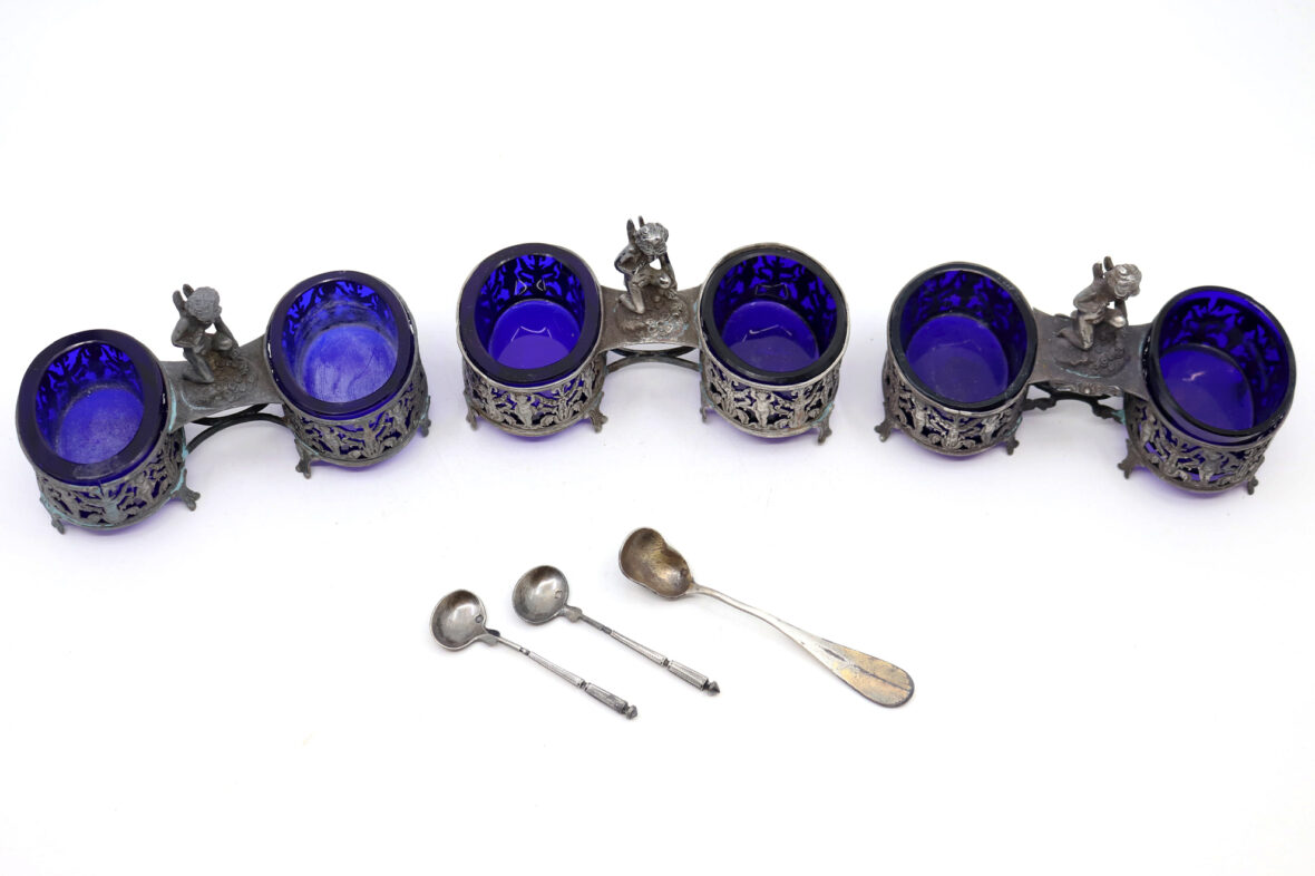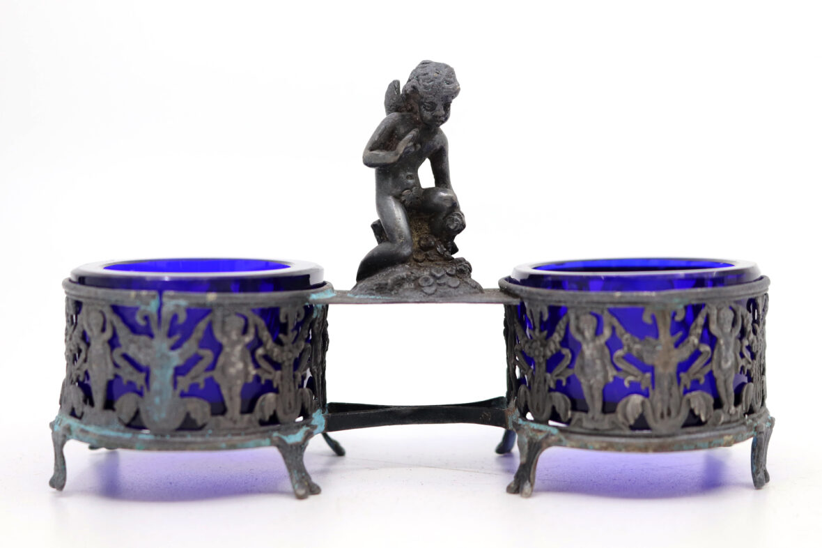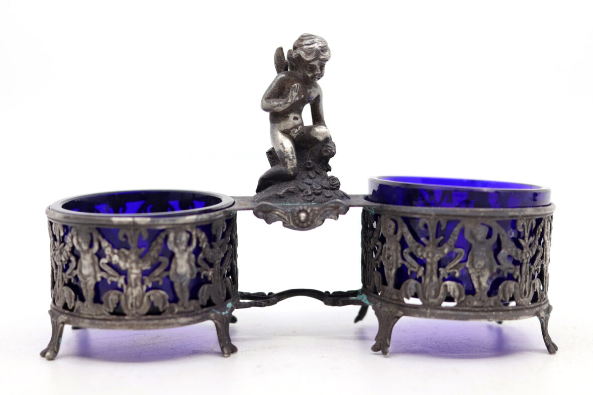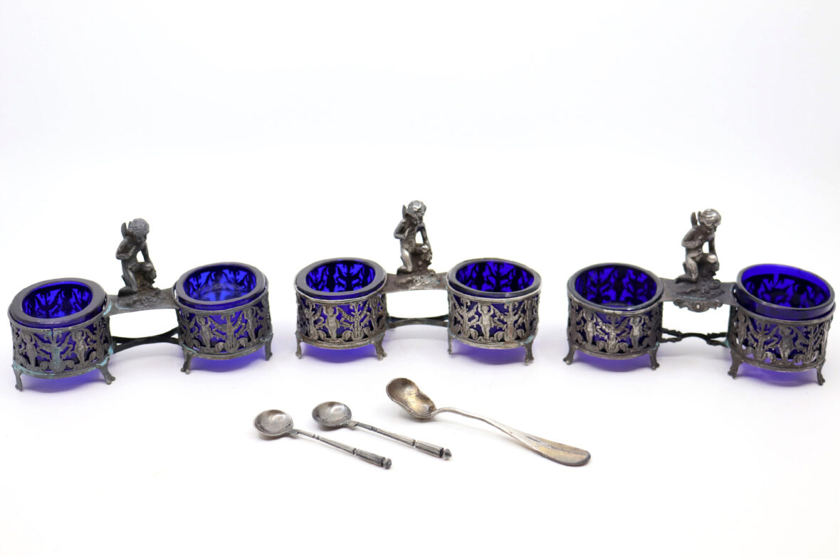Ensemble de trois salerons doubles en argent à décor ajouré de putti soutenant une guirlande de fleurs, alternés de motifs végétaux. La prise formée d’un Amour agenouillé. Intérieurs en verre bleu.