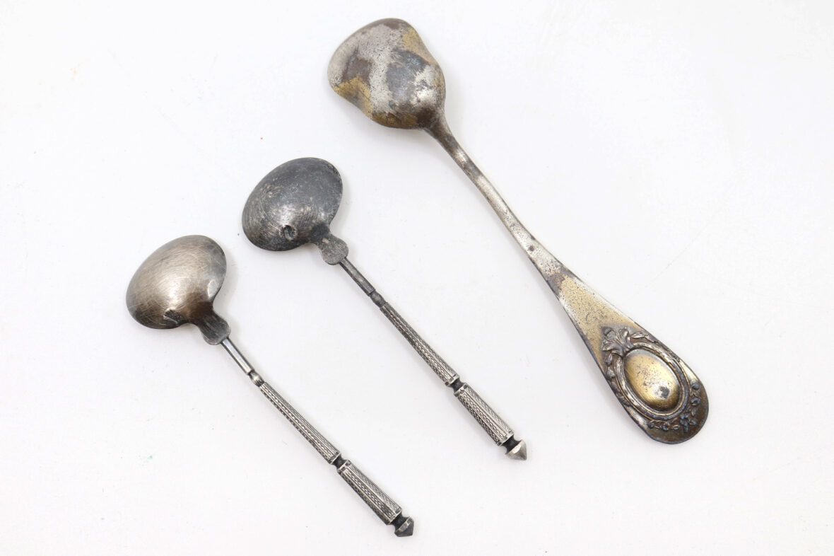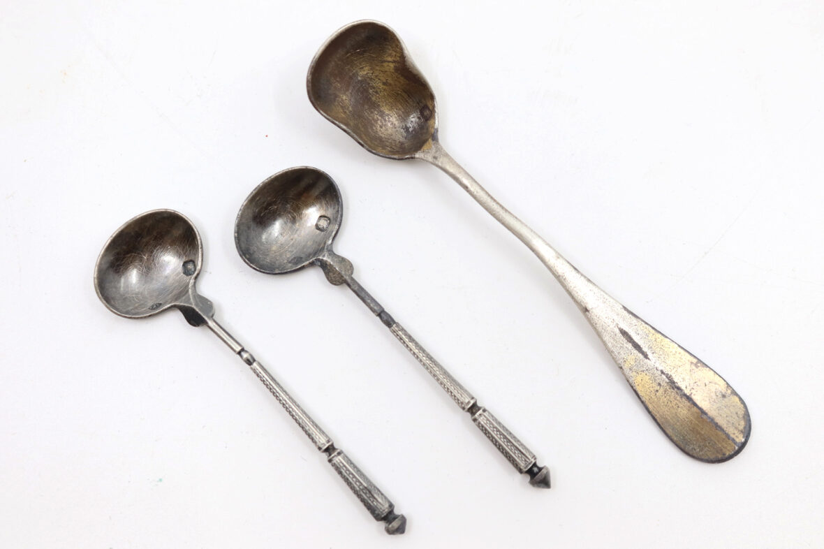 On y joint deux petits cuillerons en argent (Poids : 10,9 g) et un en métal argenté.