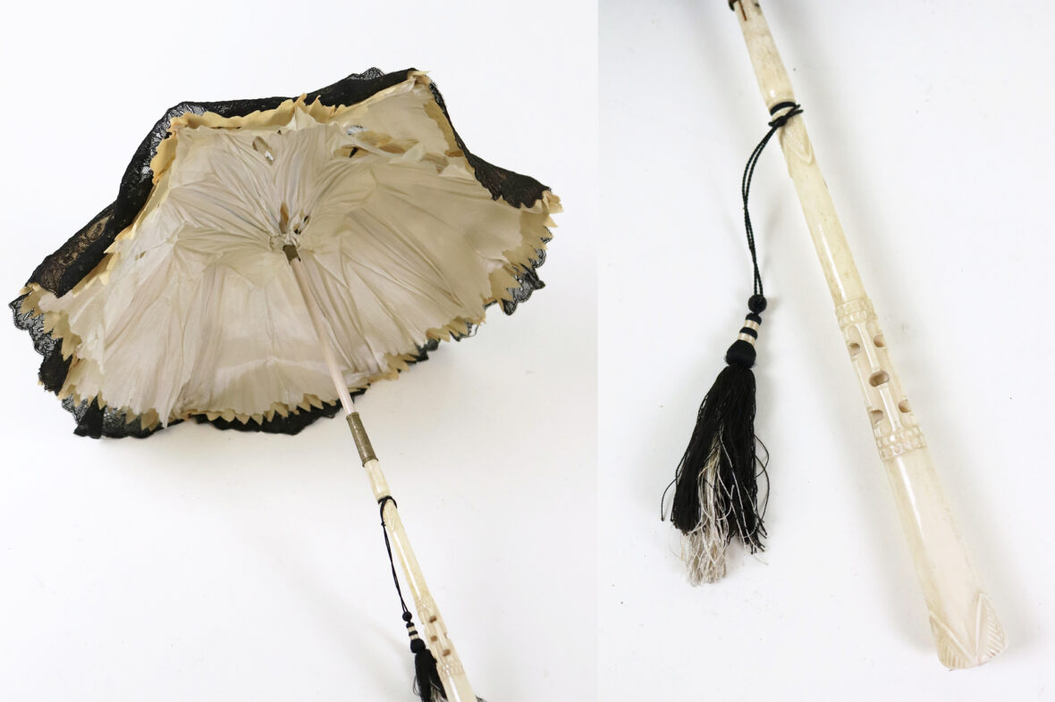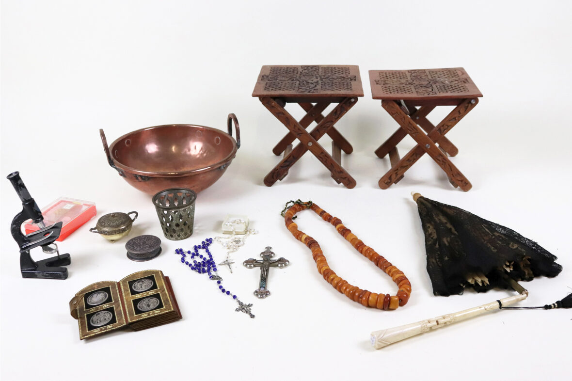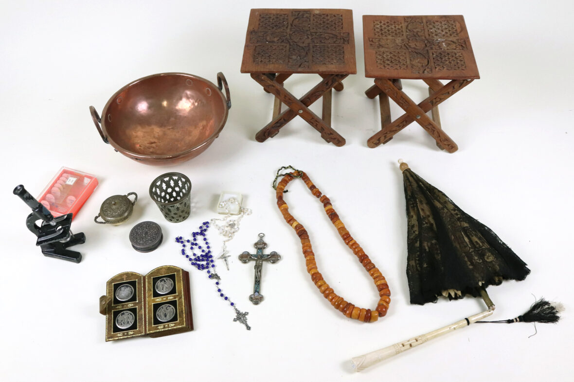 Ensemble divers comprenant notamment une bassine en cuivre, un petit microscope, deux petits tabourets pliants en bois, un pot à crayons en bronze ajouré, un sautoir en perles imitant l’ambre, chapelets, une ombrelle ancienne ornée de dentelle noire, etc.