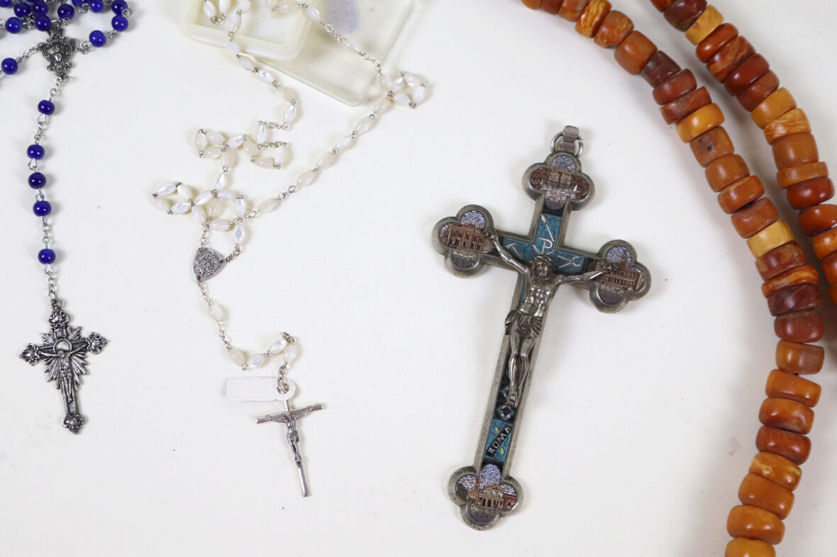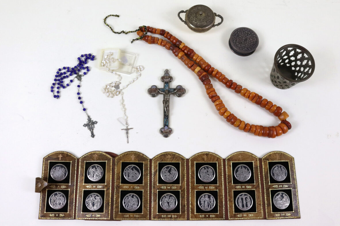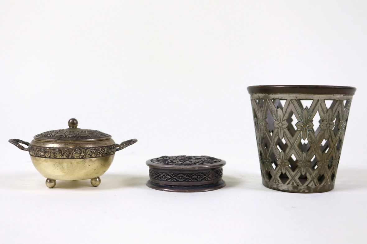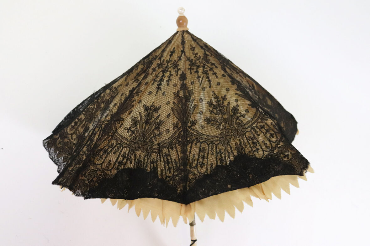 Ensemble divers comprenant notamment une bassine en cuivre, un petit microscope, deux petits tabourets pliants en bois, un pot à crayons en bronze ajouré, un sautoir en perles imitant l’ambre, chapelets, une ombrelle ancienne ornée de dentelle noire, etc.