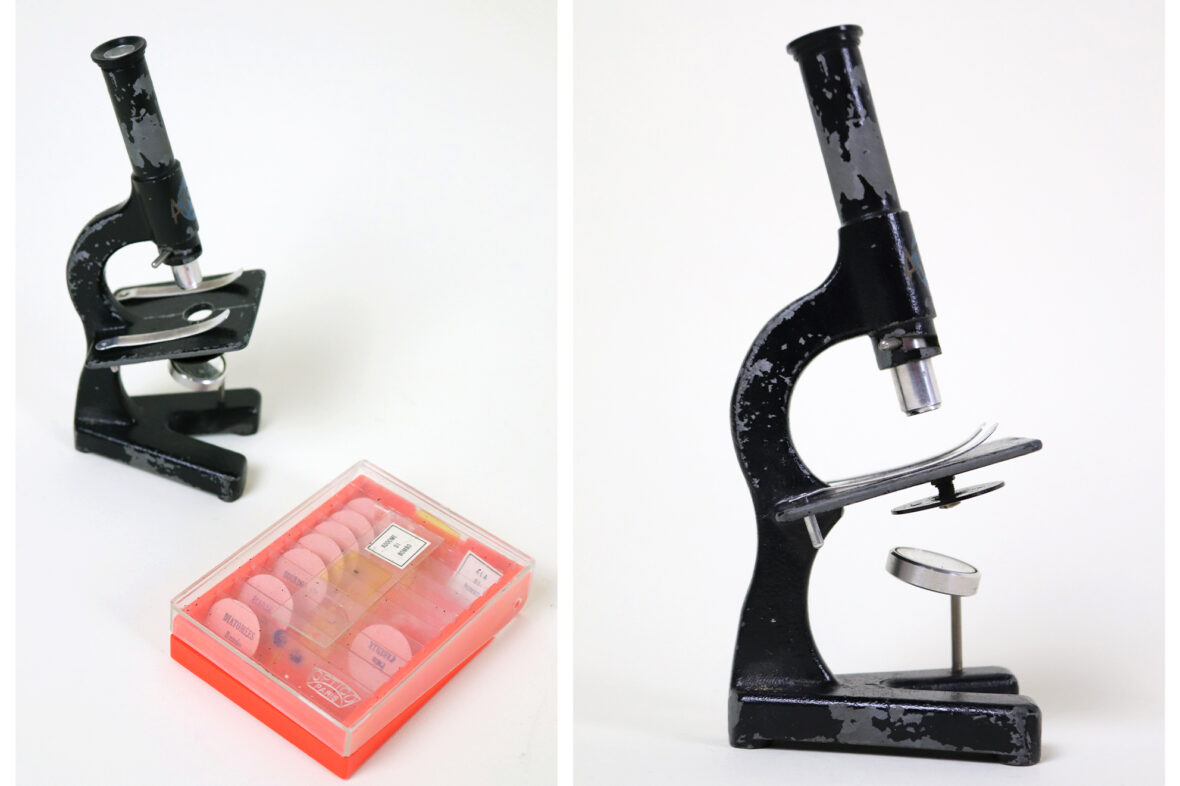 Ensemble divers comprenant notamment une bassine en cuivre, un petit microscope,