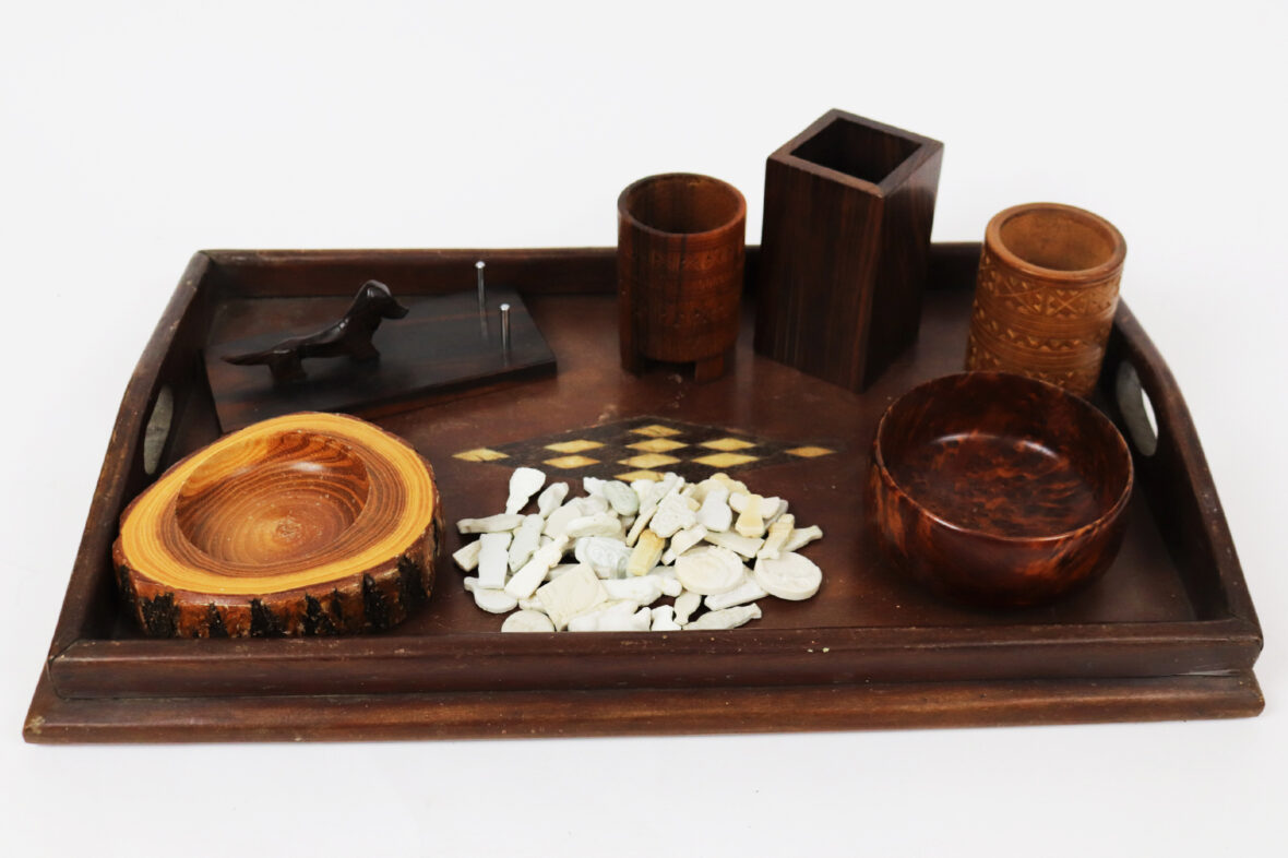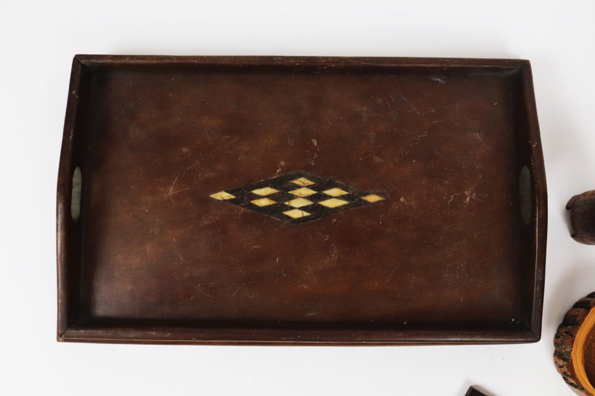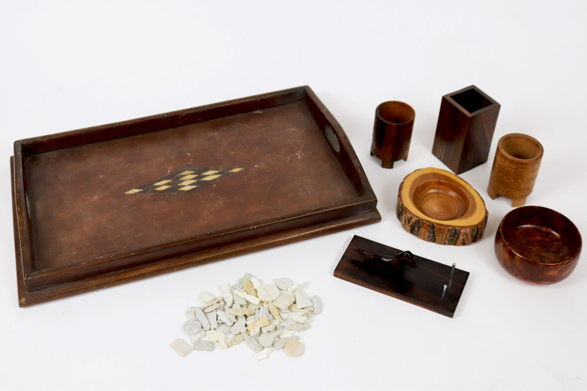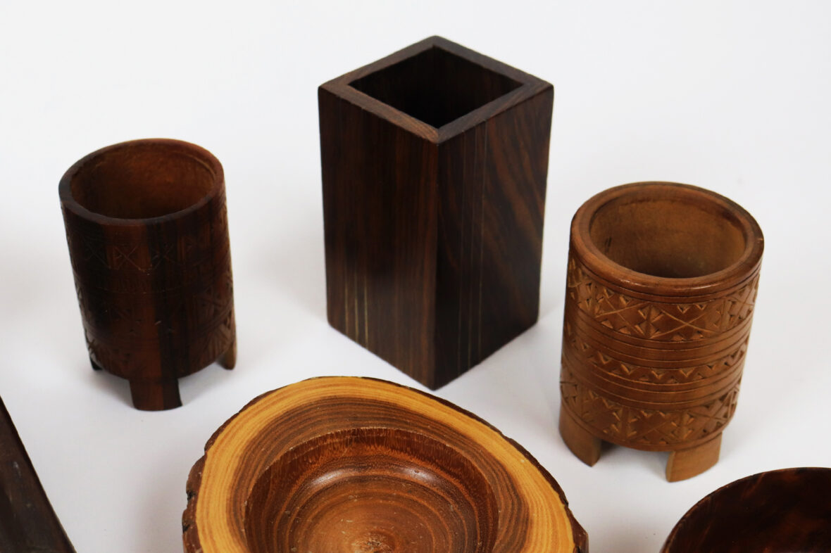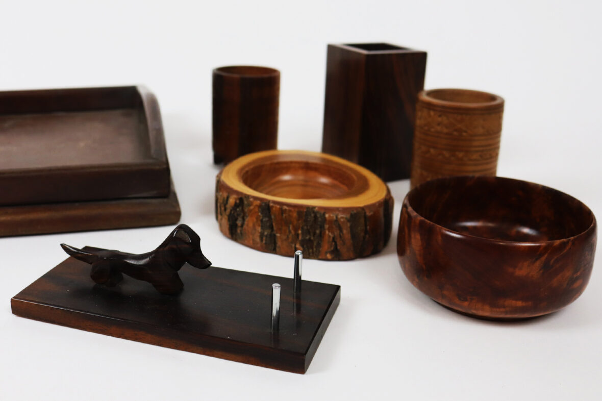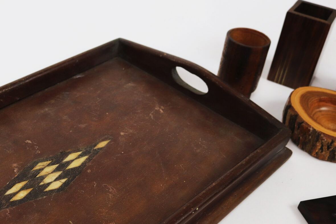 Ensemble divers en bois comprenant un plateau de service, trois pots, deux vide-poches, etc.