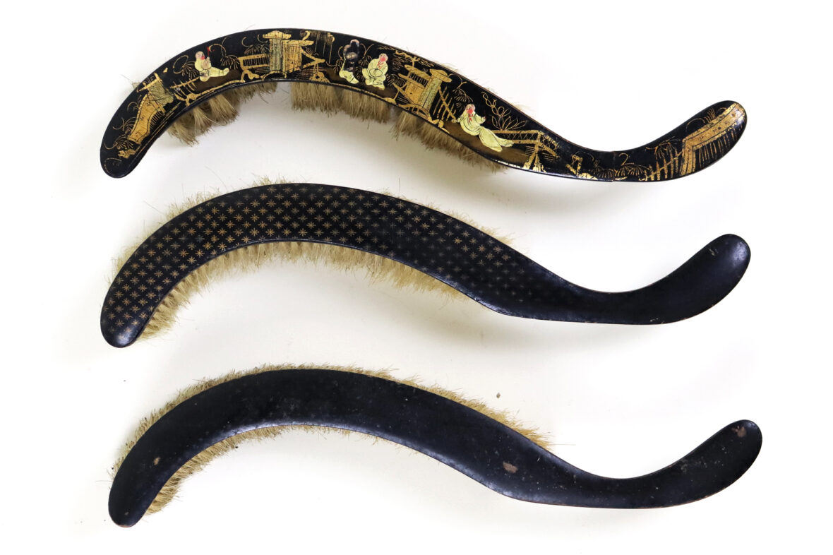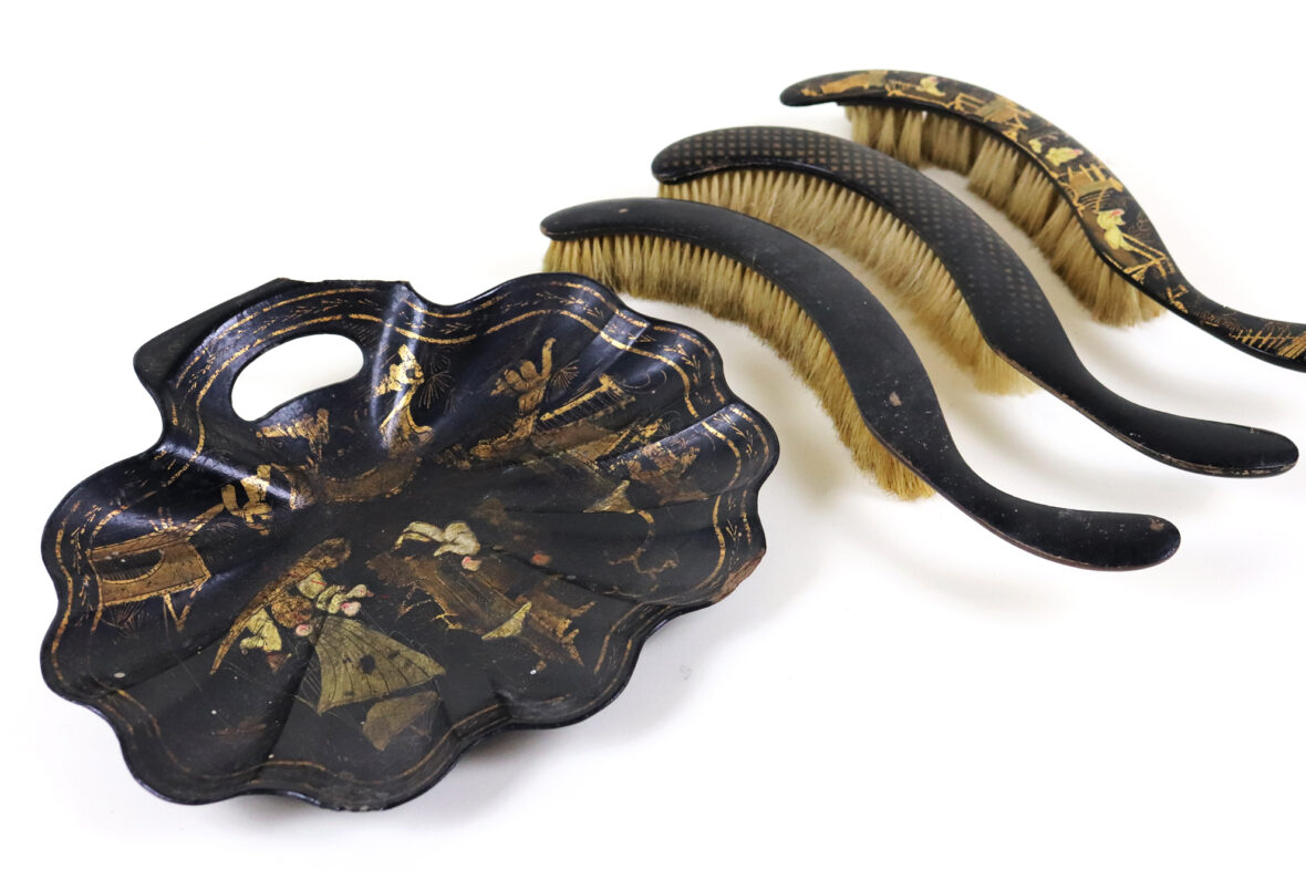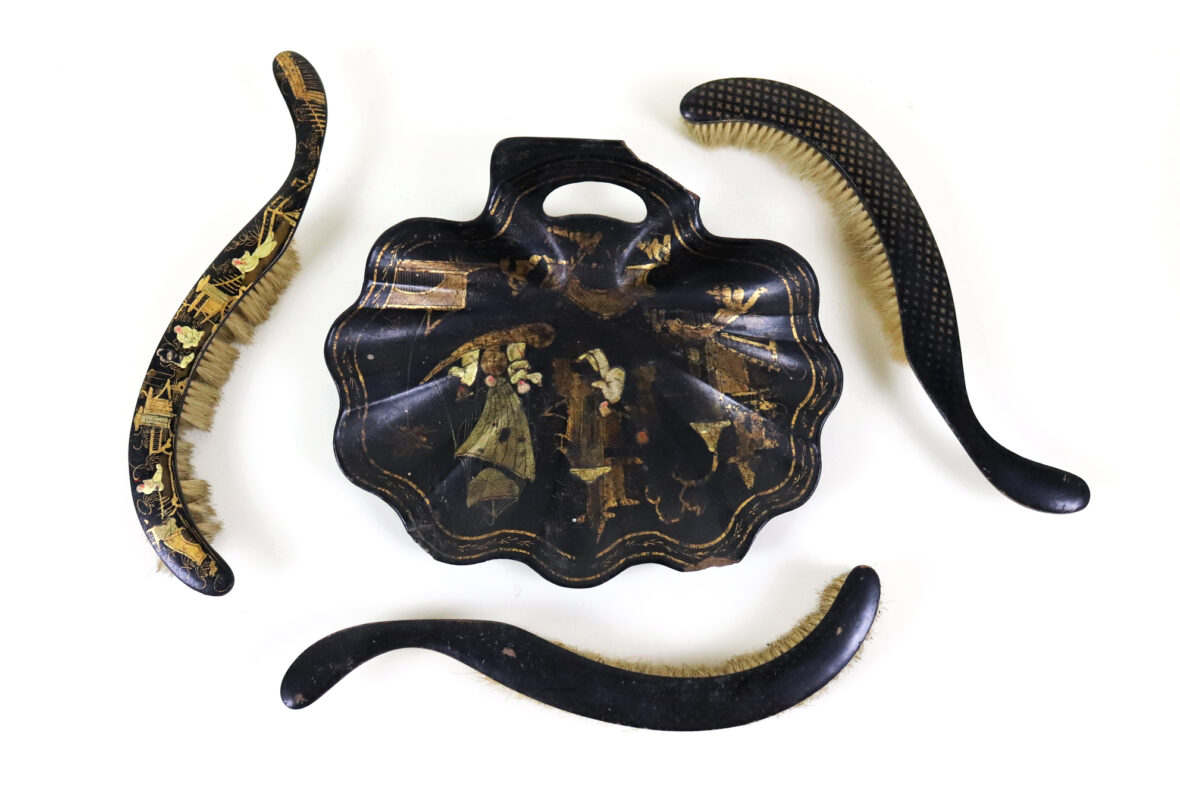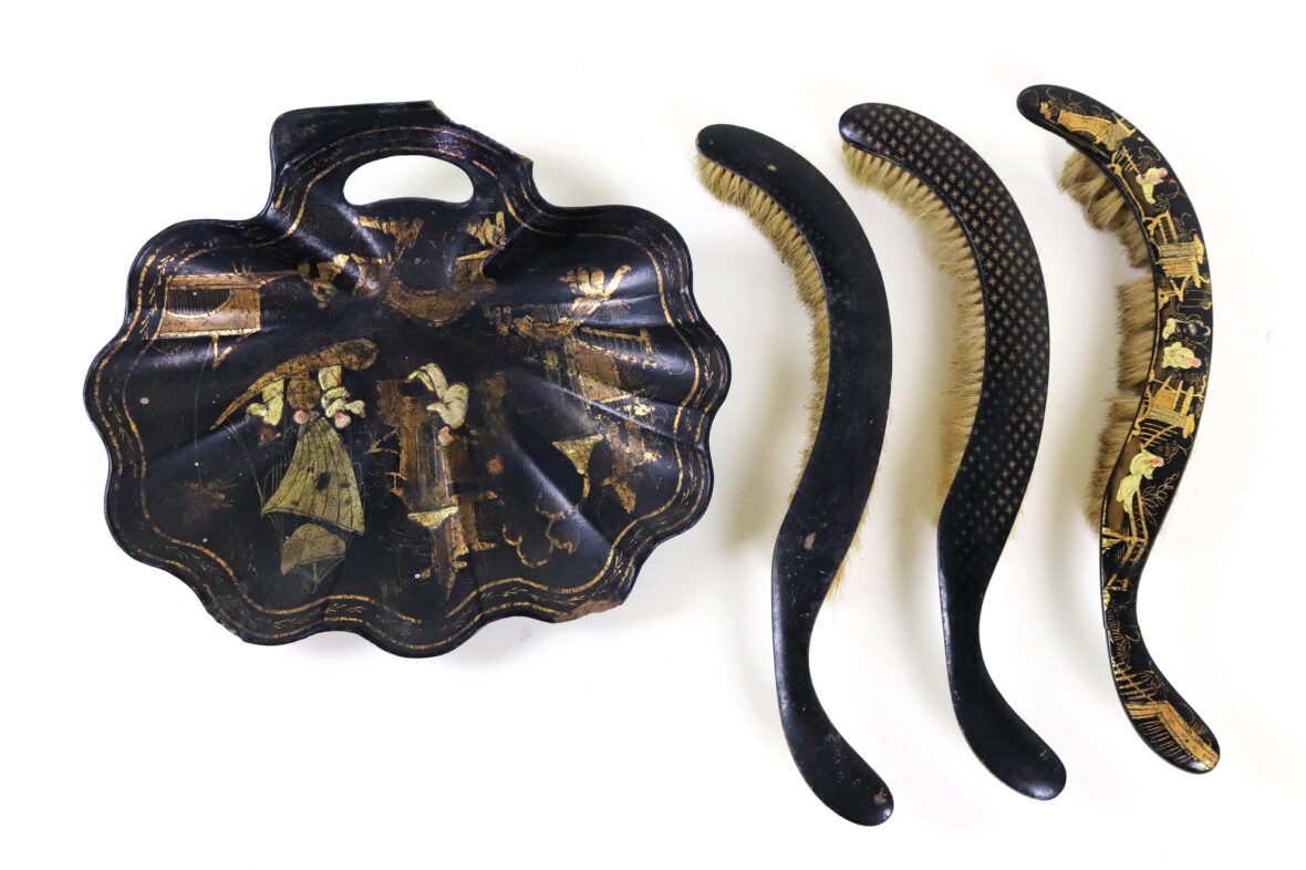 Ensemble en carton bouilli et bois laqué noir à décor extrême-oriental comprenant une brosse ramasse-miettes et une pelle en forme de coquille.