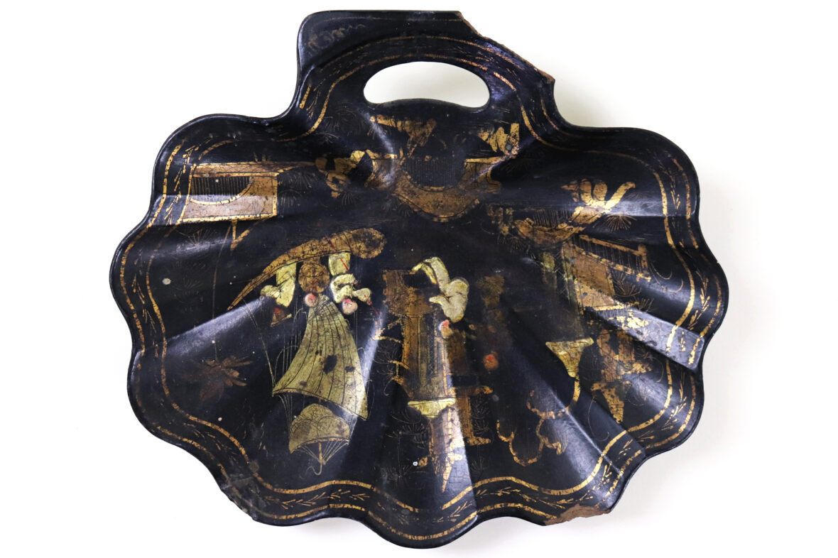 Ensemble en carton bouilli et bois laqué noir à décor extrême-oriental comprenant une brosse ramasse-miettes et une pelle en forme de coquille.