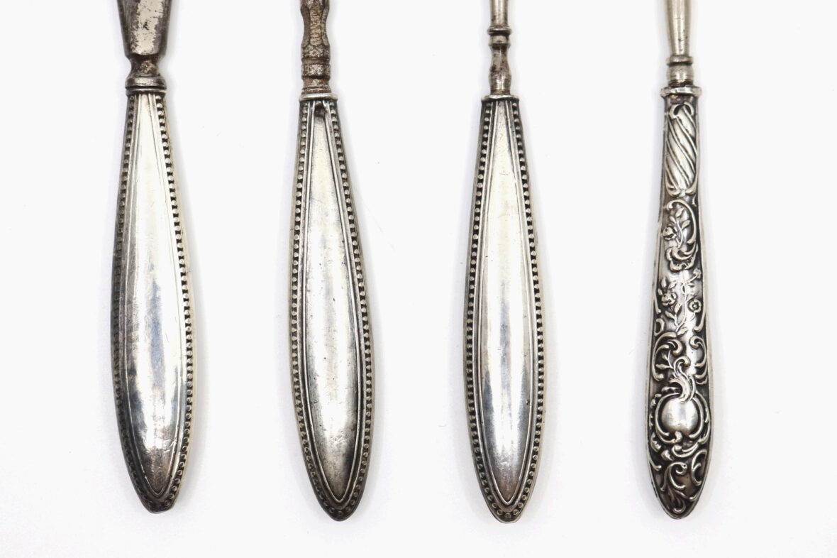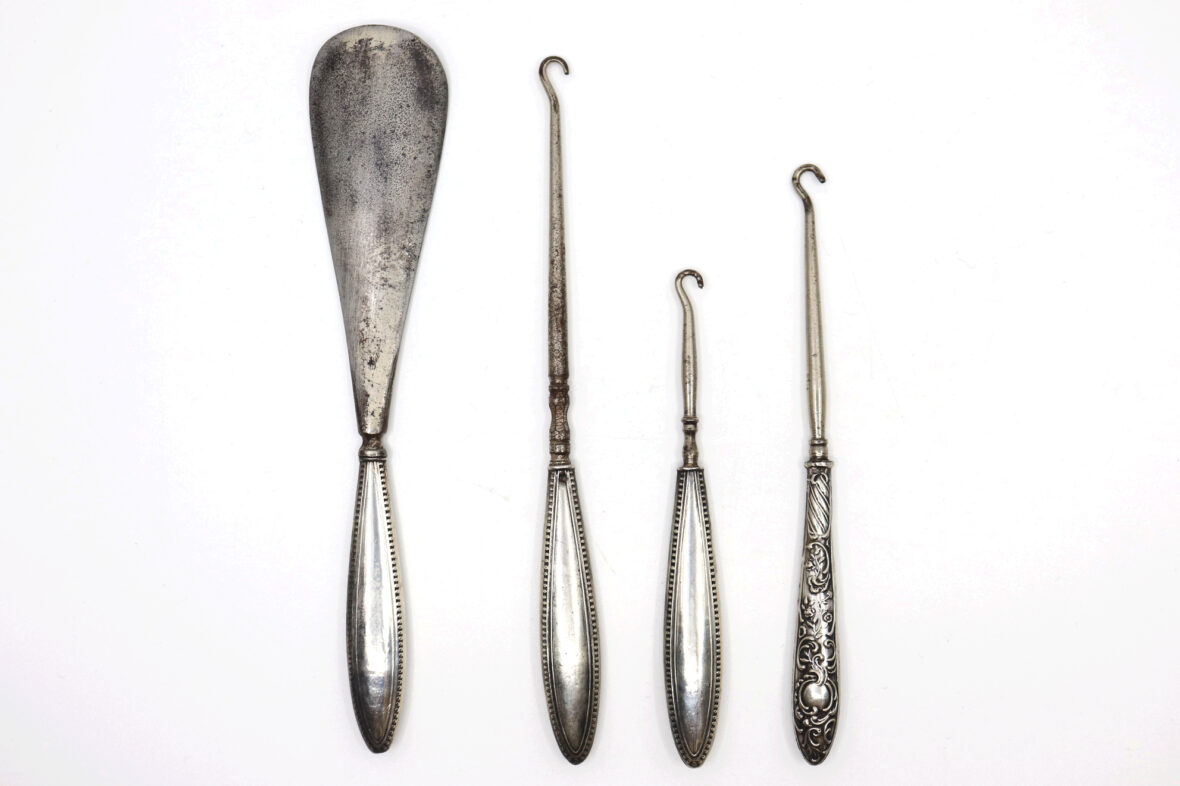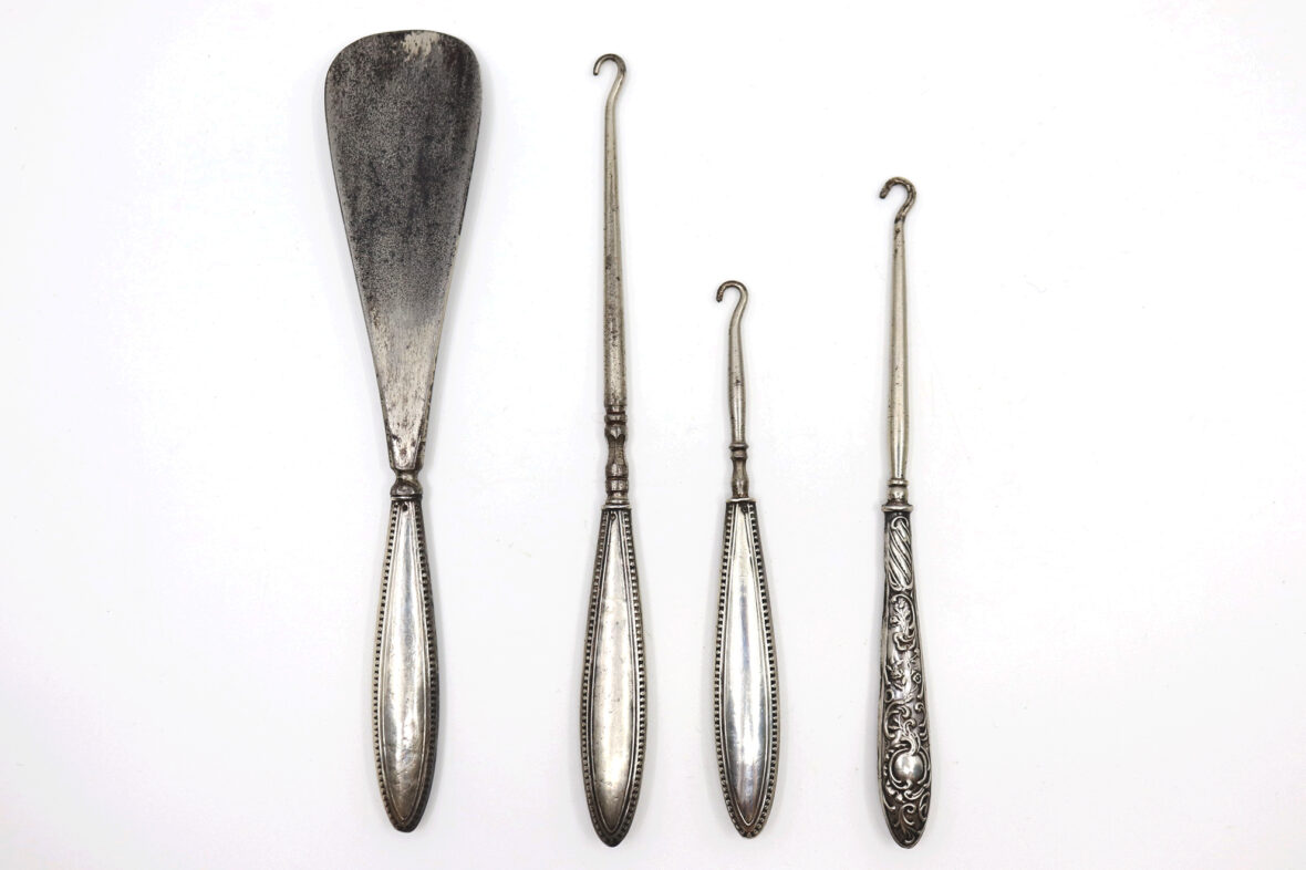 Ensemble en métal argenté comprenant 3 crochets à lacet et un chausse-pied.
