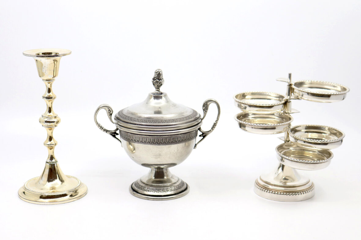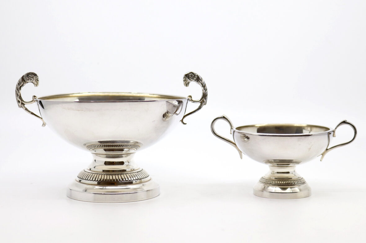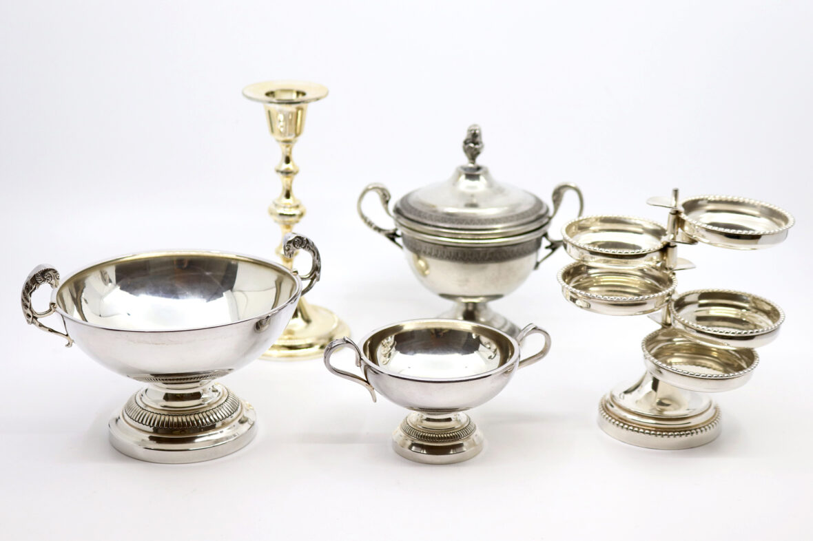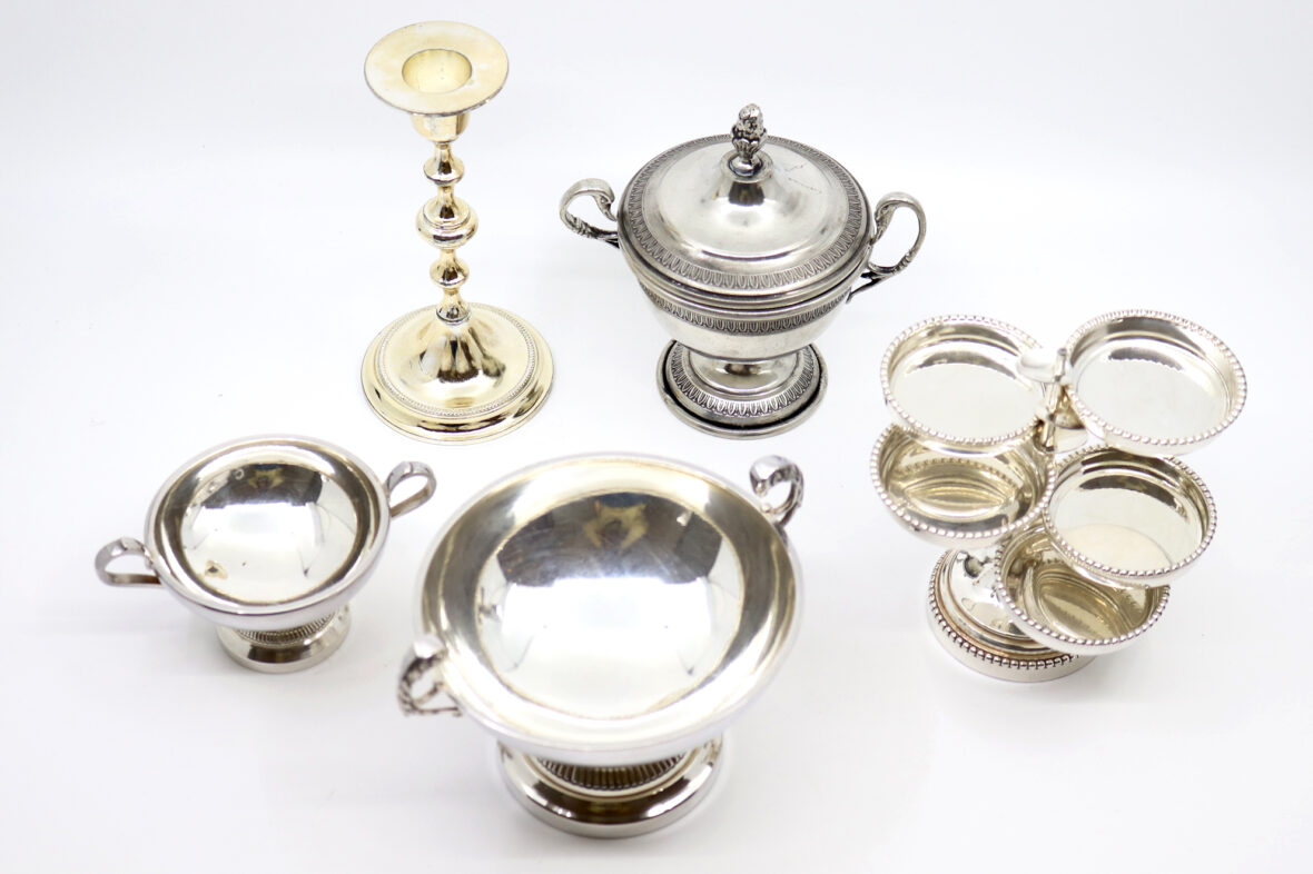 Ensemble en métal argenté comprenant deux coupes sur piédouche à décor de frise de godrons, un bougeoir de forme balustre à décor de frise de godrons sur le pied et un présentoir à cendriers de table à décor de frise de perles (5 cendriers).