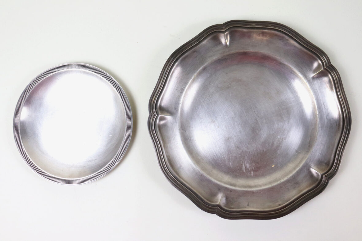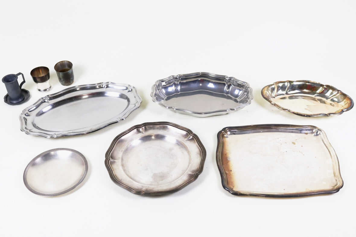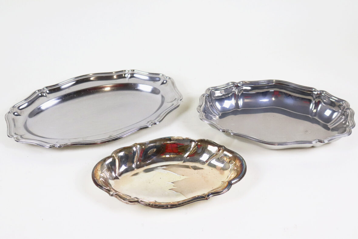 Ensemble en métal argenté comprenant trois plats oblongs à bords chantournés, un plat rond, un plat rectangulaire, une assiette, un vide-poche, deux timbales et une mesure en étain.