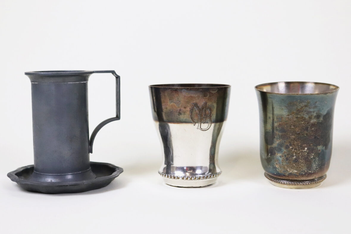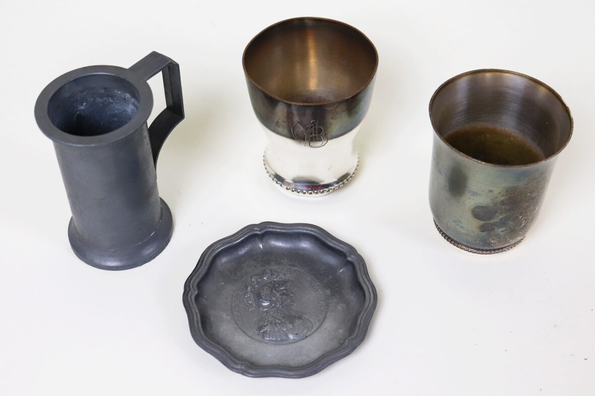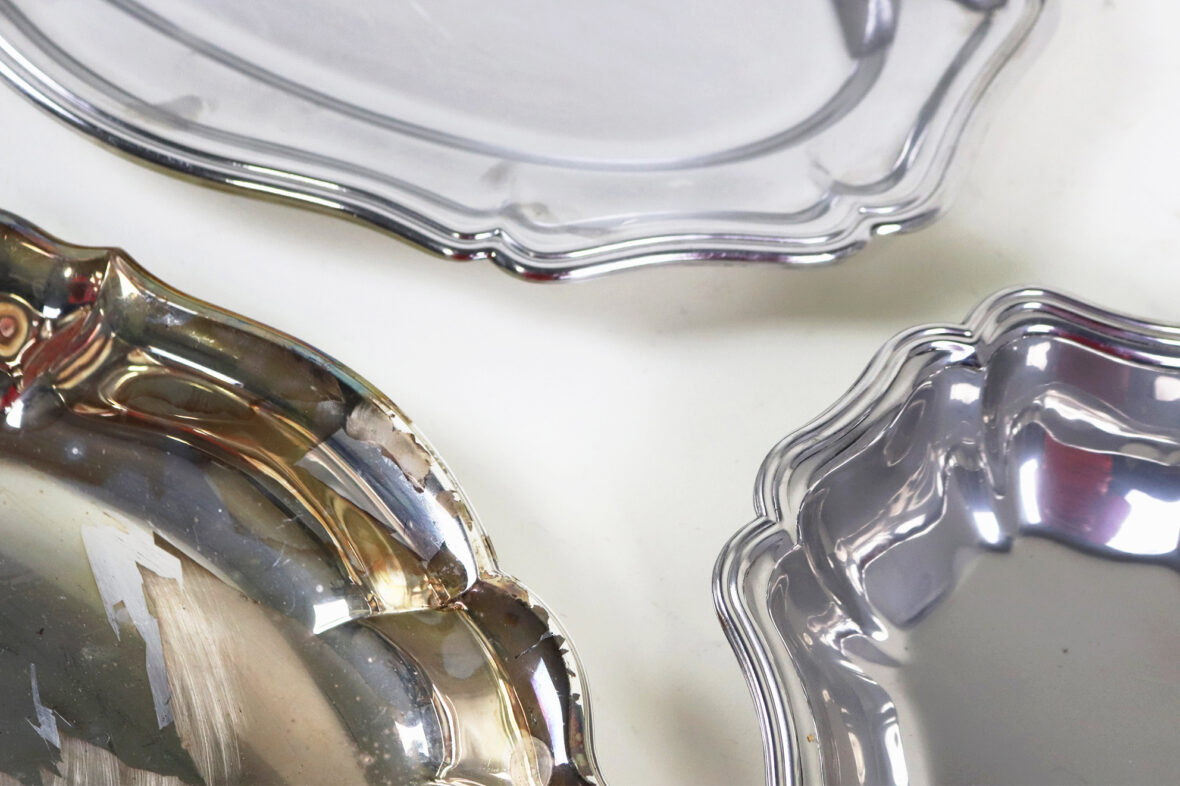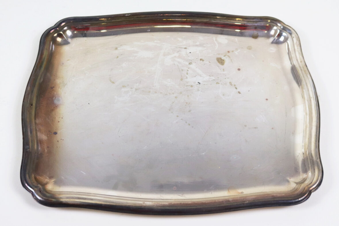 Ensemble en métal argenté comprenant trois plats oblongs à bords chantournés, un plat rond, un plat rectangulaire, une assiette, un vide-poche, deux timbales et une mesure en étain.