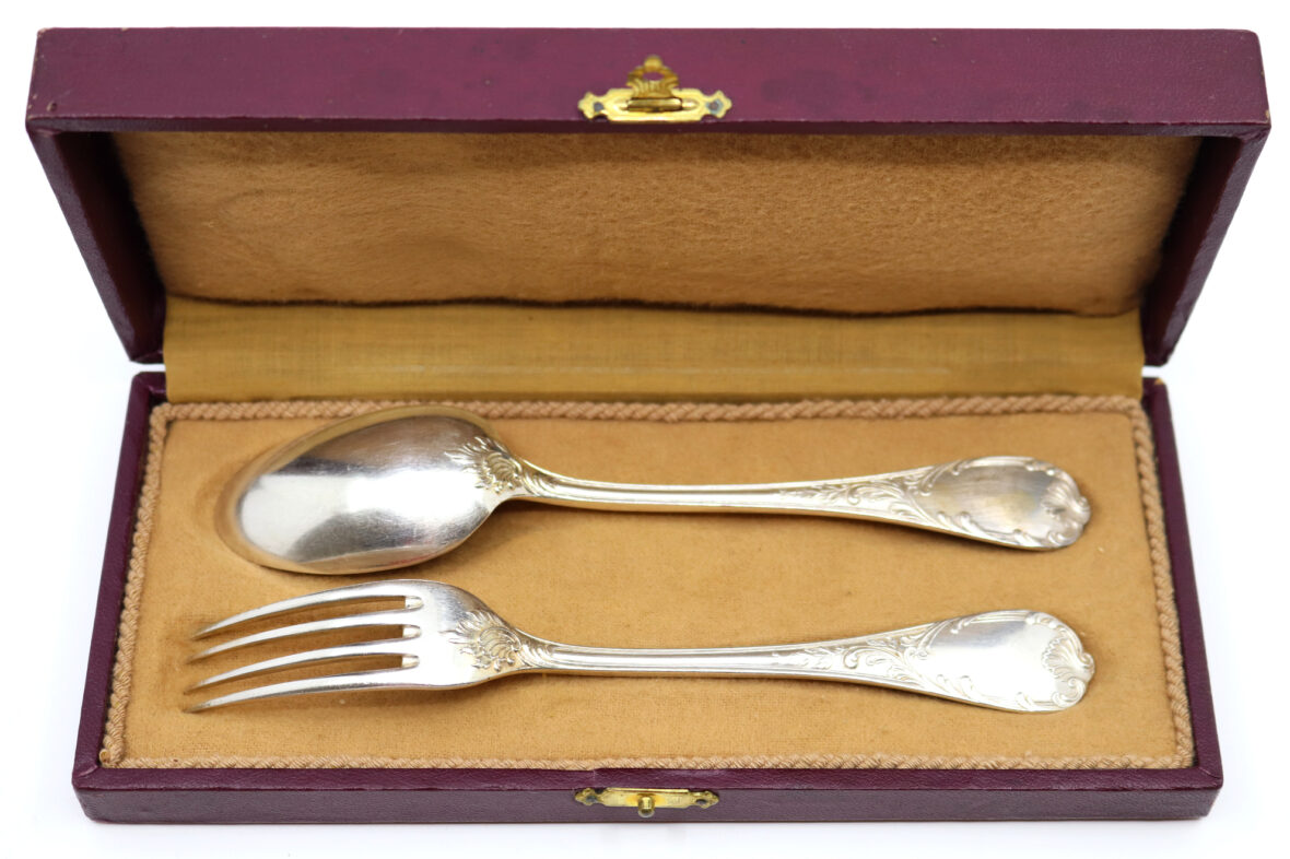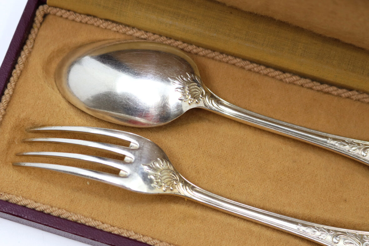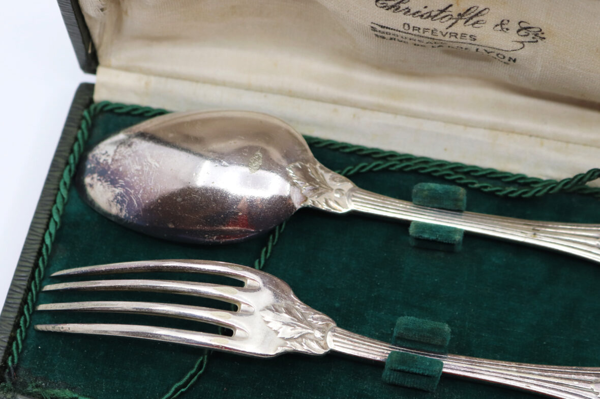 – un couvert de baptême à décor de feuillages et coquille. Par CHRISTOFLE. Dans son écrin.