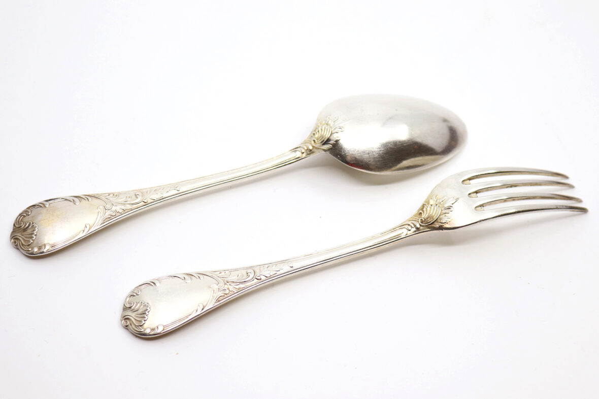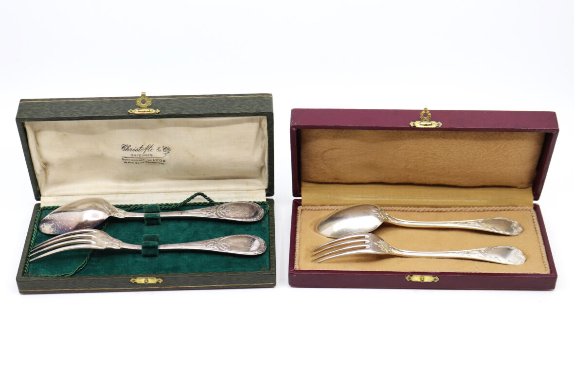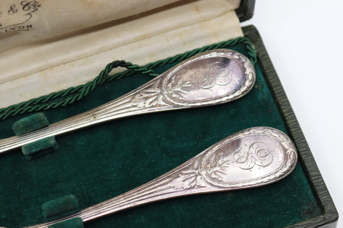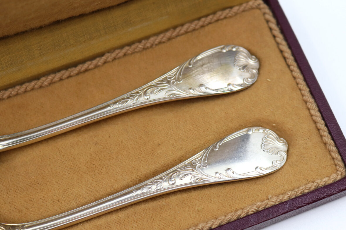 – un couvert de baptême à décor de feuillages et coquille. Par CHRISTOFLE. Dans son écrin.