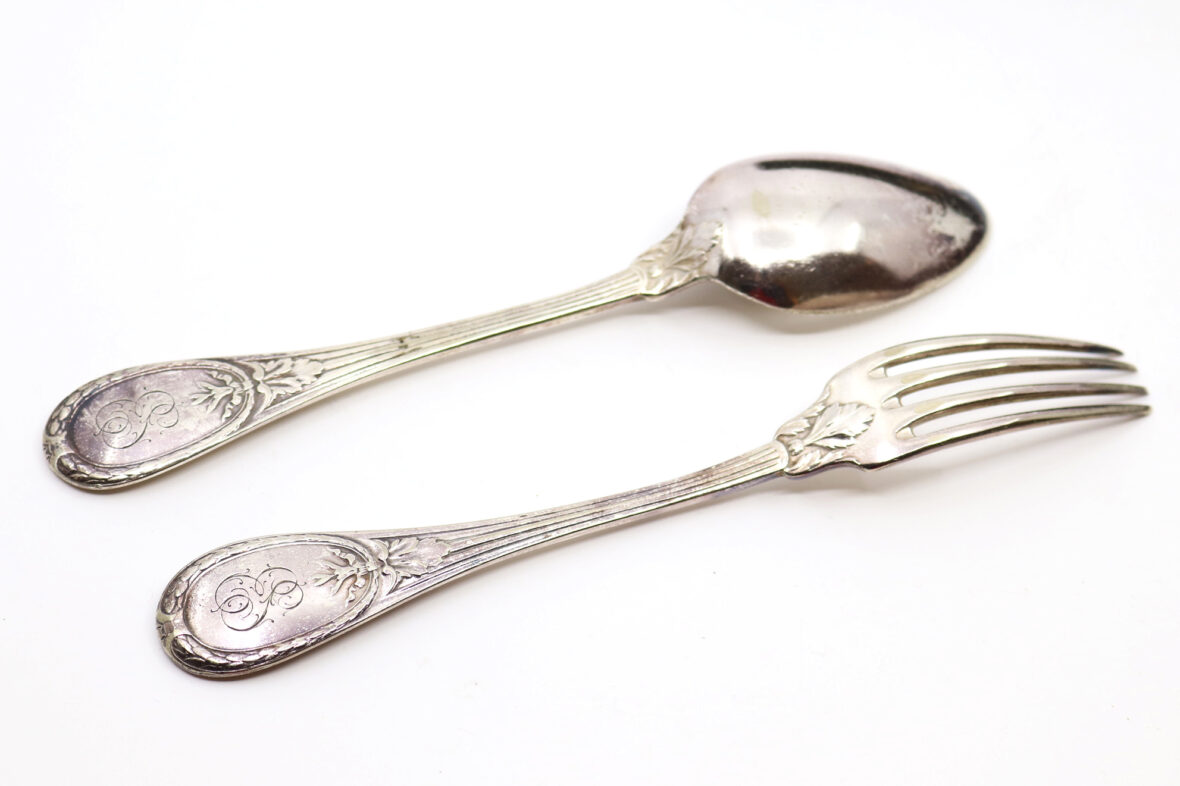 – un couvert de baptême à décor de cannelures et médaillon chiffré ES. Par CHRISTOFLE. Dans son écrin.