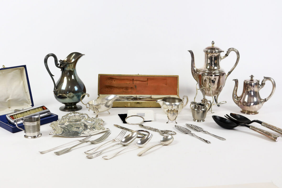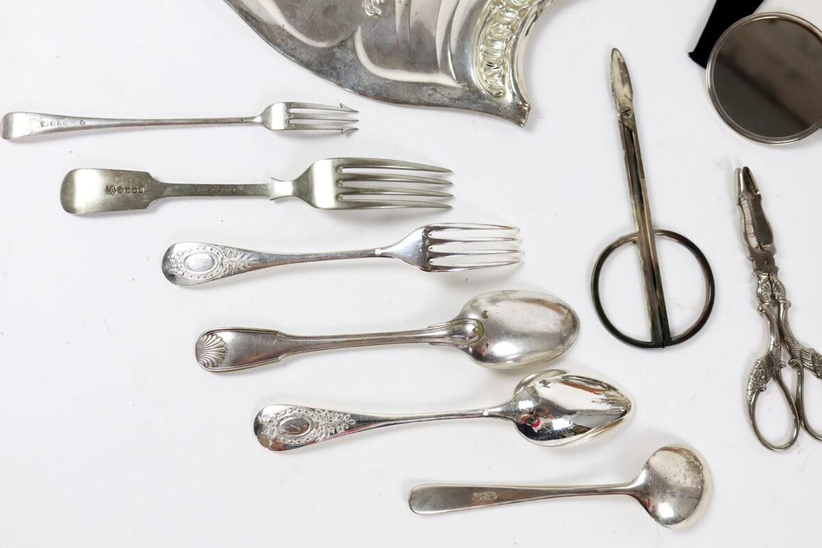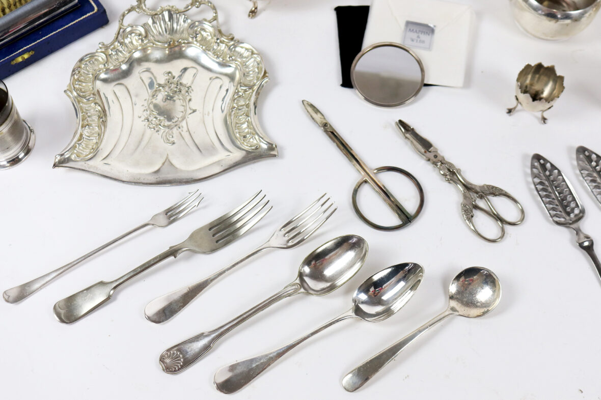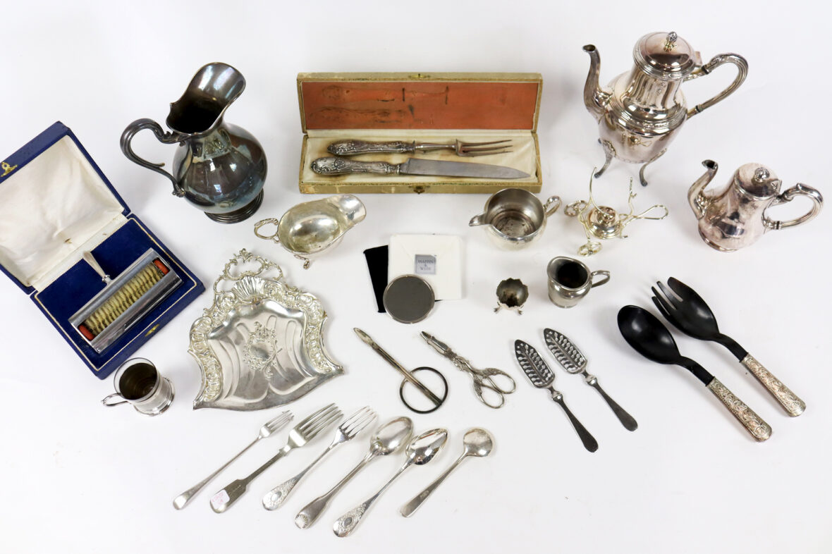 Un petit miroir rond de poche Mappin & Webb, une carafe Christofle, une théière et une cafetière, un ramasse miette de table et une pelle, un chauffe fine brûleur réchauffeur, un coquetier à pattes d’oiseaux, un couvert à salade, une saucière, deux petits pots à lait, une tasse avec contenant en verre, un service à gigot dans son étui, deux cuillères à absinthe, une paire de ciseaux Christofle, une paire de ciseaux à sucre, et un lot de trois cuillères et trois fourchettes.
