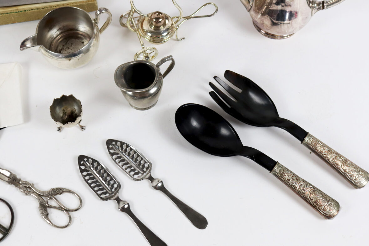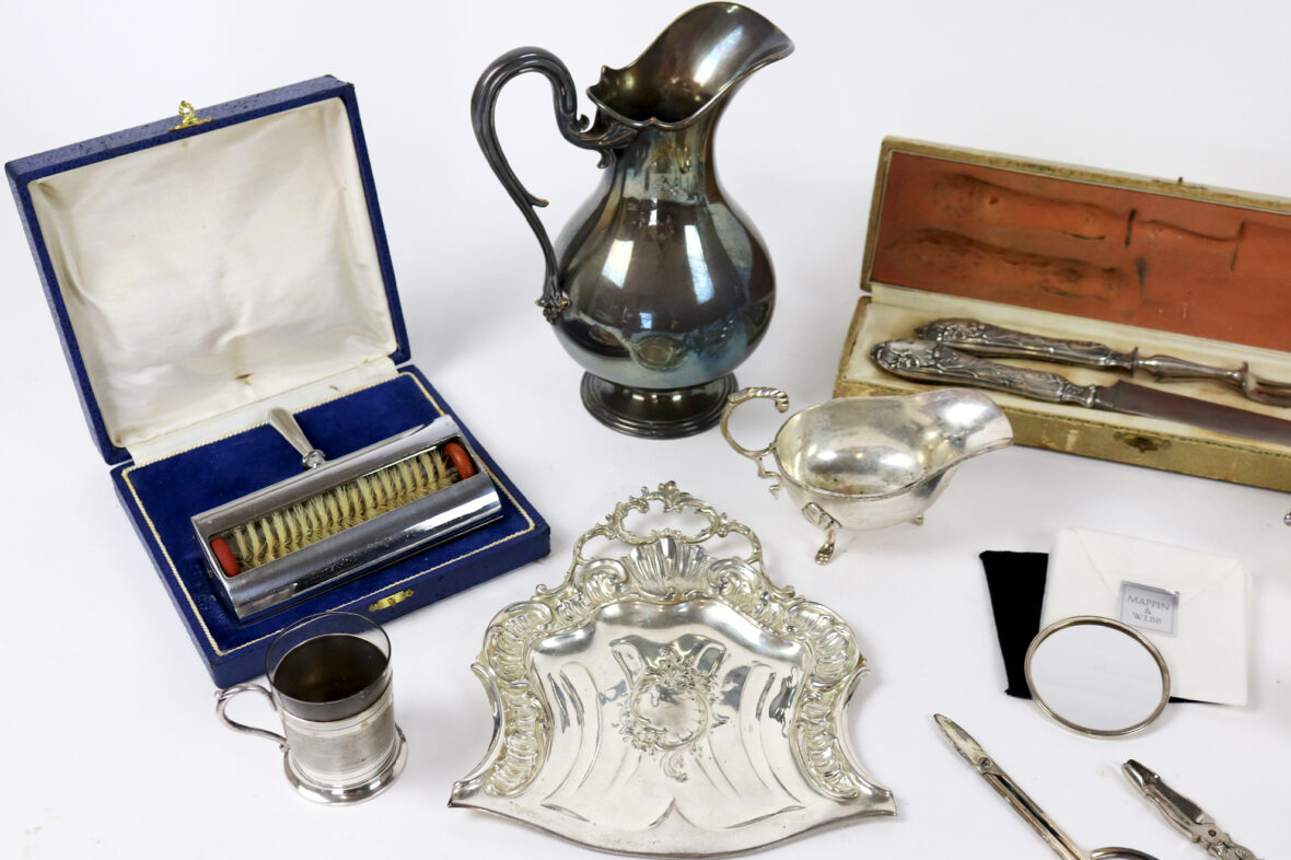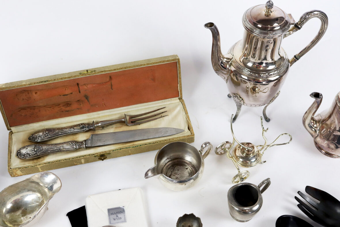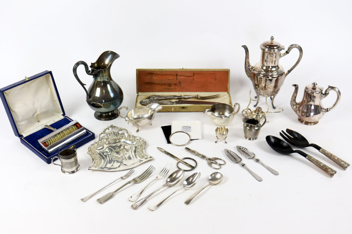 Un petit miroir rond de poche Mappin & Webb, une carafe Christofle, une théière et une cafetière, un ramasse miette de table et une pelle, un chauffe fine brûleur réchauffeur, un coquetier à pattes d’oiseaux, un couvert à salade, une saucière, deux petits pots à lait, une tasse avec contenant en verre, un service à gigot dans son étui, deux cuillères à absinthe, une paire de ciseaux Christofle, une paire de ciseaux à sucre, et un lot de trois cuillères et trois fourchettes.