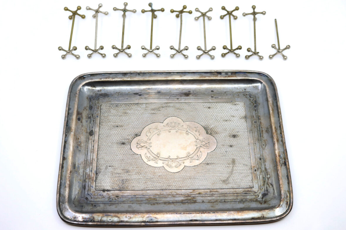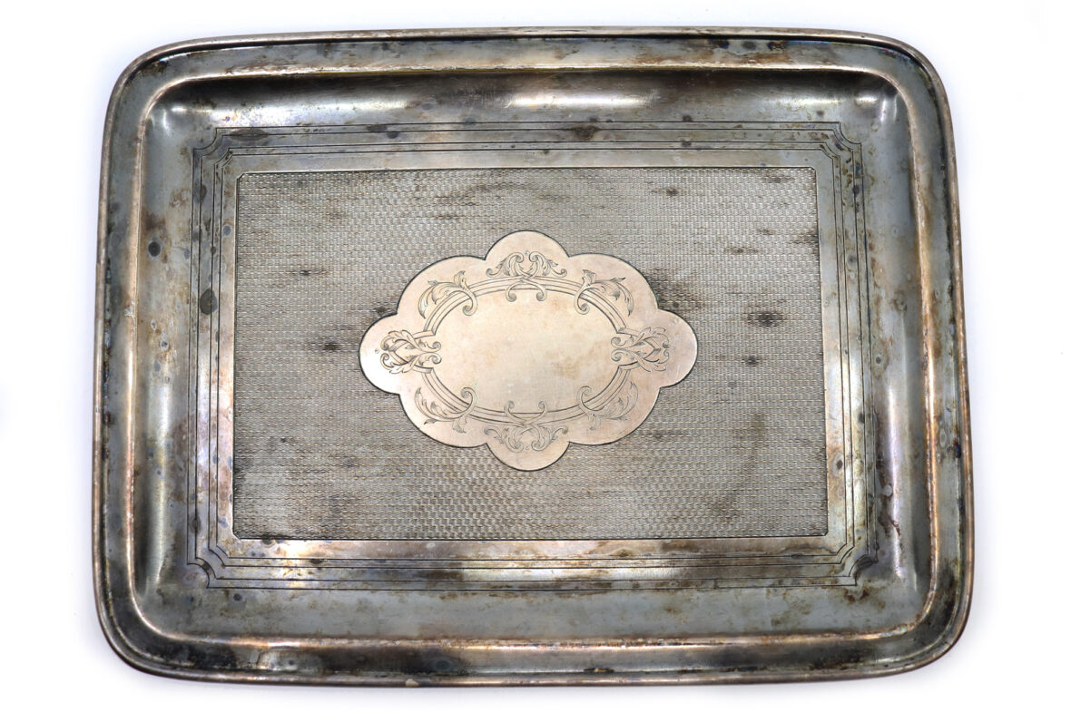 Ensemble en métal argenté comprenant : – un petit plateau rectangulaire à fond guilloché…
