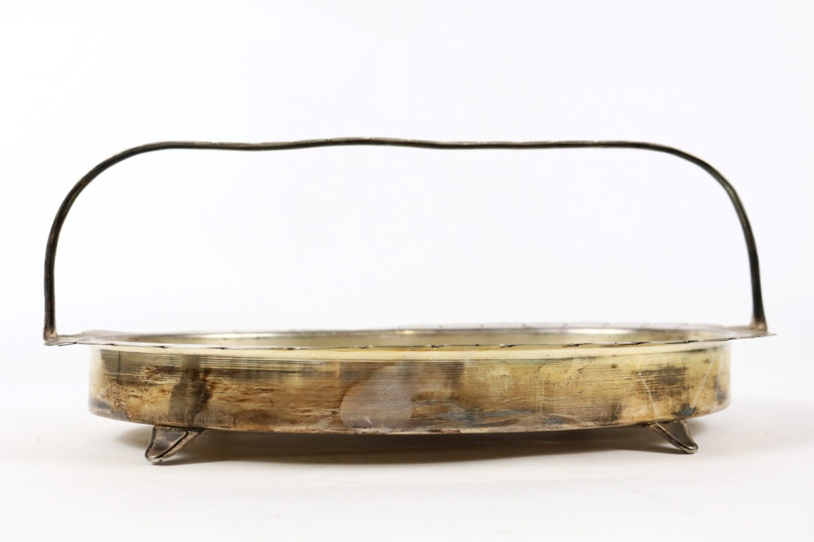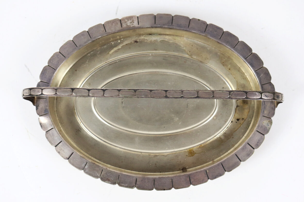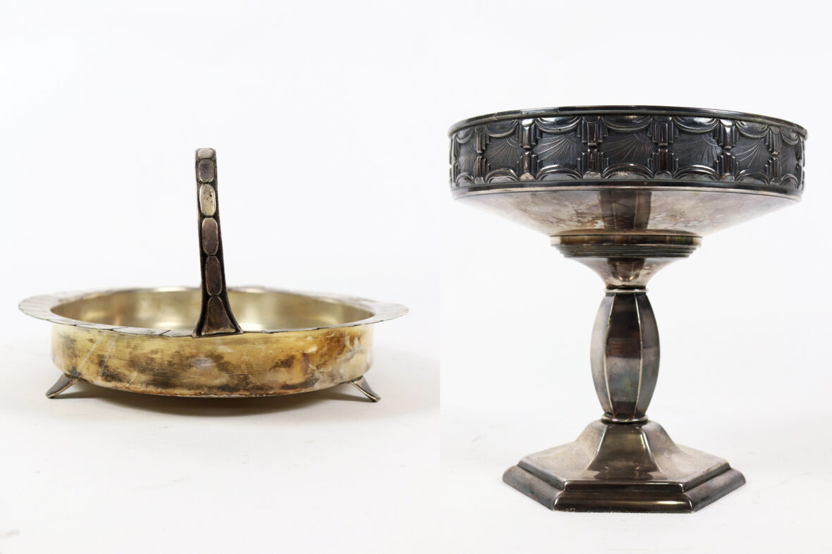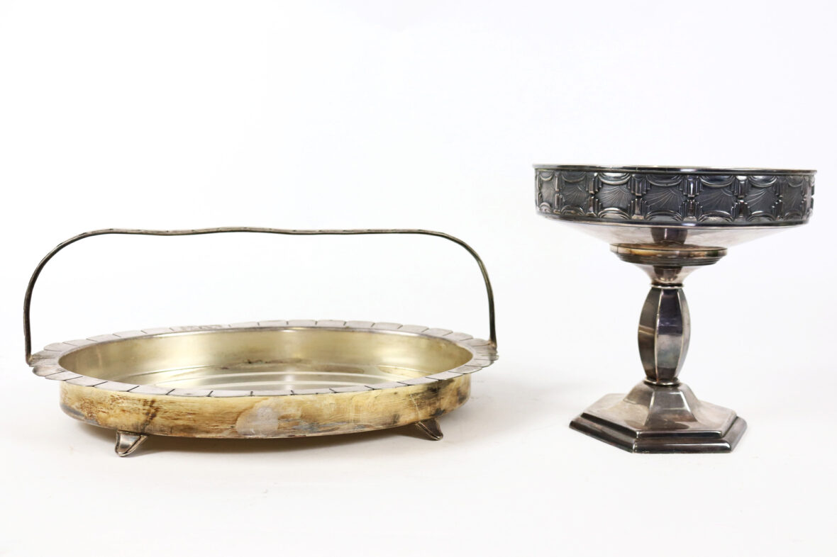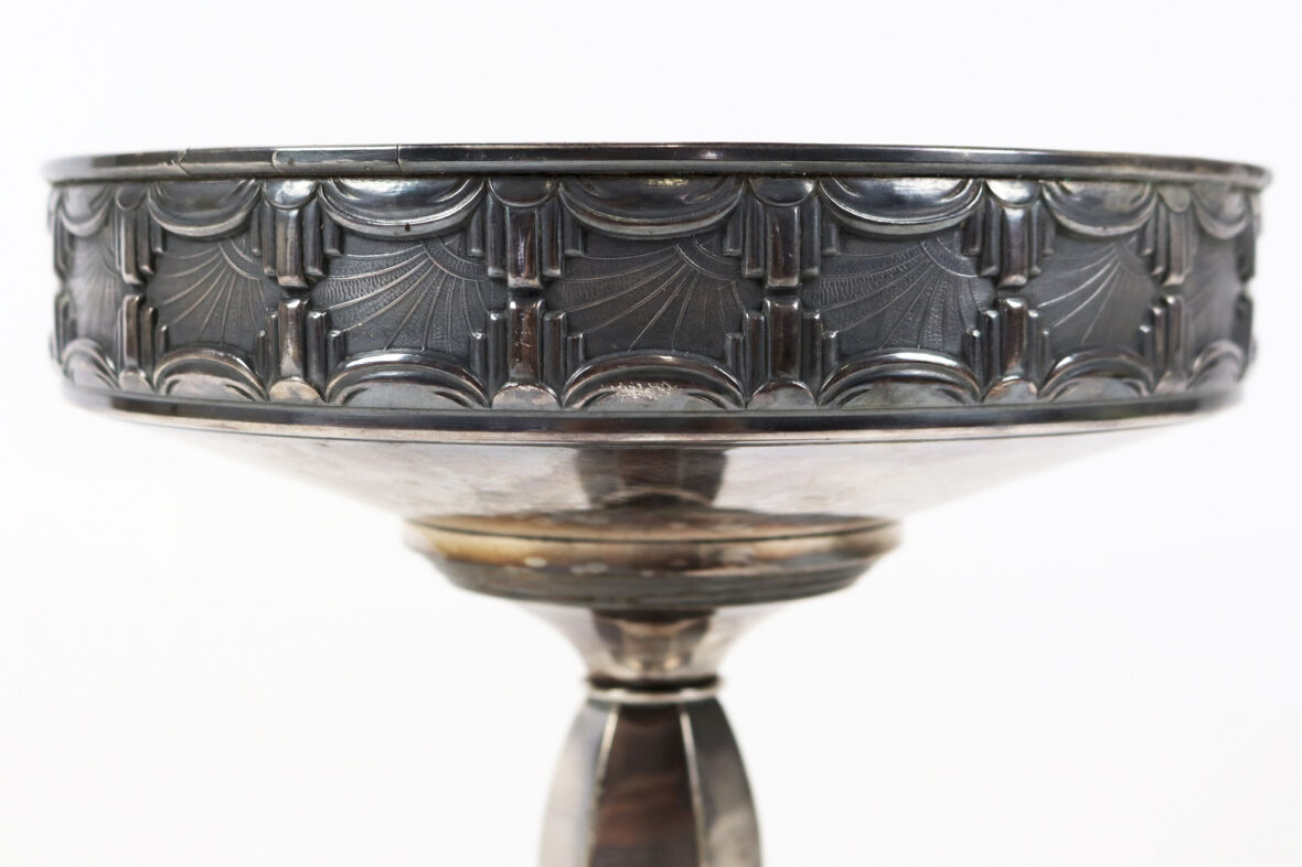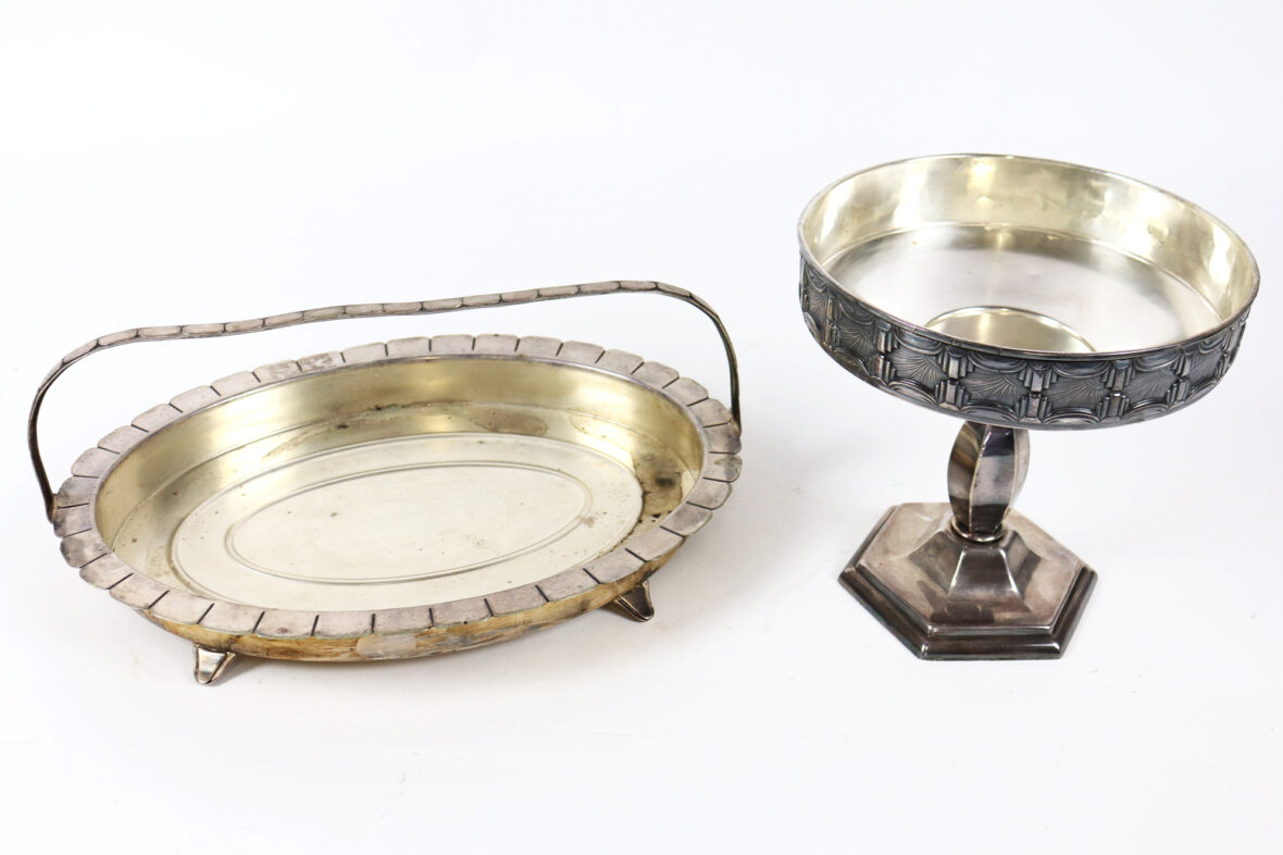 Ensemble en métal argenté comprenant une coupe sur piédouche à décor Art déco d’une frise de passementerie stylisée et un petit présentoir à hors d’œuvre (manque l’intérieur).