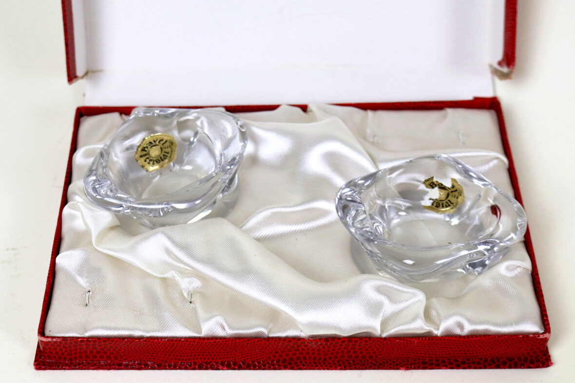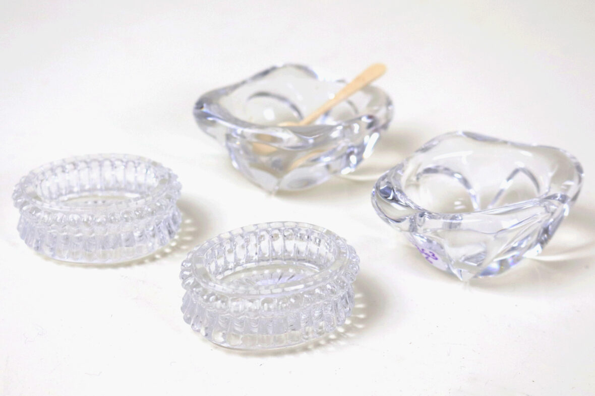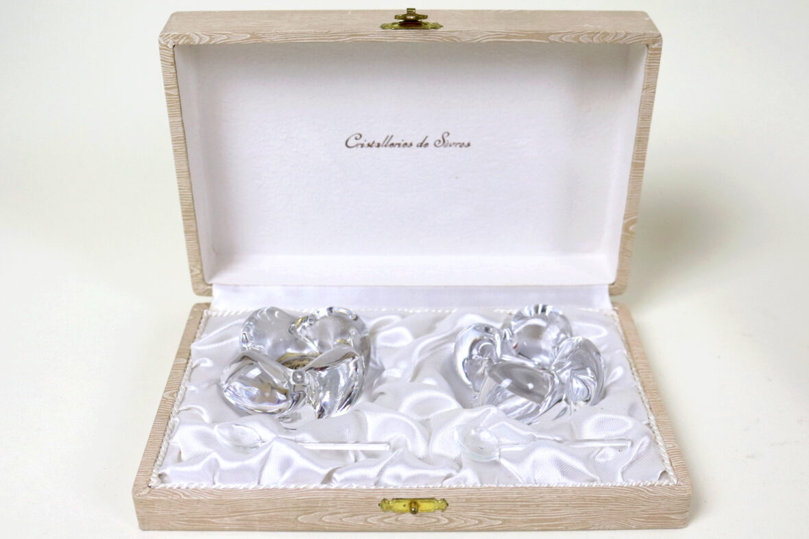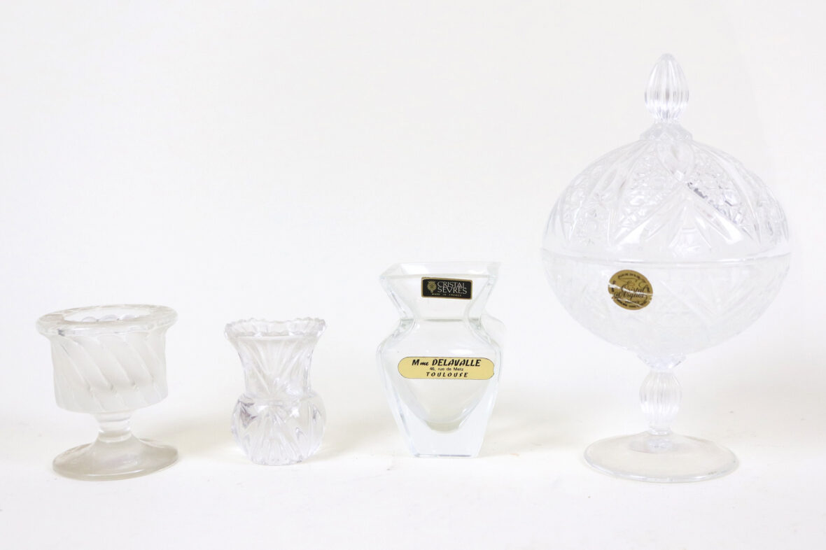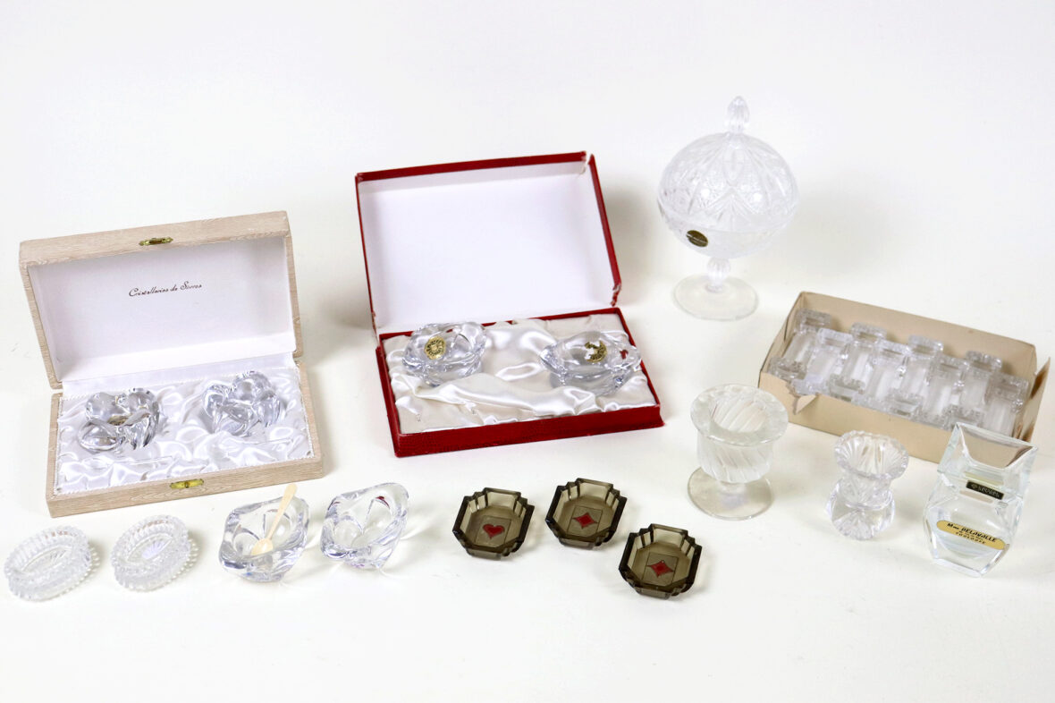 Ensemble en verre et cristal comprenant quatre paires de salerons dont cristal de Sèvres (deux paires dans leur coffret), 3 petits salerons en verre fumé, 8 porte-couteaux en verre moulé, deux petits vases soliflores dont un en cristal de Sèvres, une bonbonnière en verre taillé et un bougeoir en verre moulé pressé sur piédouche signé Lalique France.