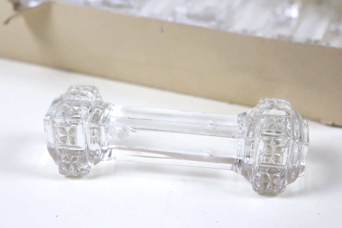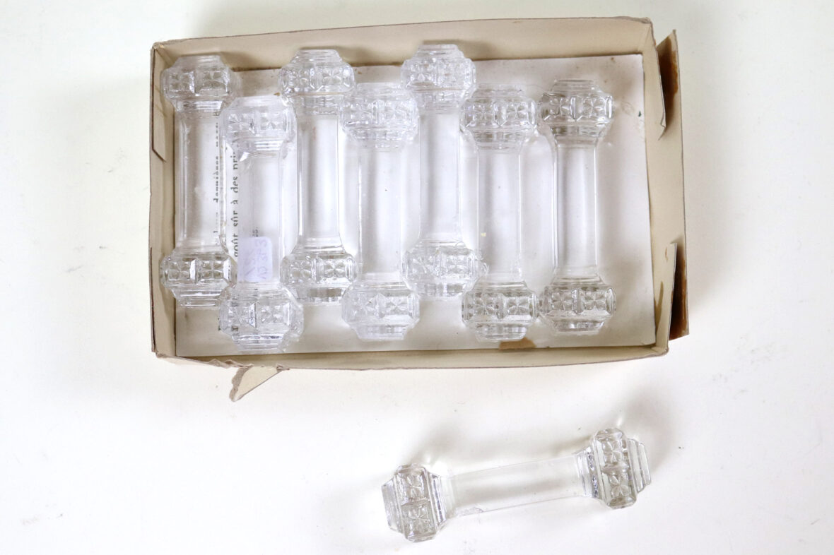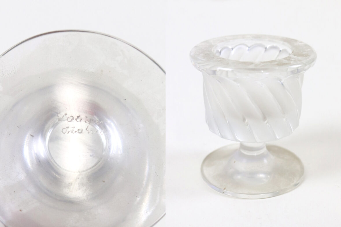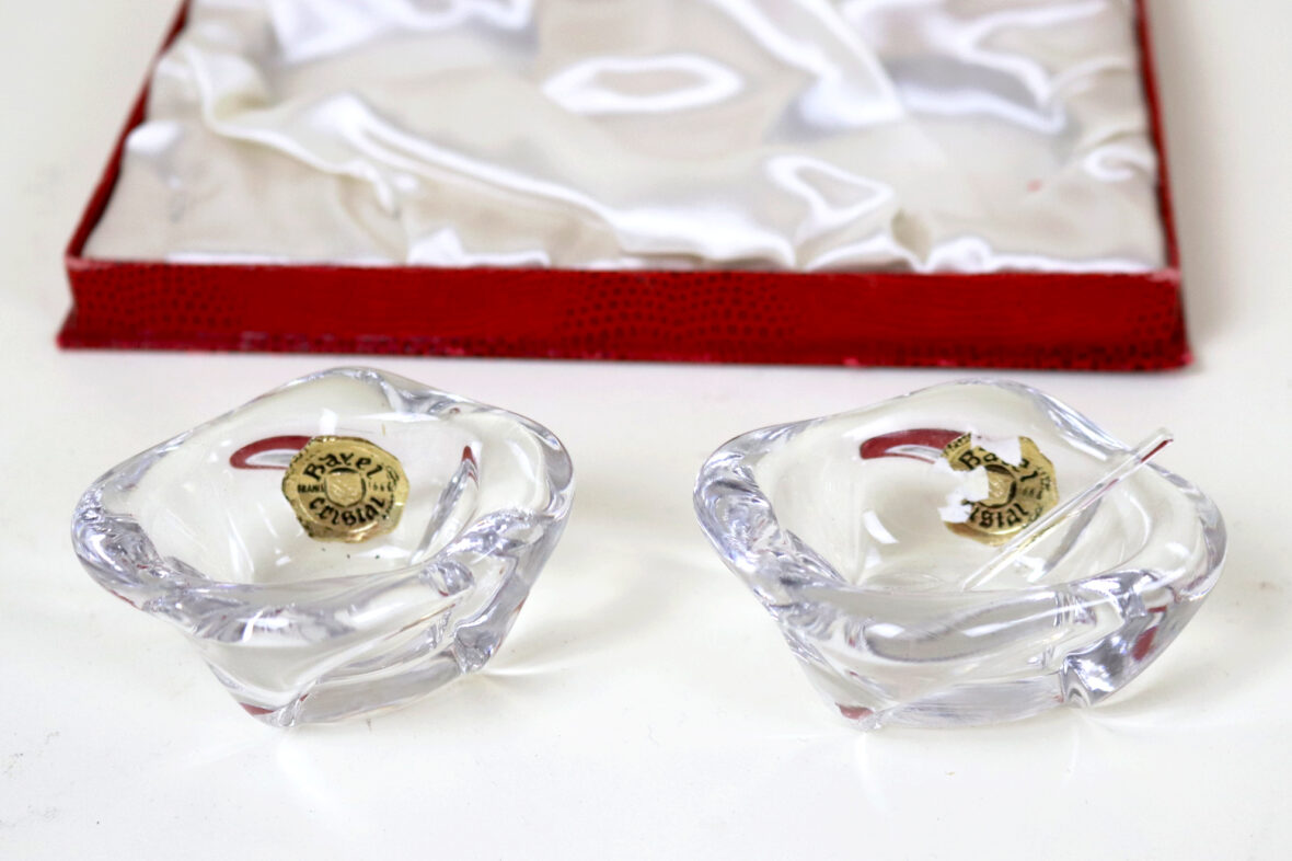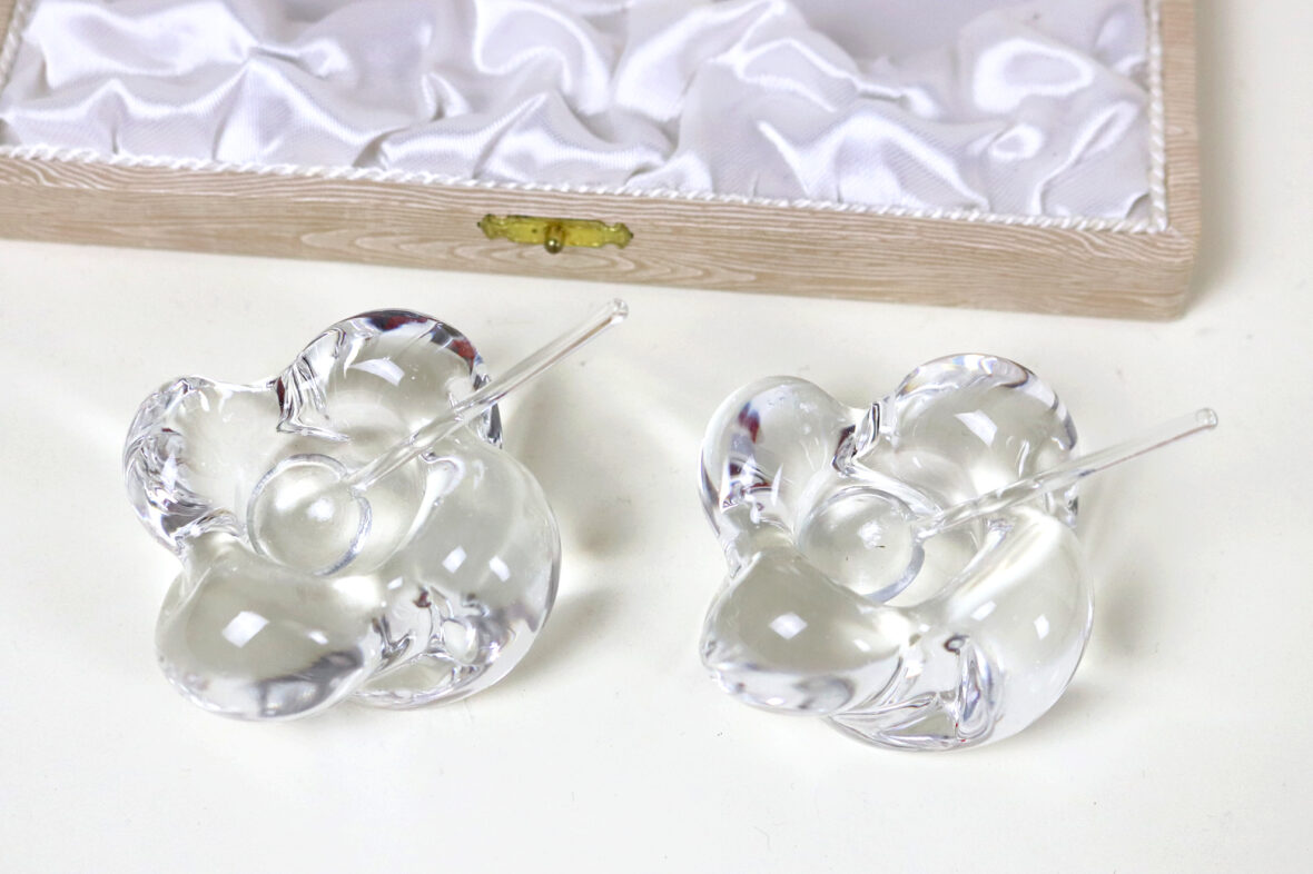 Ensemble en verre et cristal comprenant quatre paires de salerons dont cristal de Sèvres (deux paires dans leur coffret), 3 petits salerons en verre fumé, 8 porte-couteaux en verre moulé, deux petits vases soliflores dont un en cristal de Sèvres, une bonbonnière en verre taillé et un bougeoir en verre moulé pressé sur piédouche signé Lalique France.