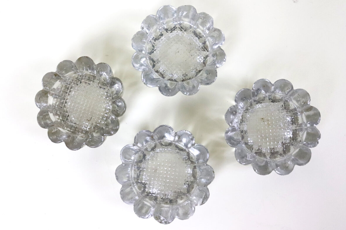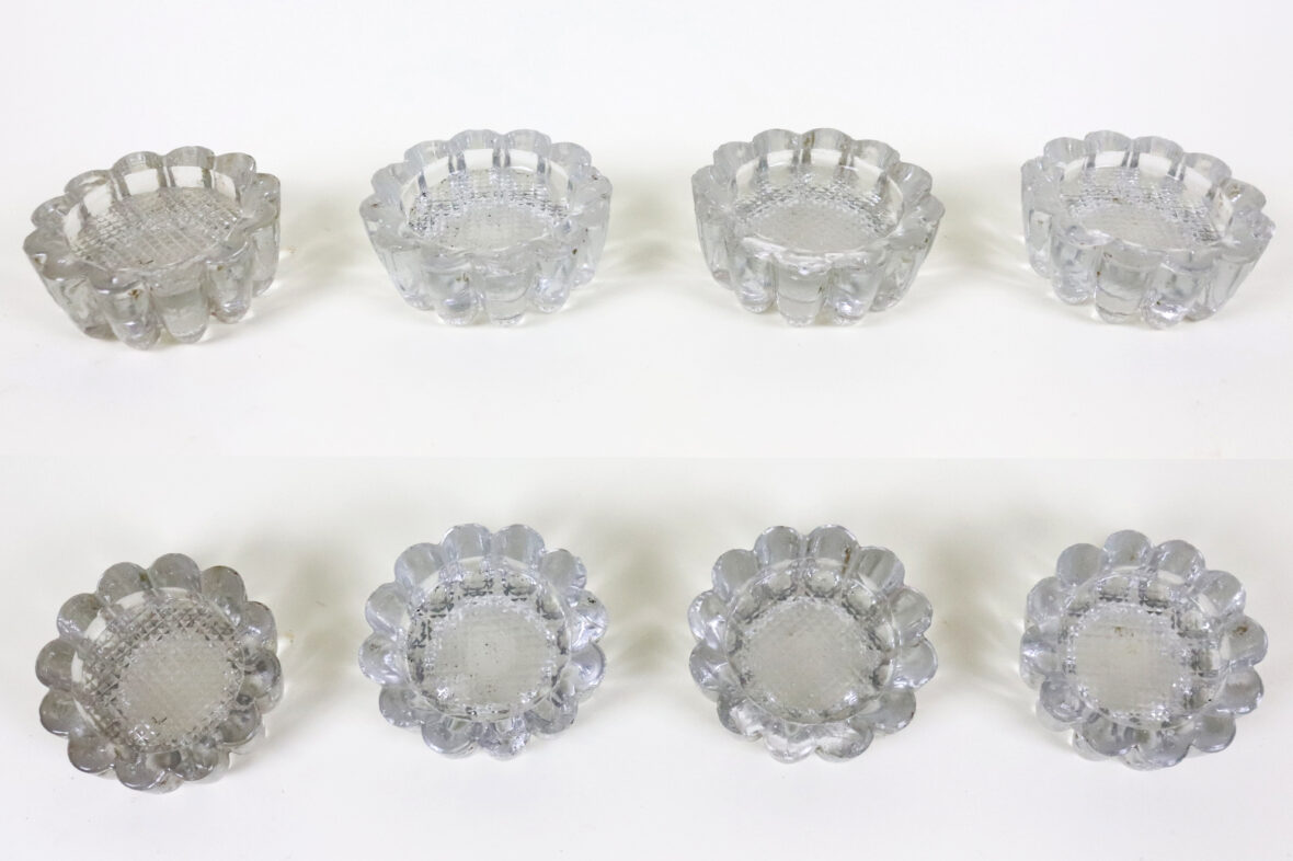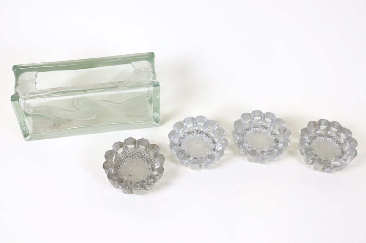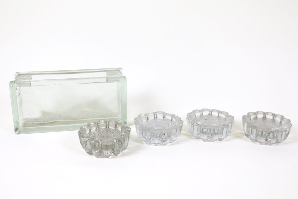 Ensemble en verre moulé comprenant un vase rectangulaire et quatre petits bougeoirs à décor de godrons (égrenures).
