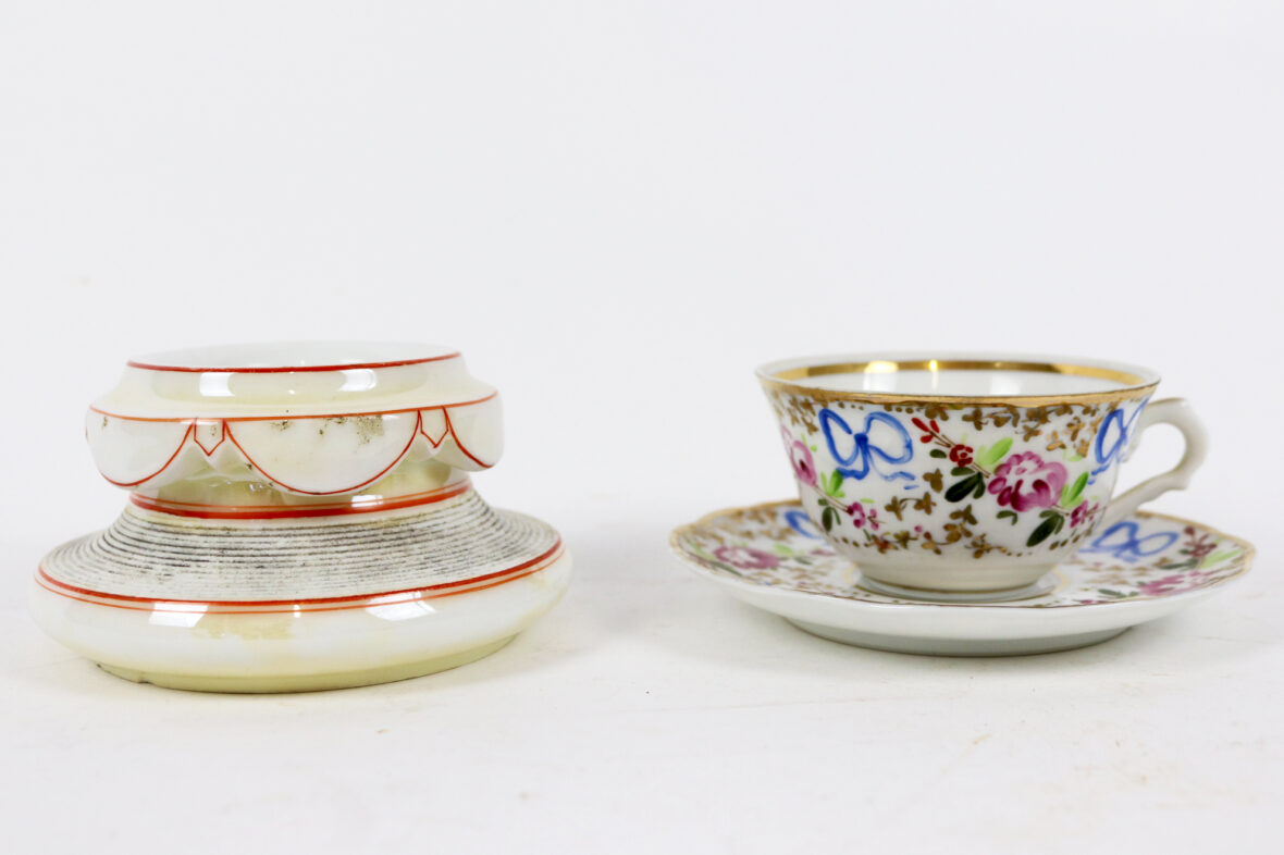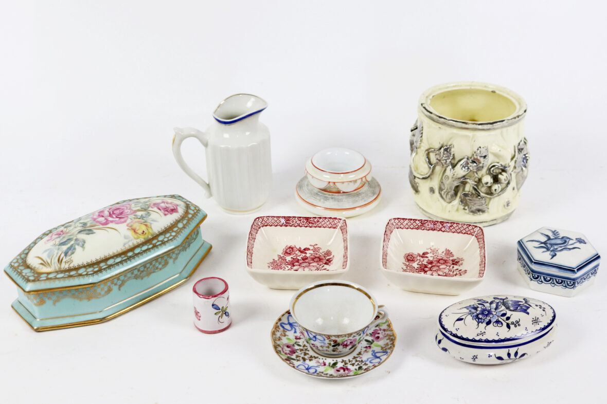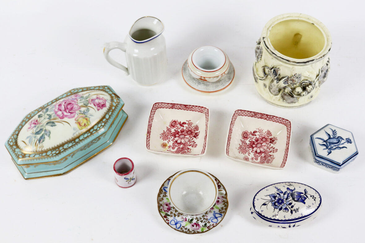 Ensemble varia en céramique et porcelaine comprenant notamment trois boîtes couvertes, une tasse et sous tasse, deux petits vide-poches, un encrier, une verseuse, un gobelet et un pot.