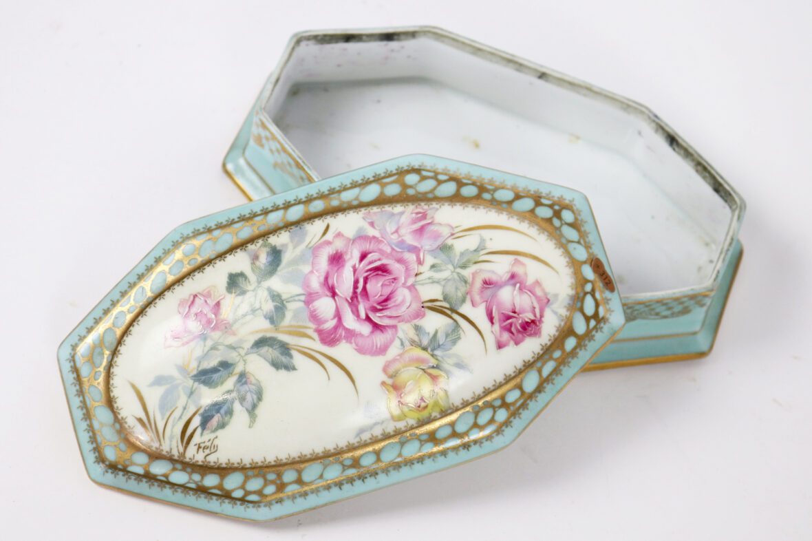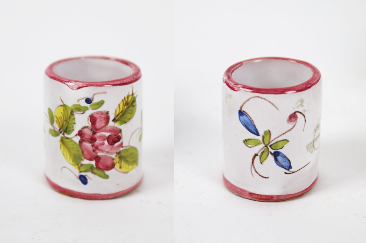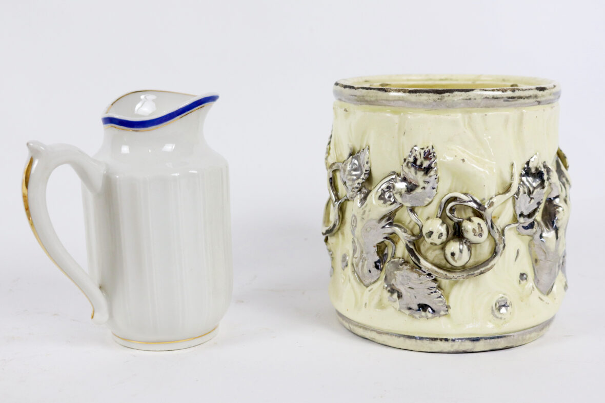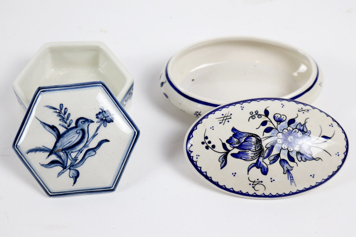 Ensemble varia en céramique et porcelaine comprenant notamment trois boîtes couvertes, une tasse et sous tasse, deux petits vide-poches, un encrier, une verseuse, un gobelet et un pot.