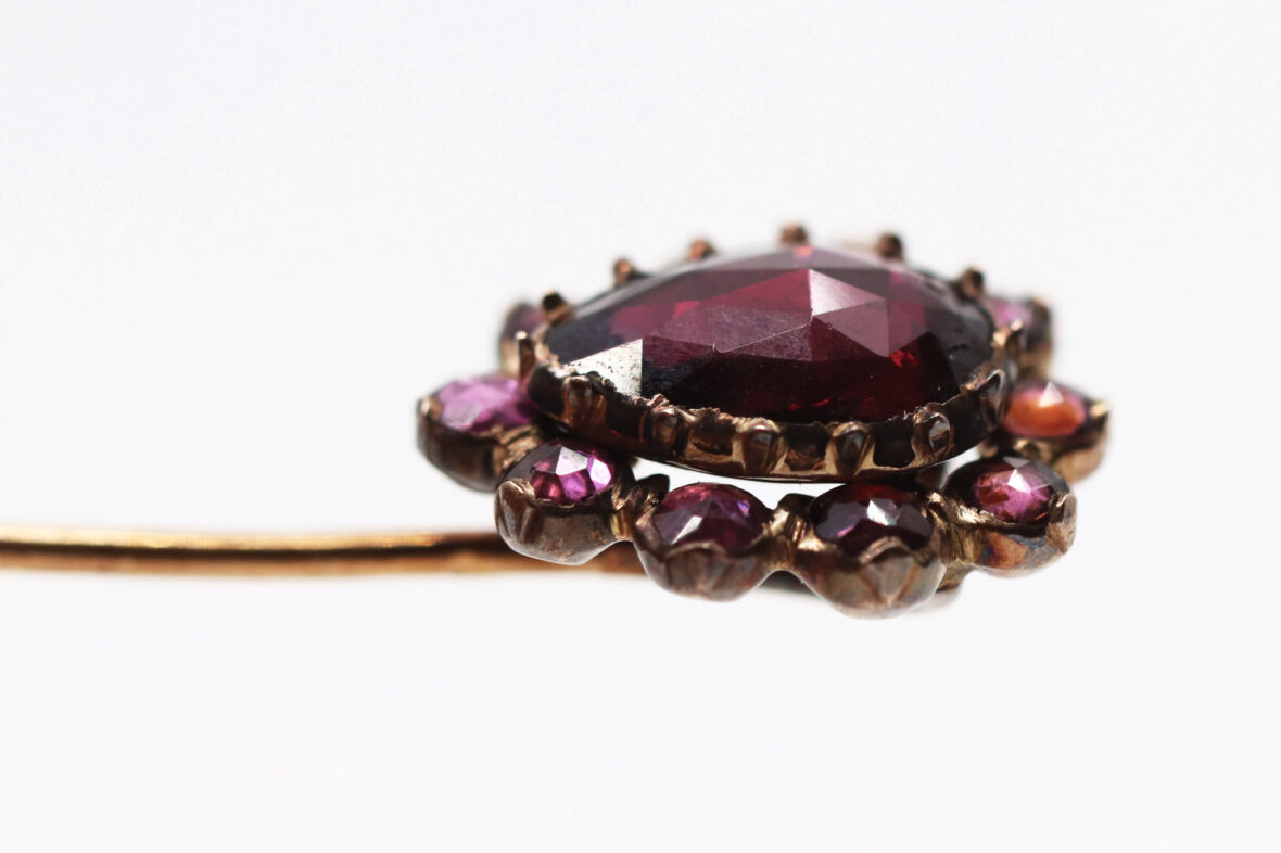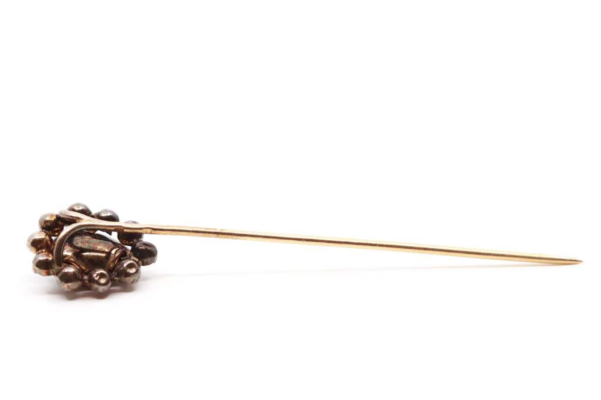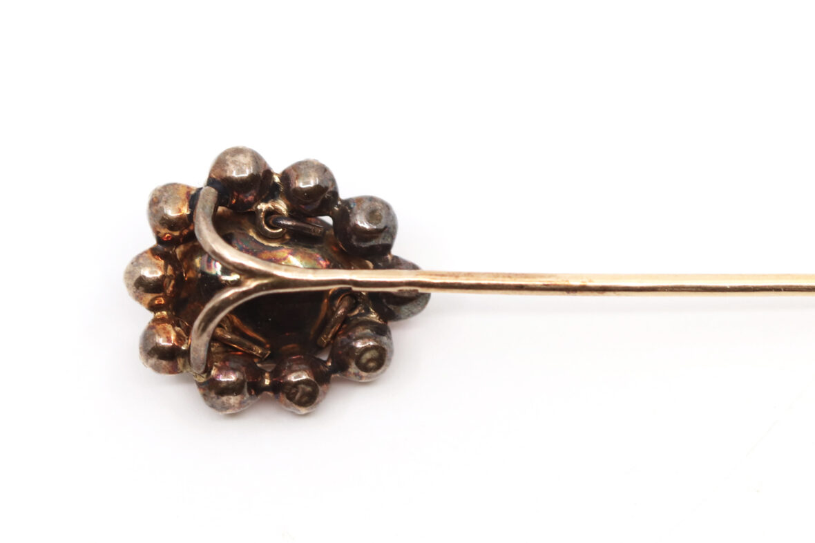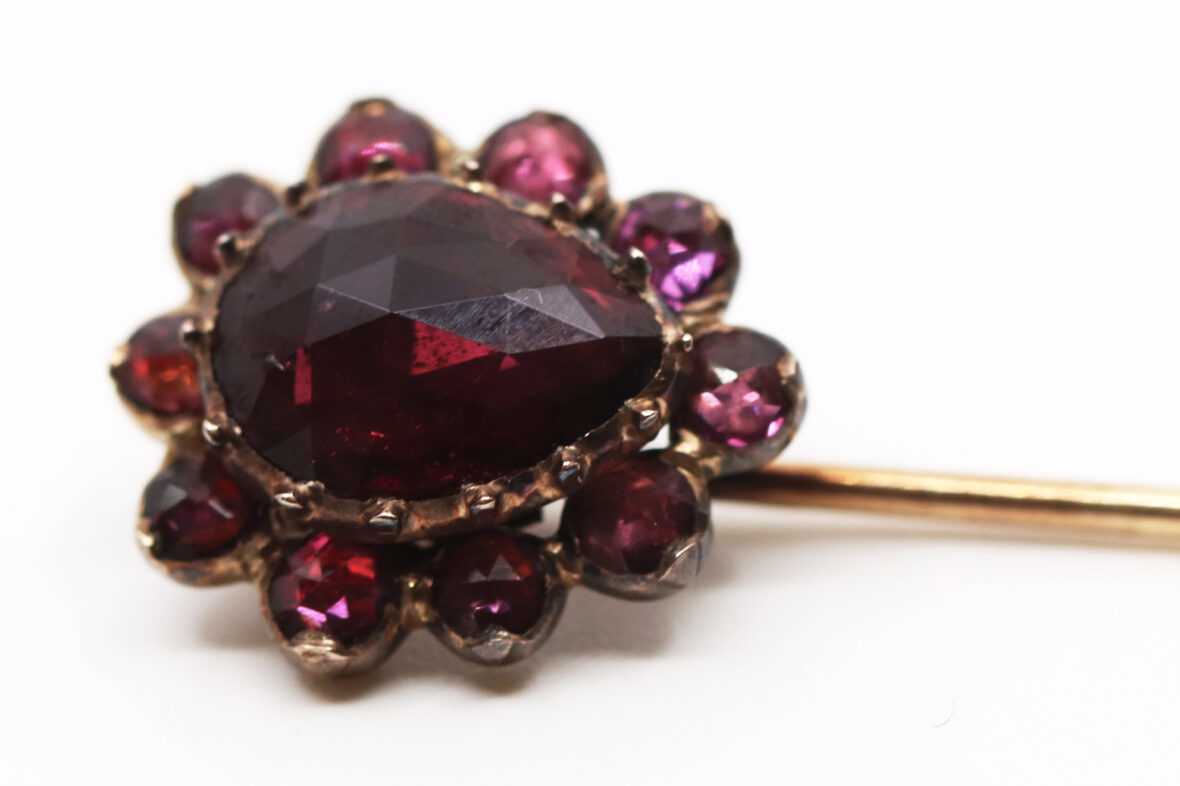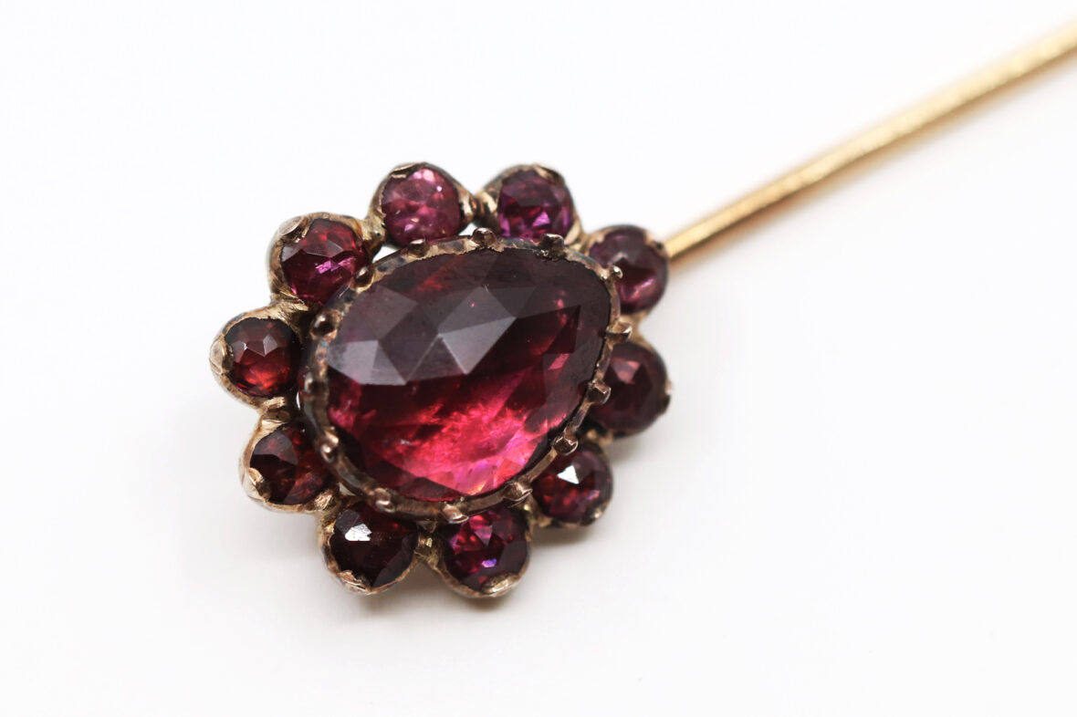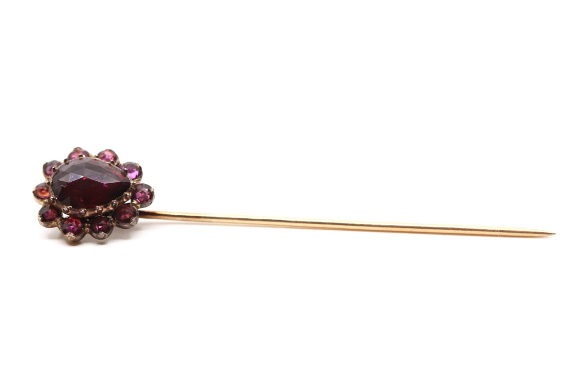 Épingle de cravate en or jaune ornée d’une marguerite de grenats. Poids : 2,6 g