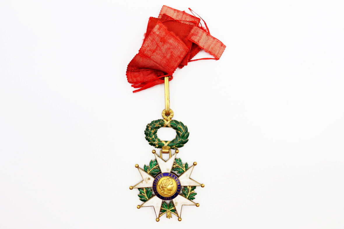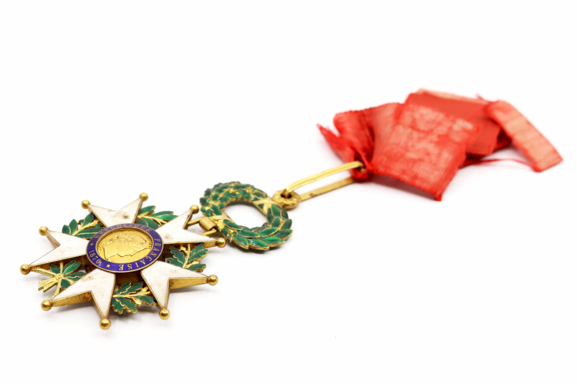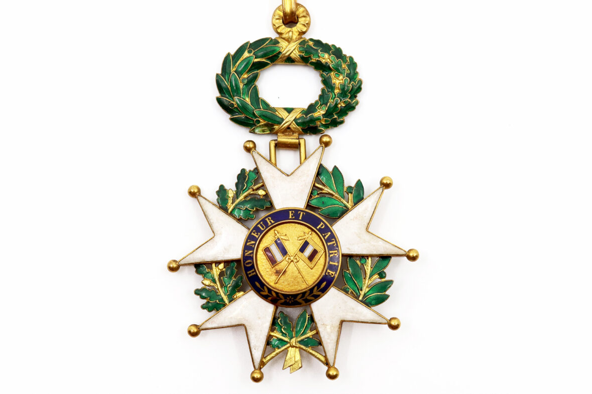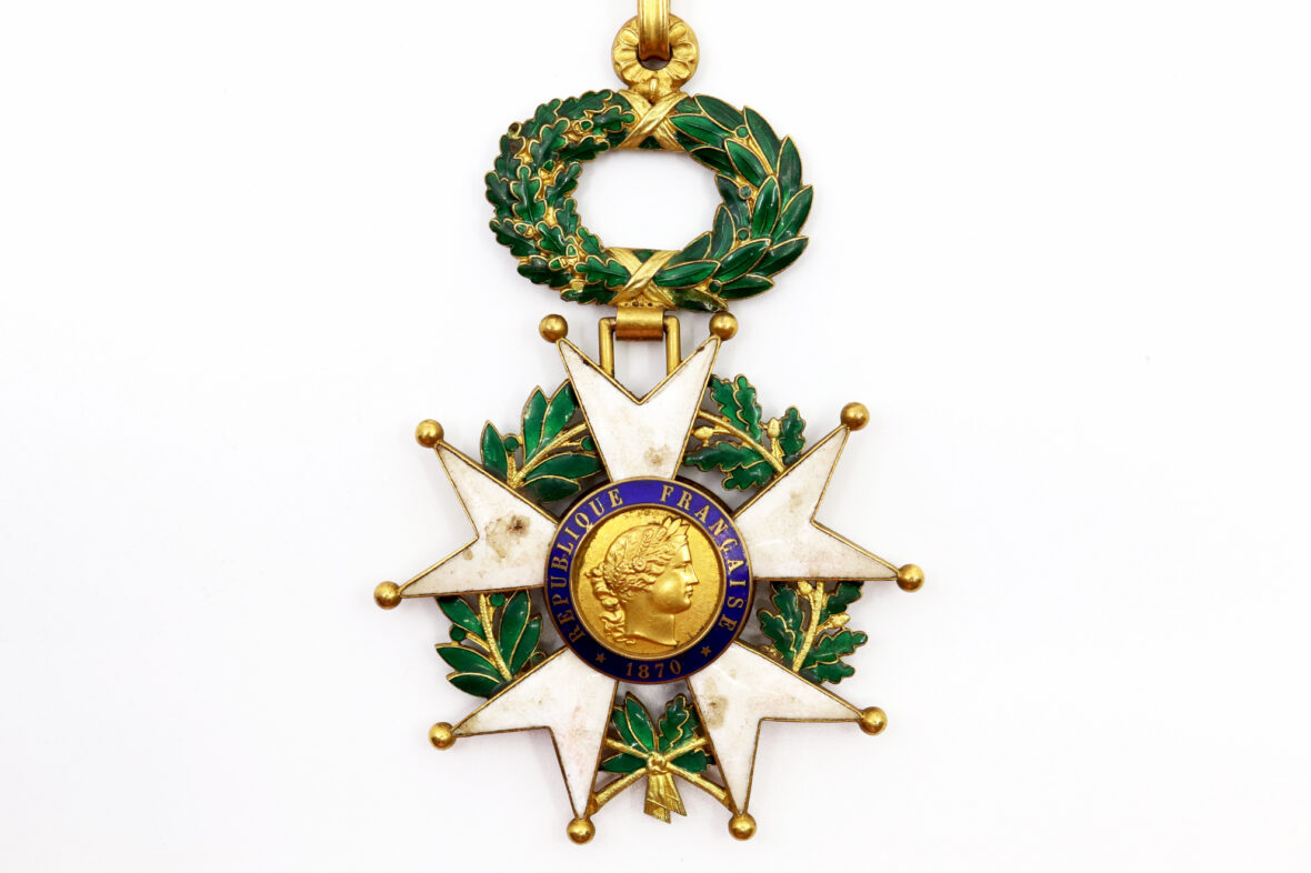 Étoile de commandeur de la légion d’honneur type troisième république, beau bijou en or émail blanc des branches taché, émaux verts de la couronne intact, poinçons sur l’anneau, reste de cravate déchirée et insolé.