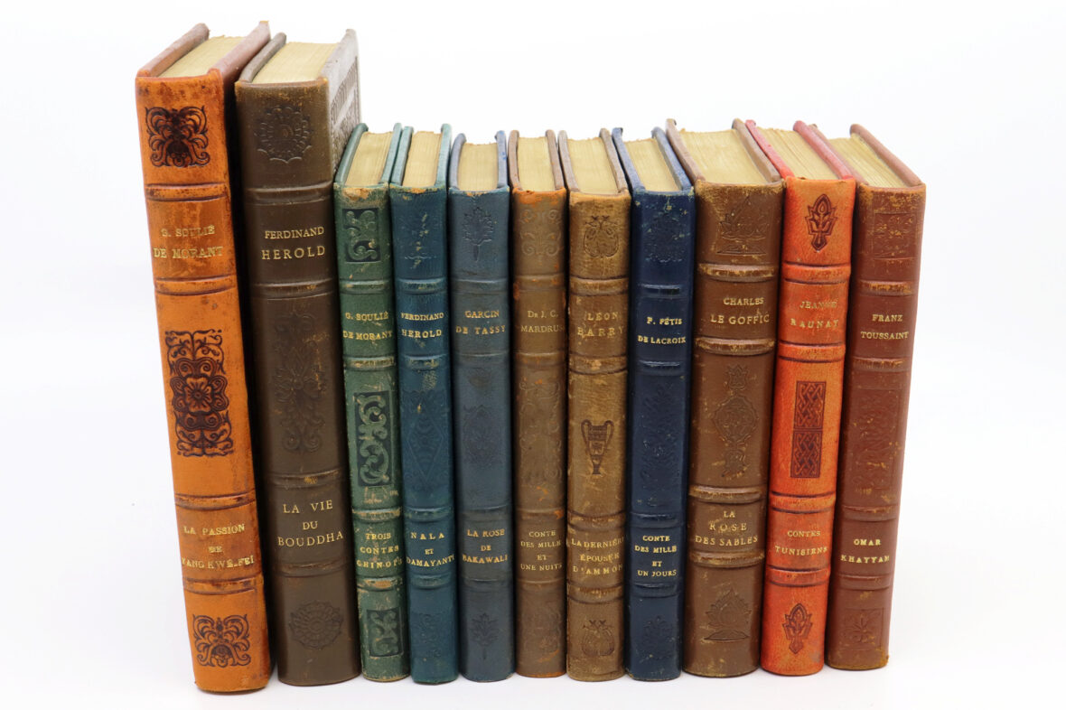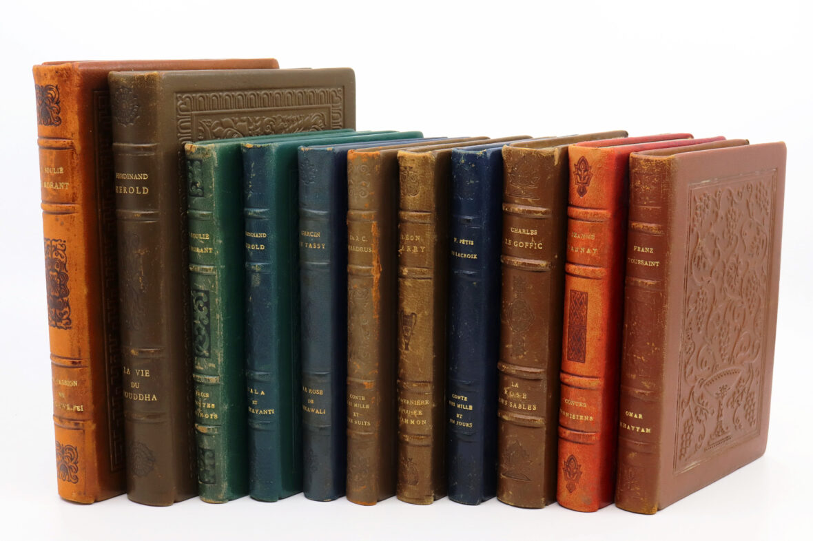 9 volumes de la collection Ex Oriente Lux (Paris, Piazza) en reliure d’éditeur, in-12, pleine basane (de couleurs différentes), dos à quatre nerfs ornés de décor à froid, grande plaque à froid (aux décors, d’inspiration orientale, différents) ornant les plats, têtes dorées :