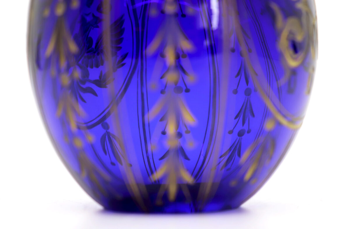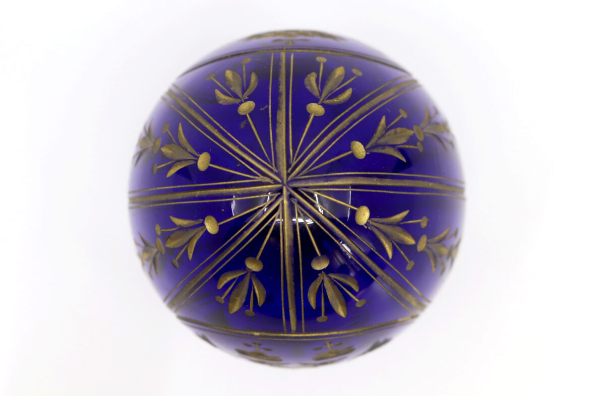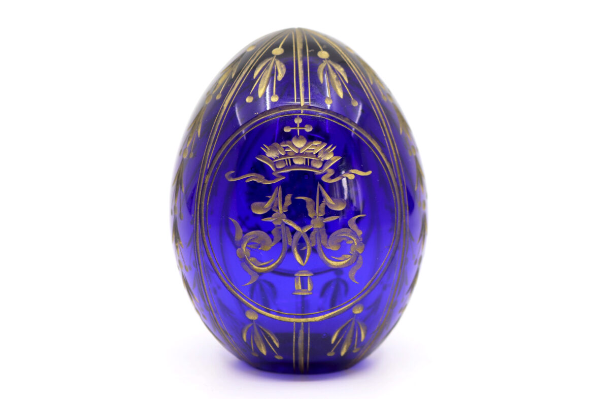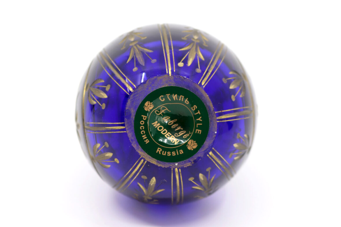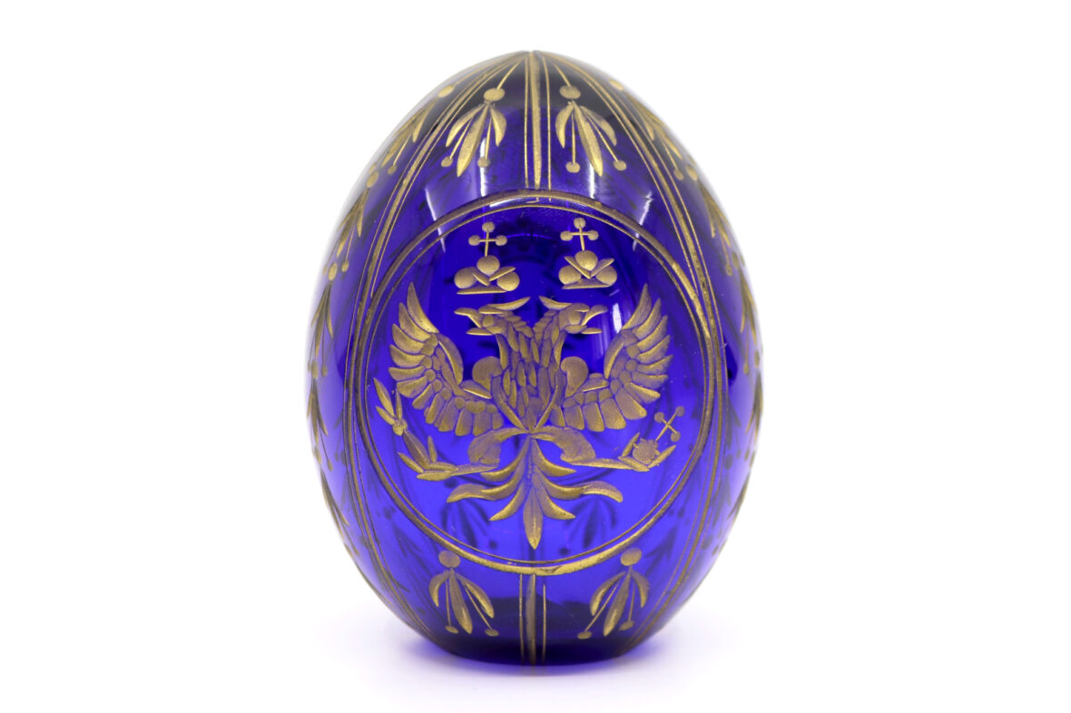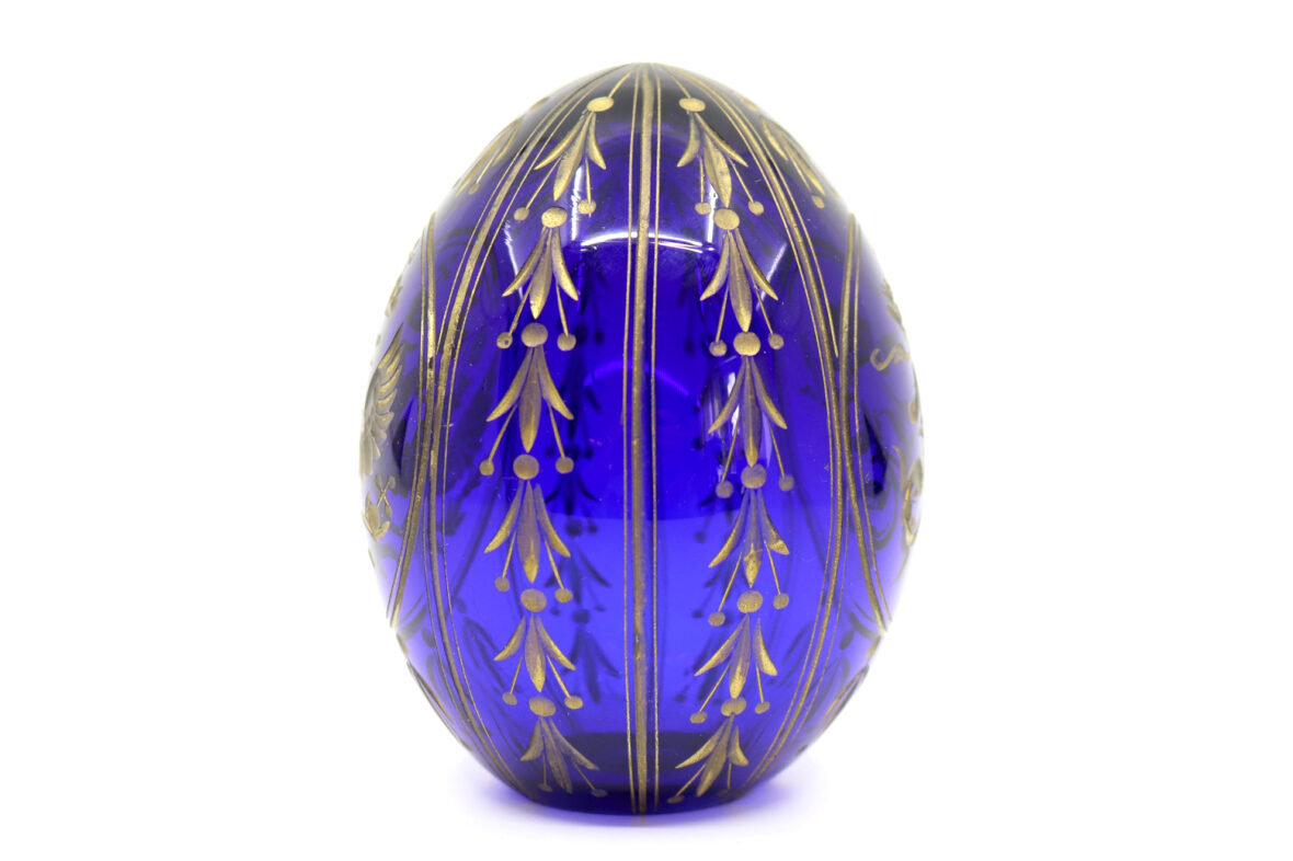 Œuf en verre bleu gravé et doré. Travail russe du Xxe siècle.