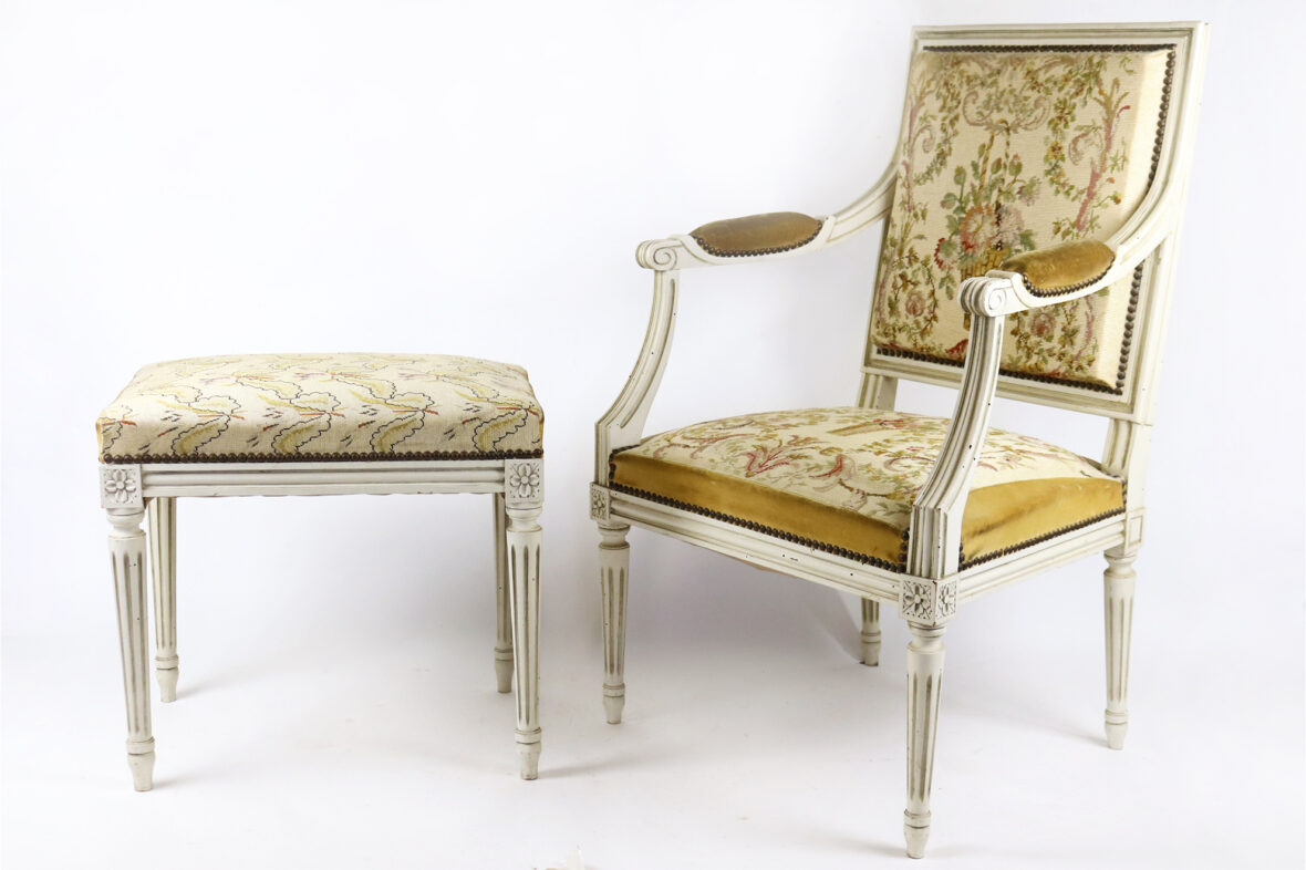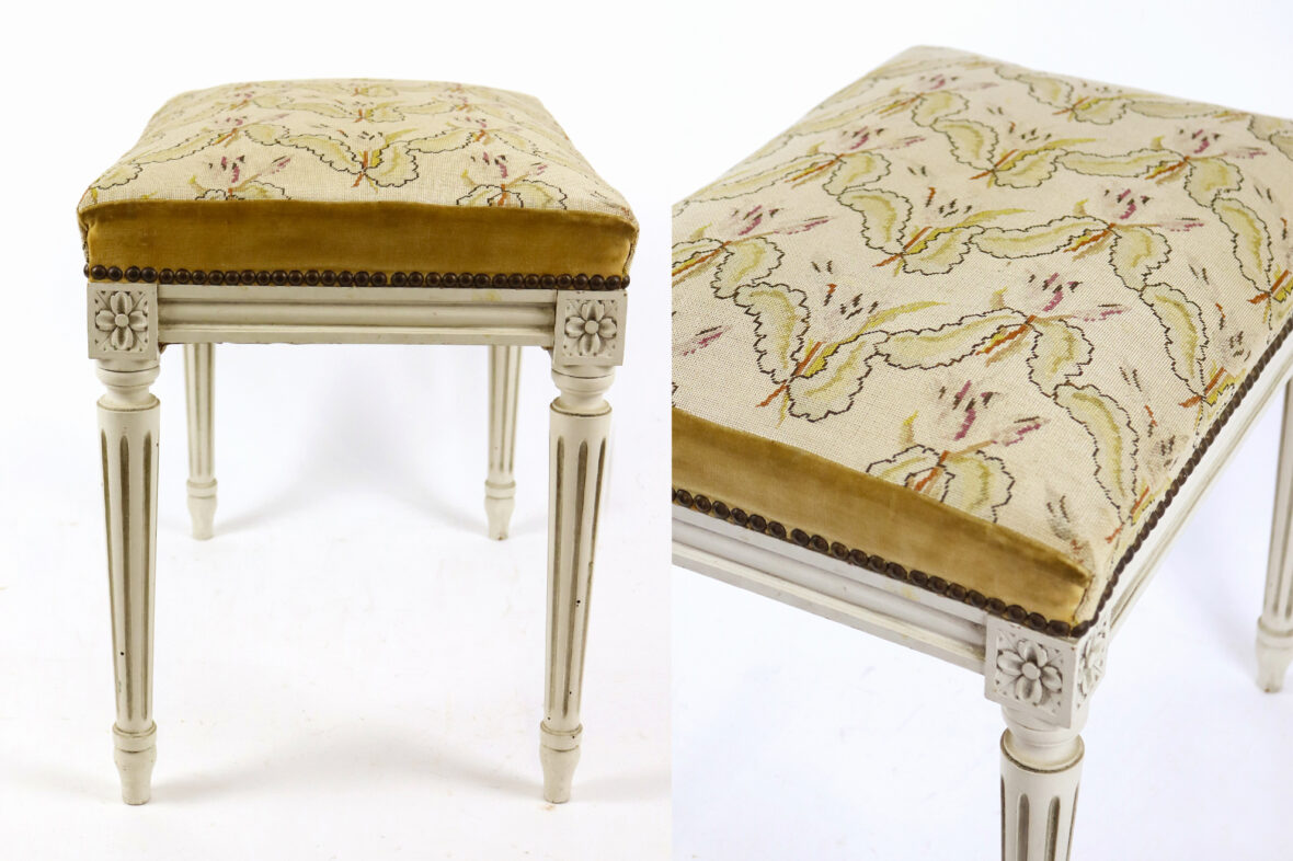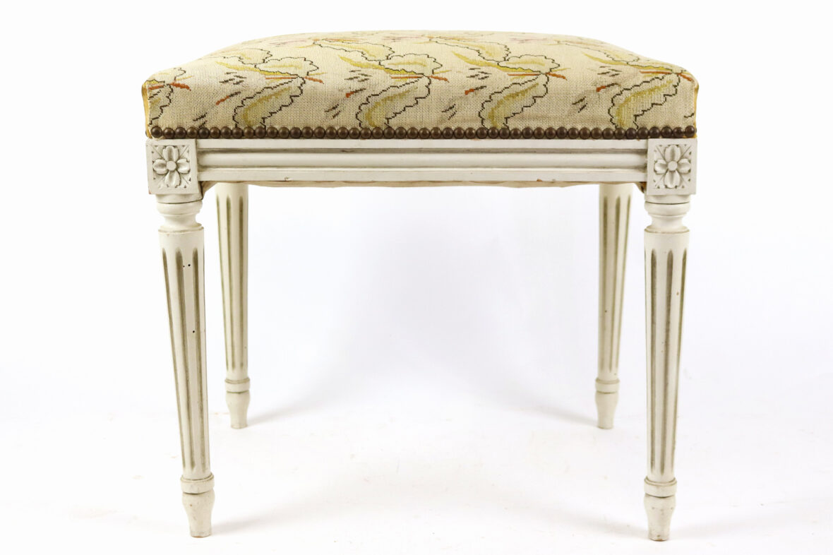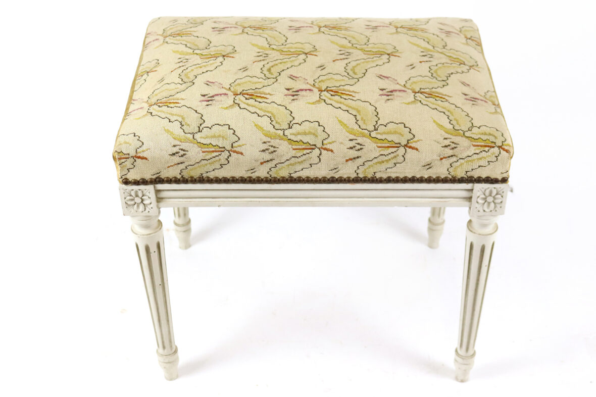 On y joint un tabouret assorti, garniture de tapisserie à décor de fleurs stilysées.