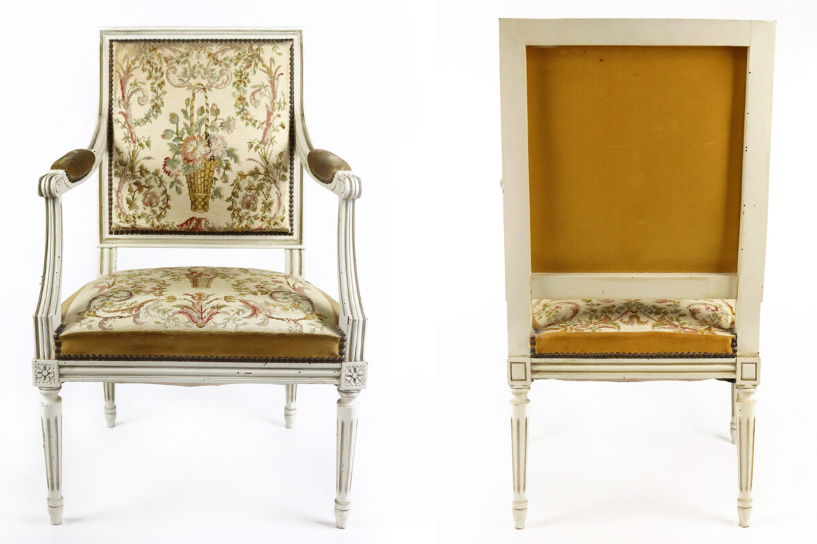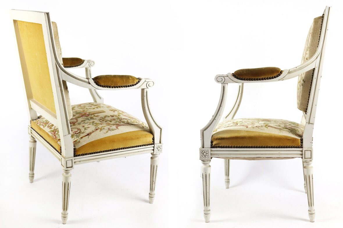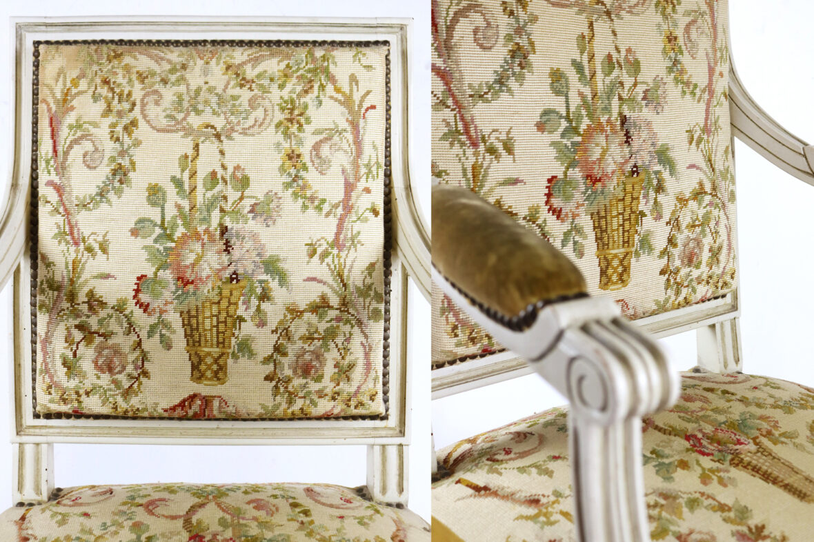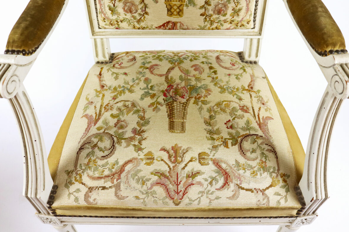 Fauteuil de style Louis XVI à dossier plat en bois laqué blanc à décor de cannelures. Garniture de tapisserie à décor de panier fleuri.