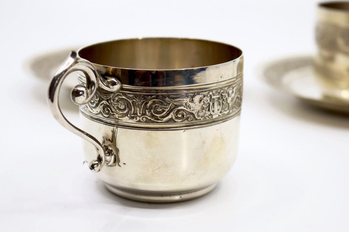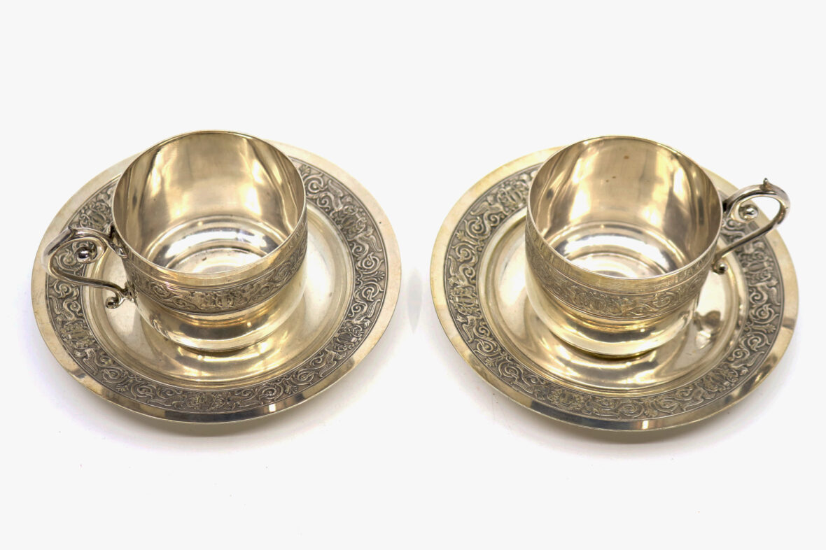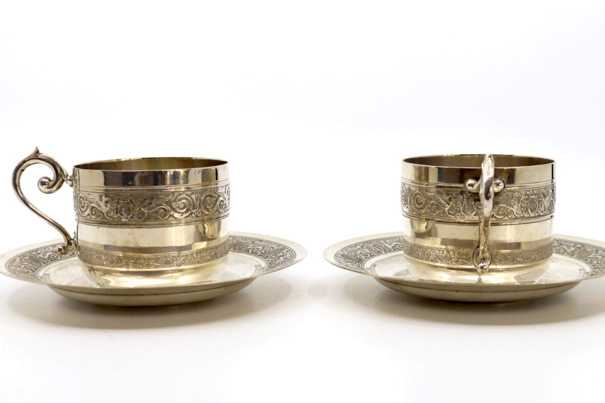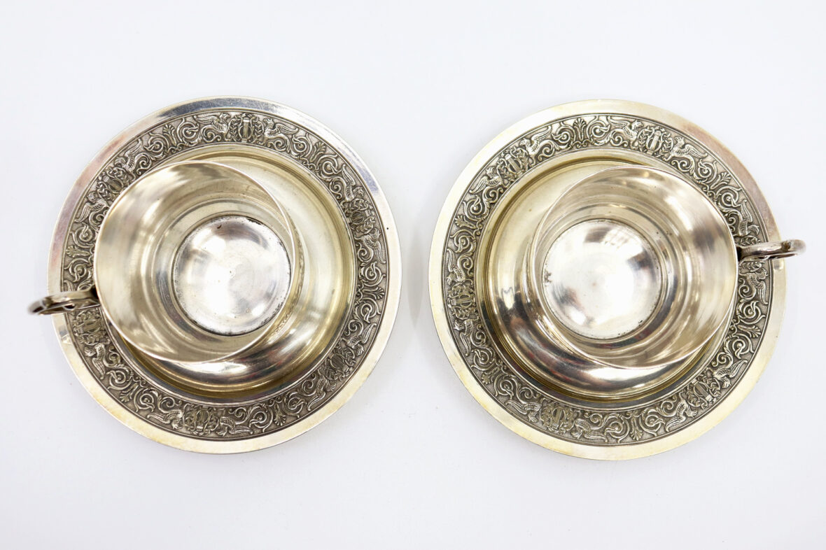 Paire de tasses et sous-tasses déjeuner en métal argenté à décor de frise de sphinx alternés de rinceaux.