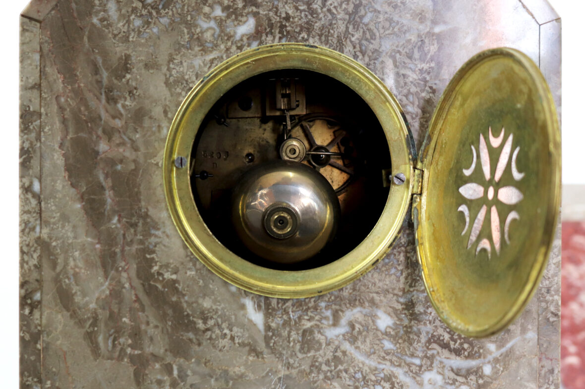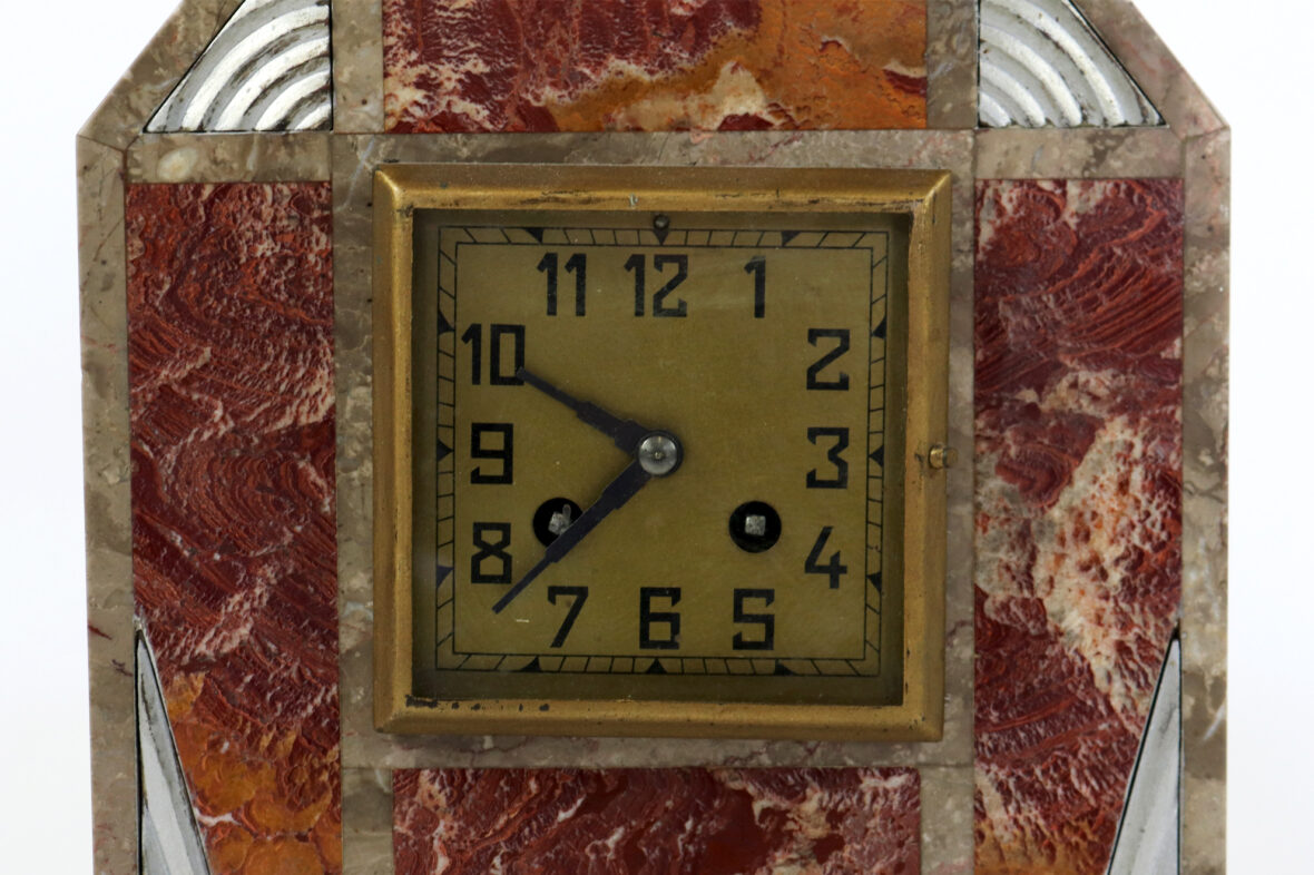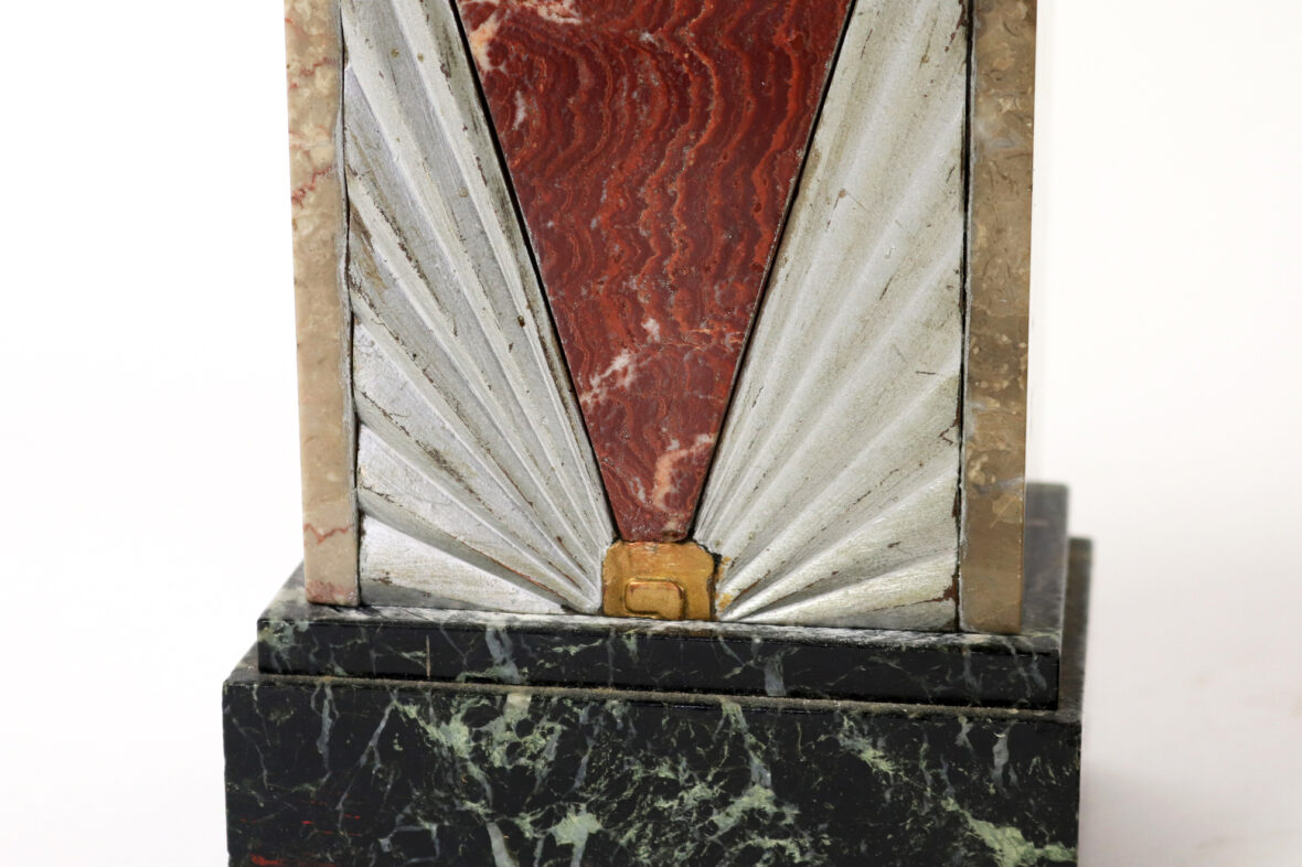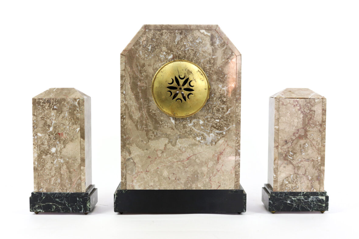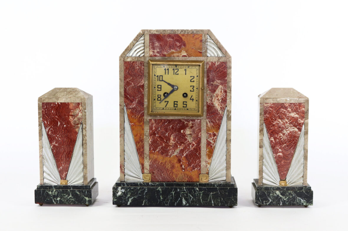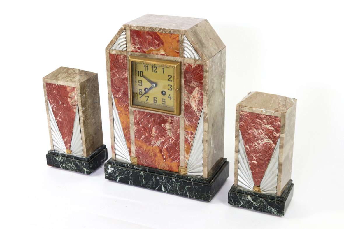 Garniture de cheminée Art déco en placage de marbre polychrome comprenant une pendule borne et deux obélisques.