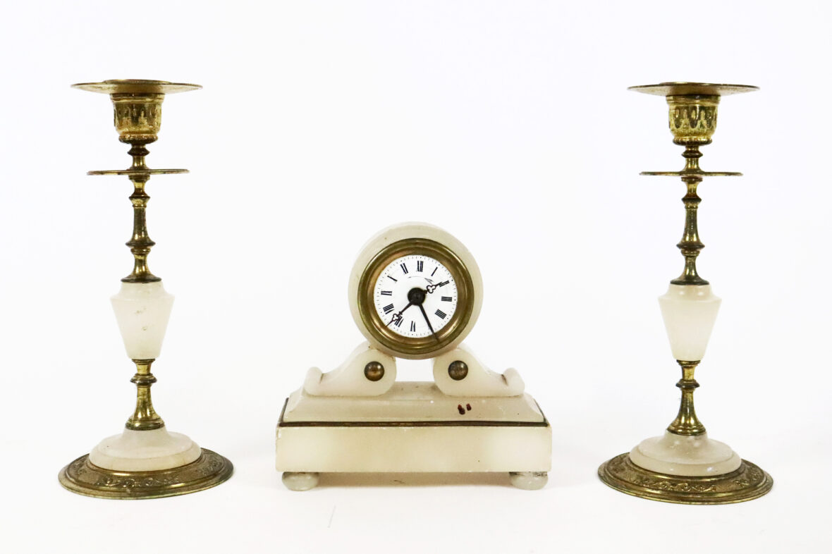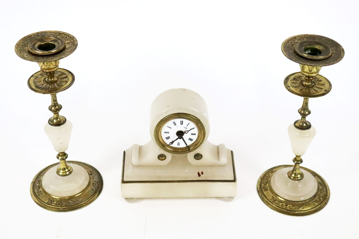 Garniture de cheminée en albâtre et laiton doré comprenant une pendule à cadran émaillé blanc à chiffres romains et deux bougeoirs;