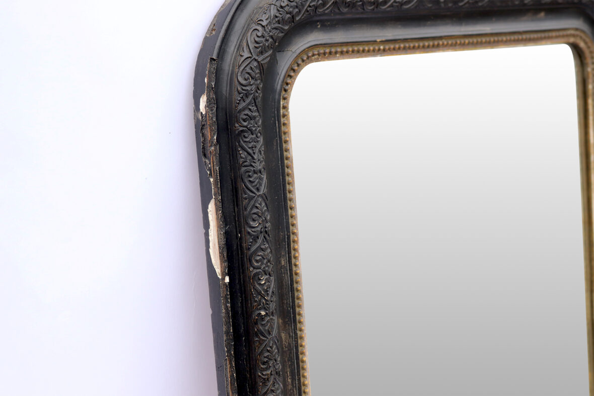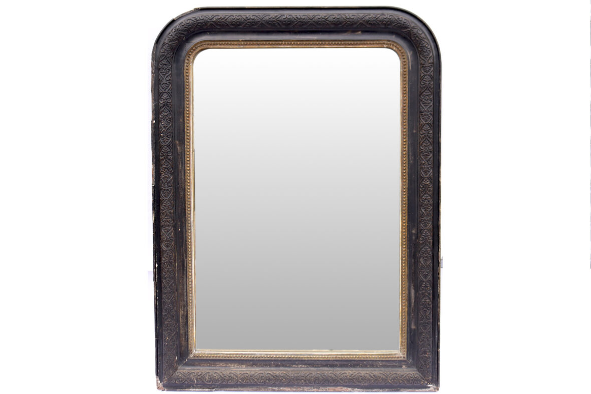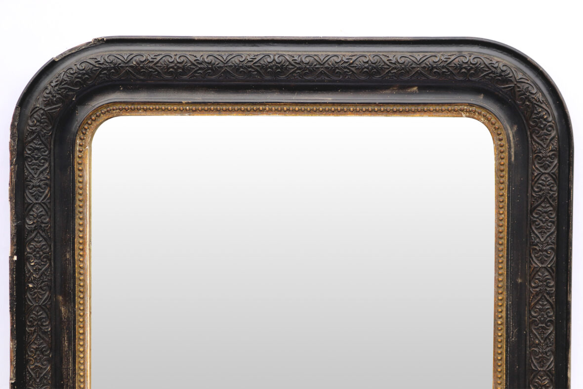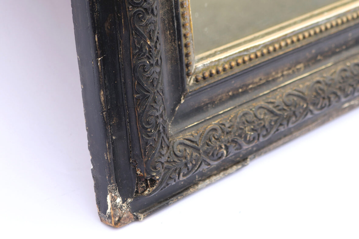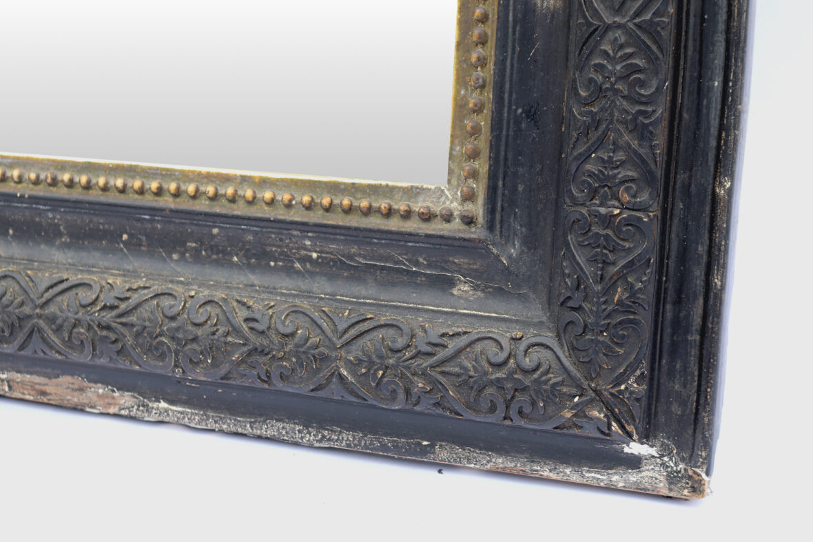 Grand miroir de cheminée en bois noirci et frise de perles dorée. Fin du XIXe.