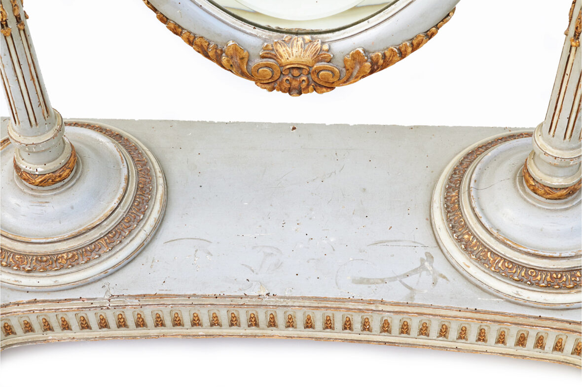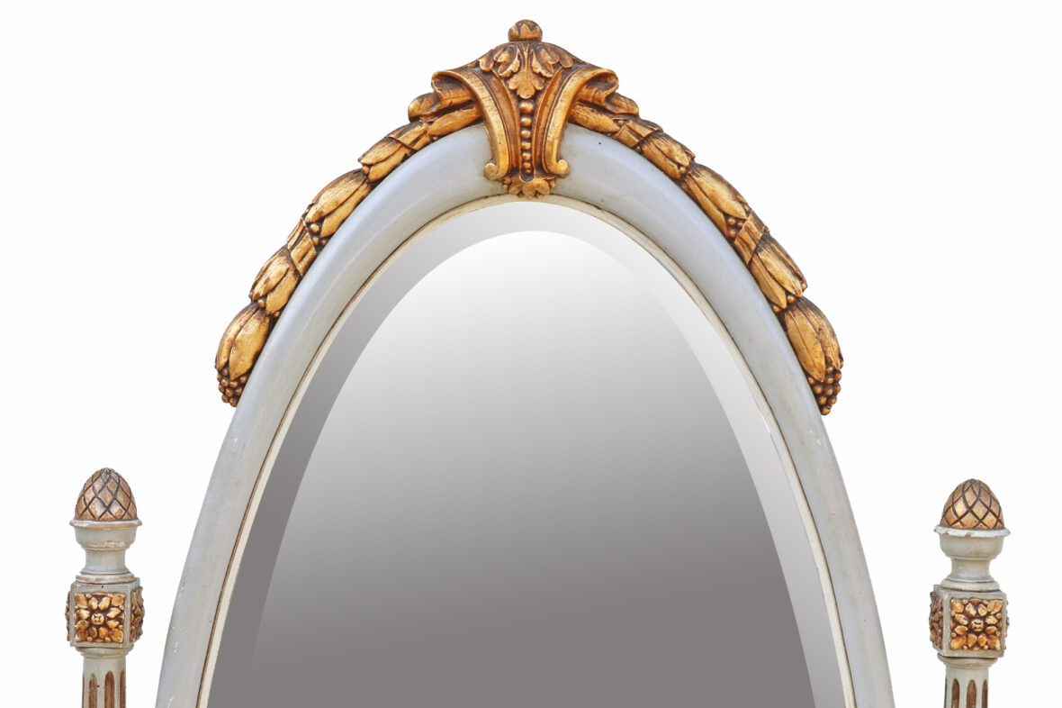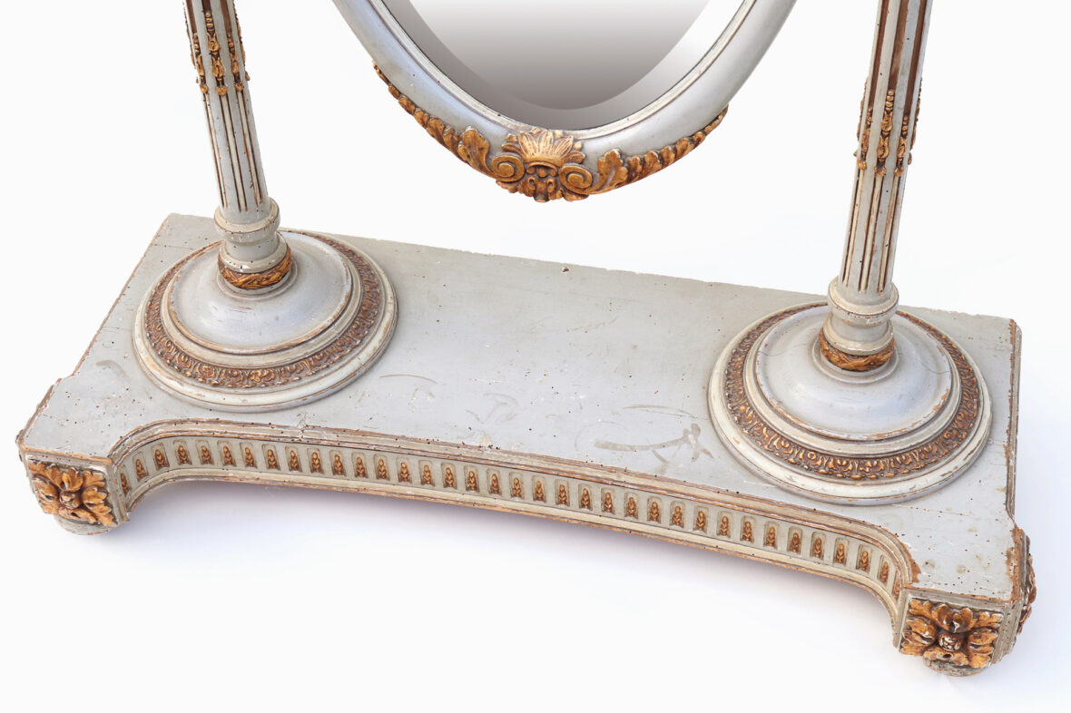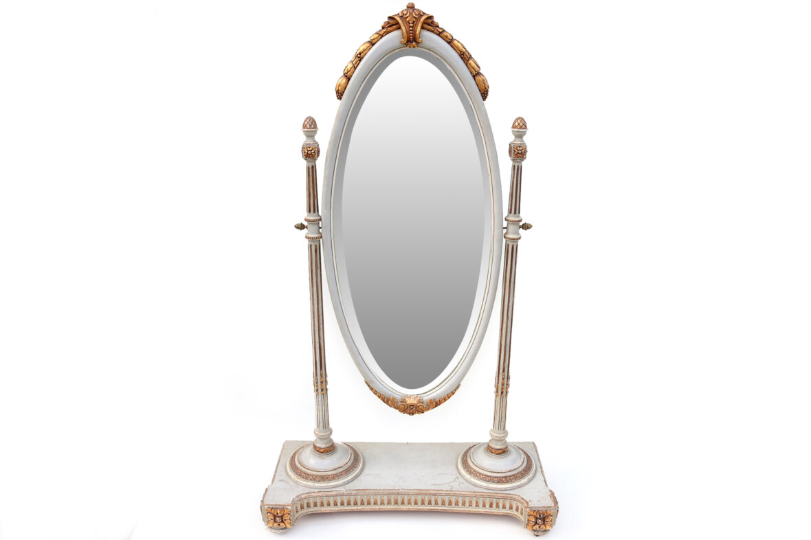 Grand miroir psyché en bois sculpté et laqué, le miroir ovale pivotant, les montants sculpté à décor de , reposant sur une base concave sur roues. Rehauts de dorure.