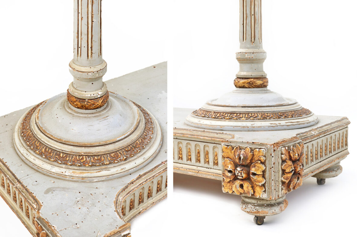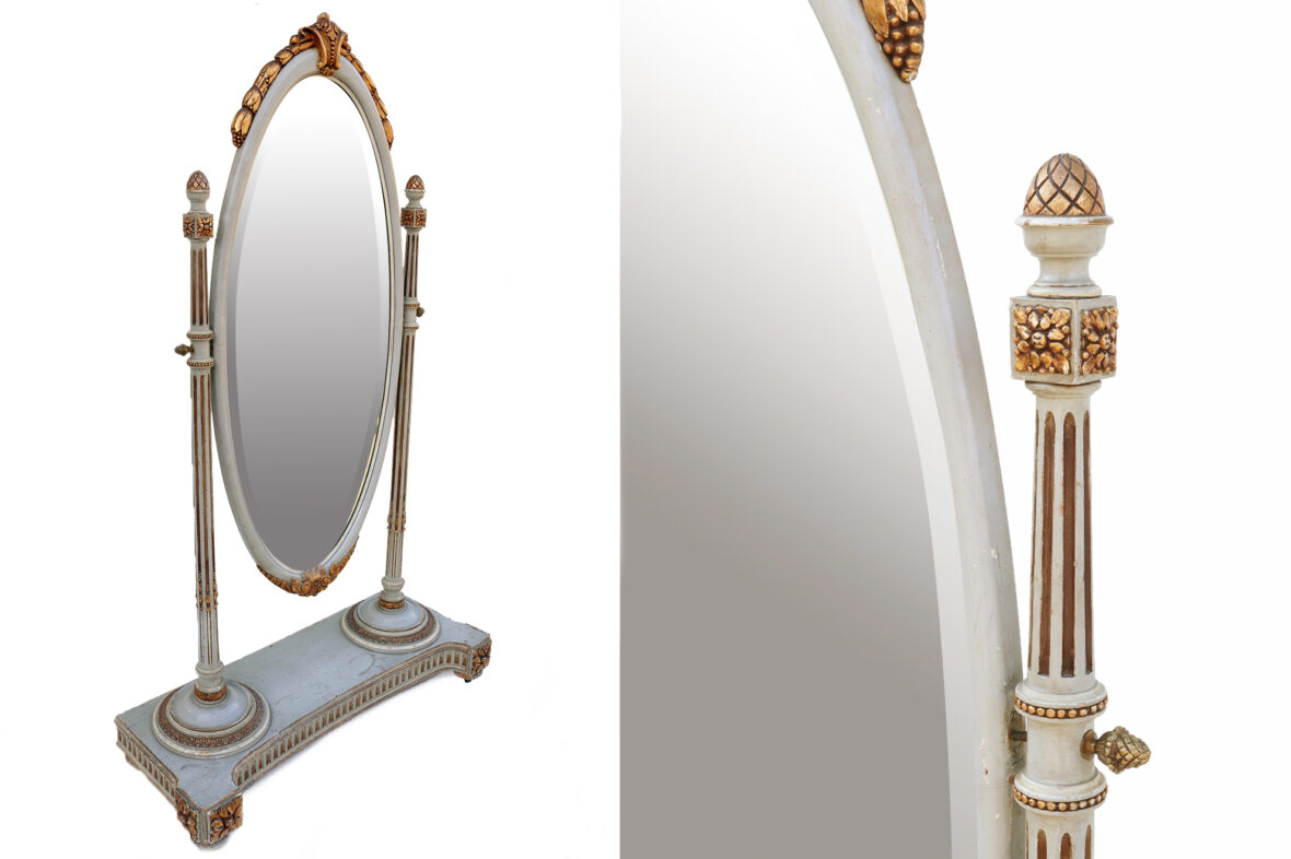 Grand miroir psyché en bois sculpté et laqué, le miroir ovale pivotant, les montants…