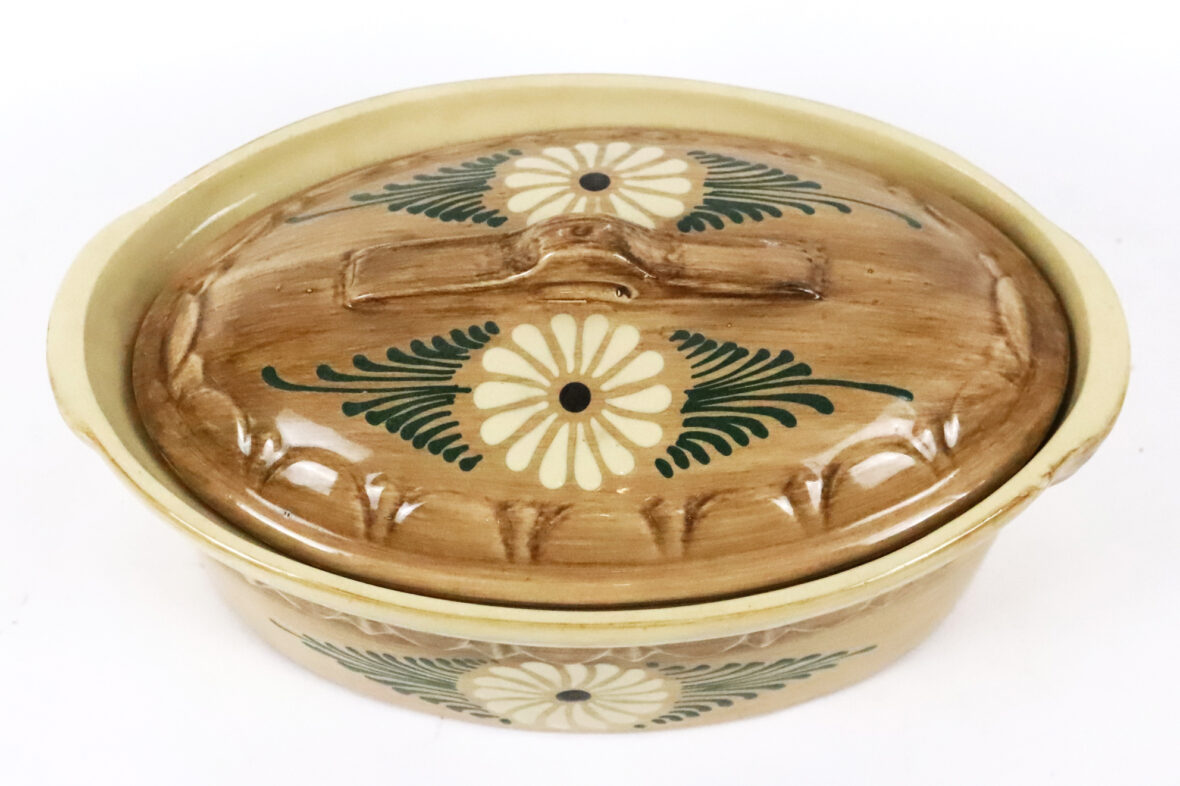 Grande terrine en céramique émaillée à décor peint de fleurs stylisées. Tamon creux BR sous la base.