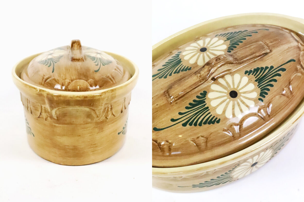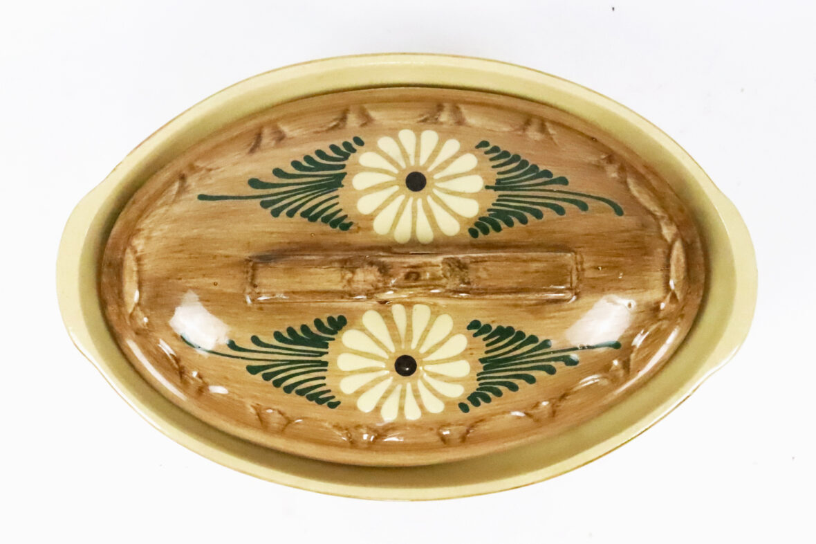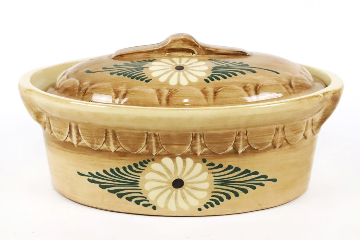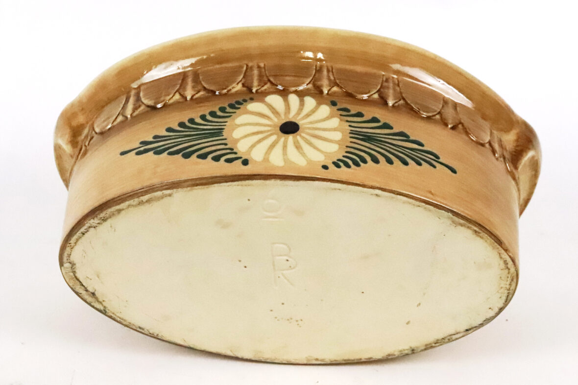 Grande terrine en céramique émaillée à décor peint de fleurs stylisées. Tampon creux BR sous la base.