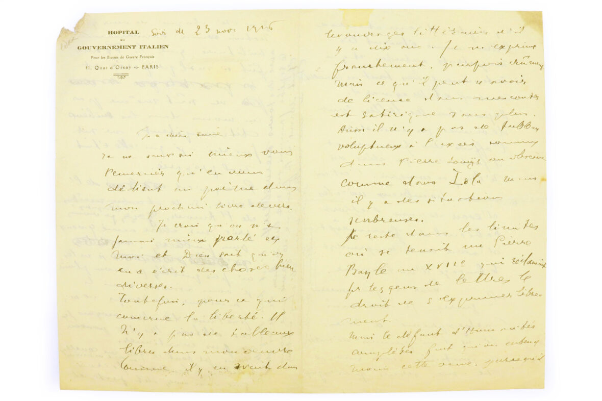 Quatre pages in-8° sur papier à en-tête de l’hôpital du Gouvernement Italien.