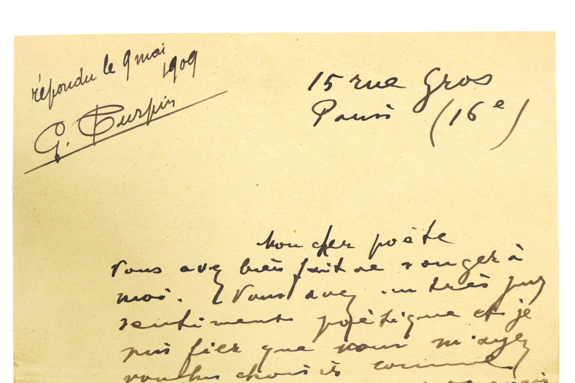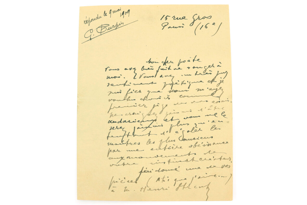 Vous avez bien fait de songer à moi. Vous avez un très pur sentiment poétique et je suis fier que vous m’ayez voulu choisir comme premier juge de vos essais. Ne craignez jamais d’être audacieux et vous ne le serez jamais plus qu’en tentant d’égaler les maitres les plus anciens par une entière obéissance aux mouvements de votre instinct créateur.