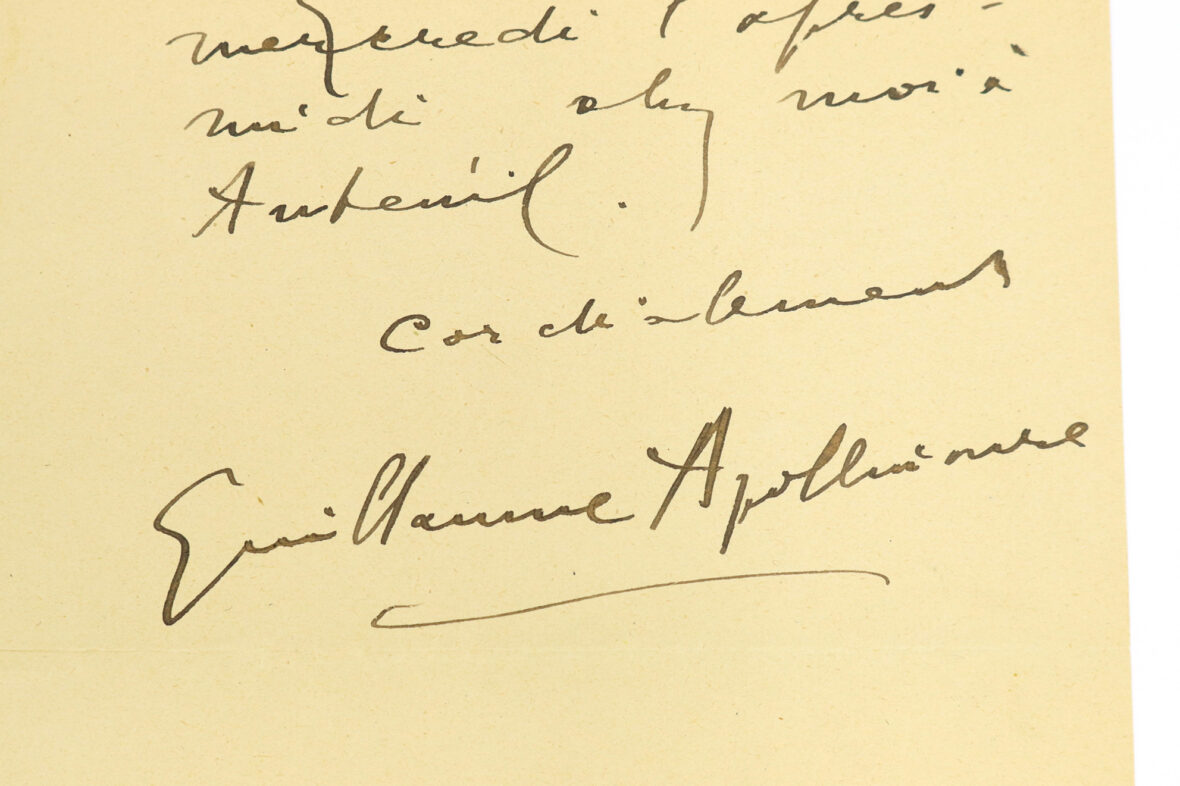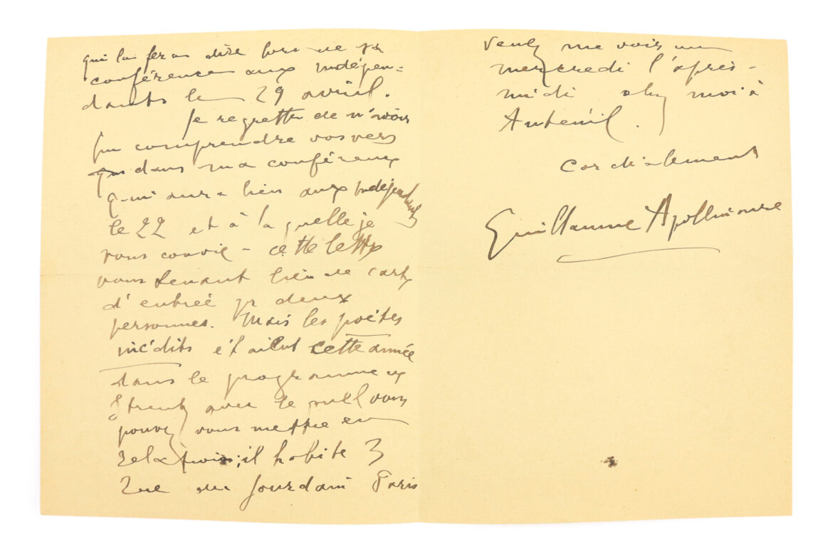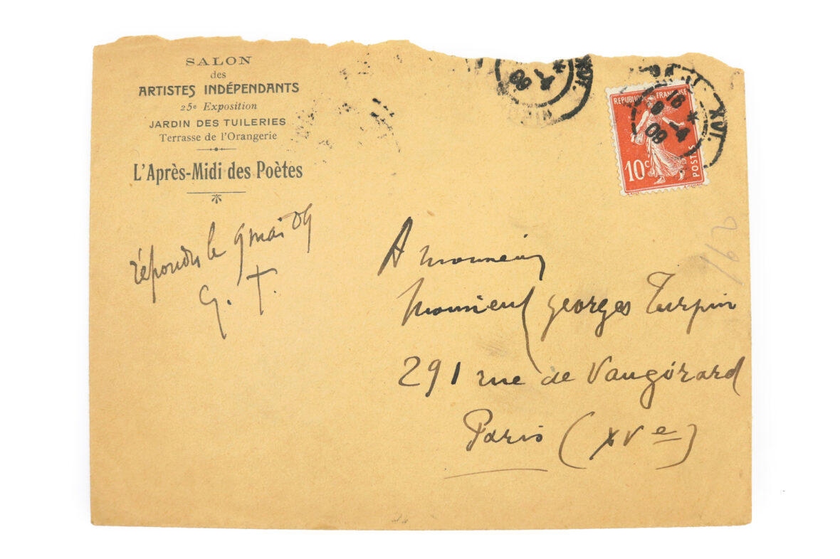Je regrette de n’avoir pu comprendre vos vers dans ma conférence qui aura lieu aux Indépendants le 22 et à laquelle je vous convie, cette lettre vous tenant lieu de carte d’entrée pour deux personnes. Mais les poètes inédits étaient cette année dans le programme de Strentz avec lequel vous pouvez vous mettre en relation : il habite 3 rue du Jourdain Paris. Venez me voir un mercredi l’après-midi chez moi à Auteuil.