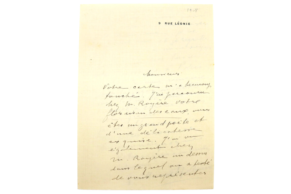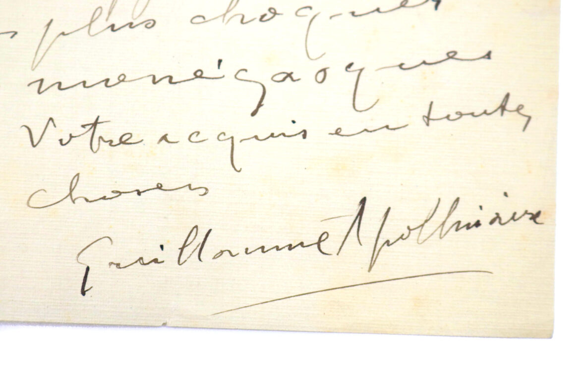 Il regrette de ne l’avoir pas rencontré à Paris et le remercie : pour la façon aimable avec laquelle vous me conviez à écrire dans votre revue. Je m’efforcerai de ne plus choquer les Monégasques. Votre acquis en toutes choses. Guillaume Apollinaire.