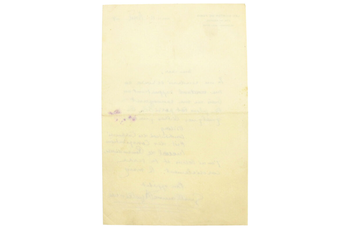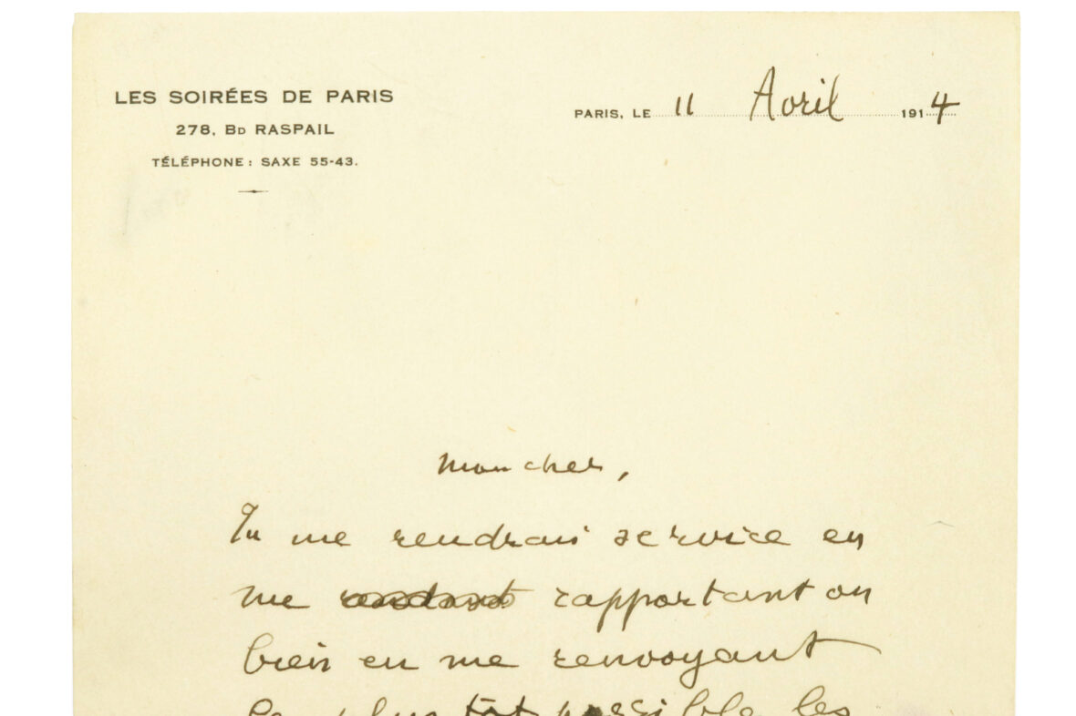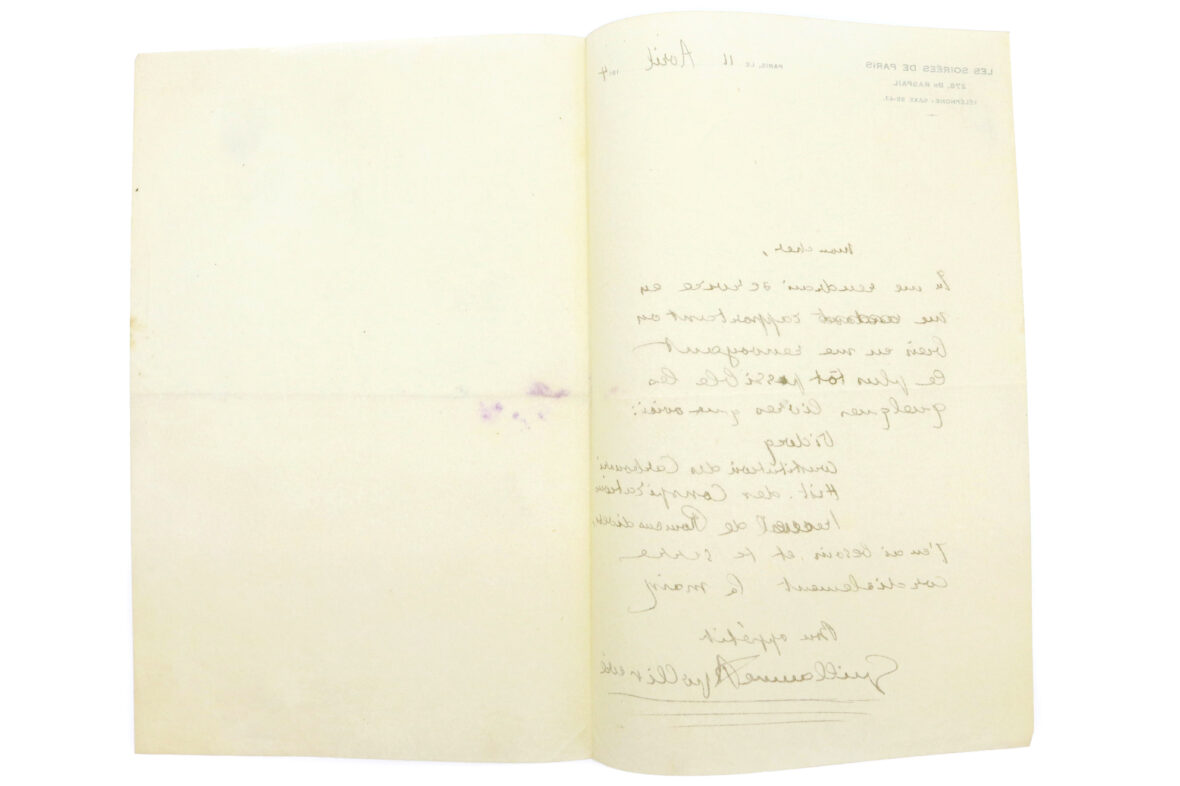 Une page in-8° sur papier à en-tête des Soirées de Paris.