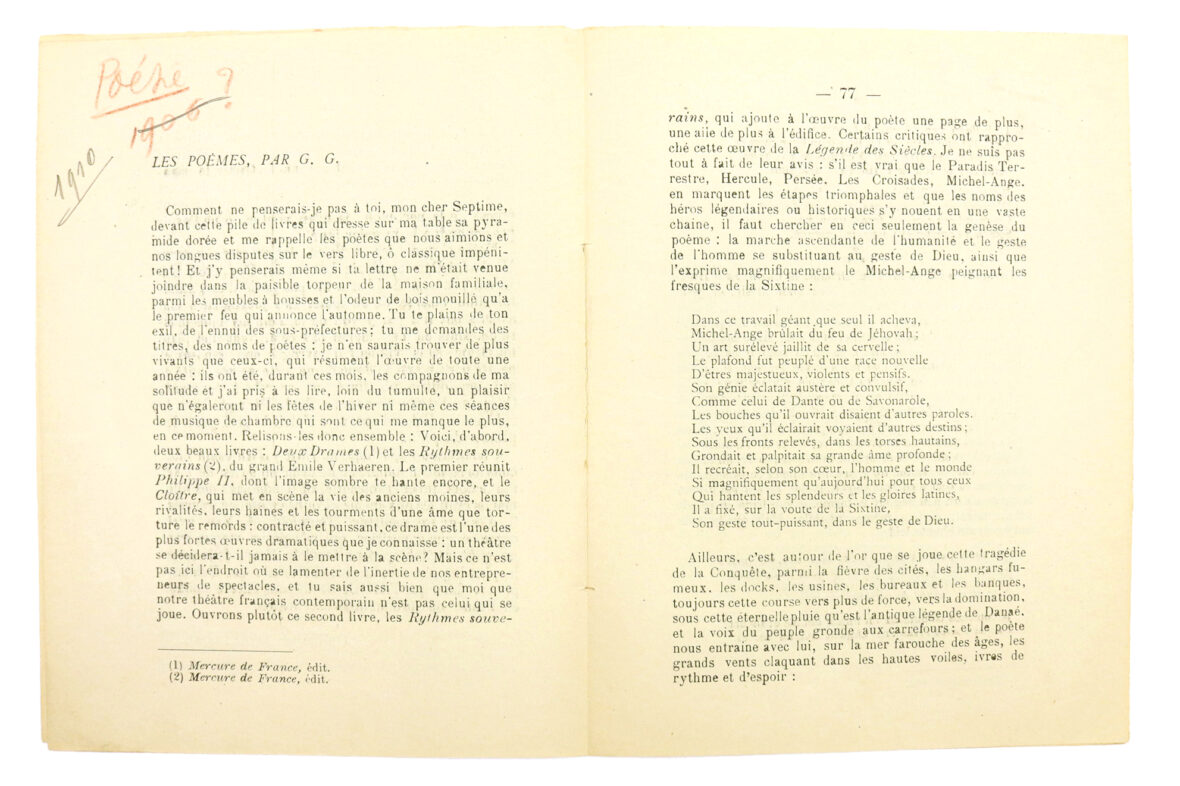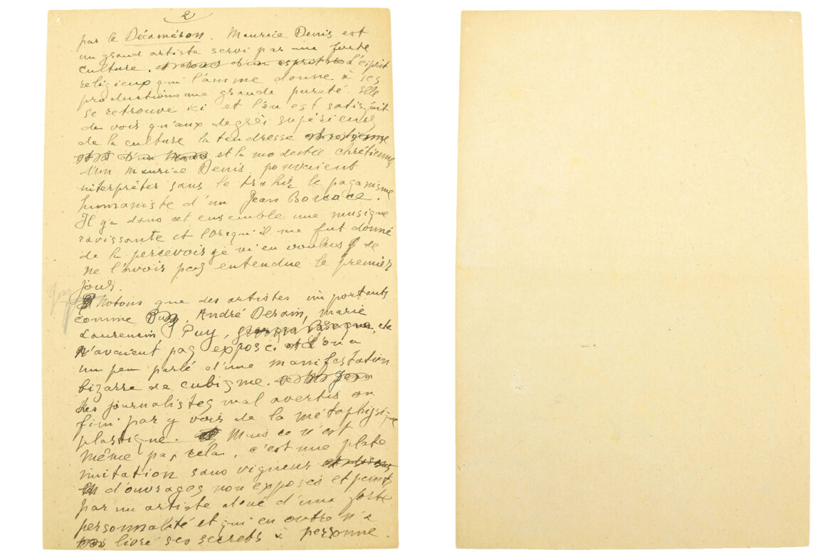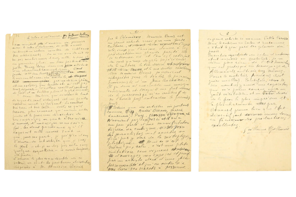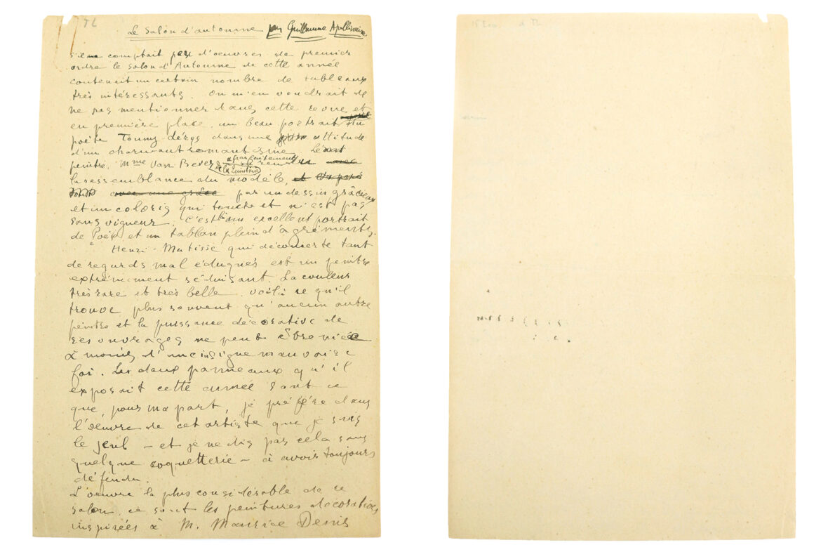 Extraordinaire manuscrit, en premier jet, de cette critique artistique du Salon d’automne de 1910 qui se tint au Grand Palais du 1er octobre au 8 novembre 1910.