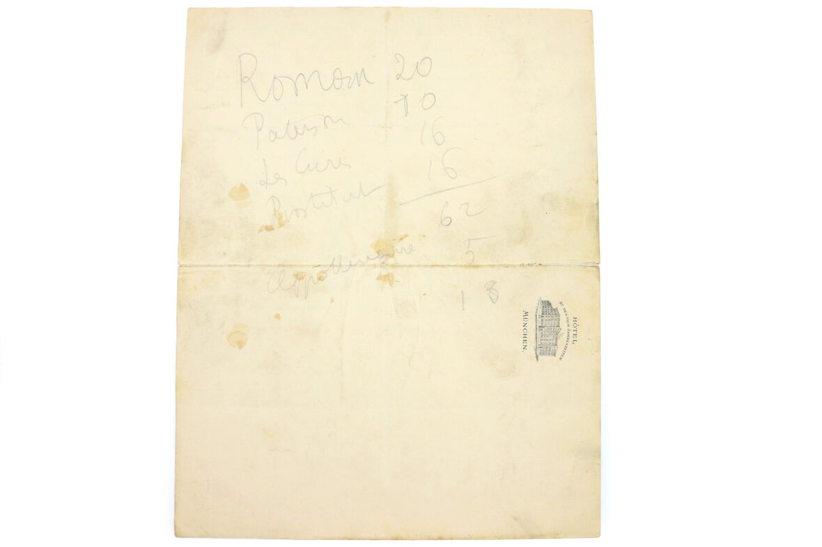 Onze pages grand in-4° aux versos de feuillets aux en-têtes d’hôtelleries allemandes.