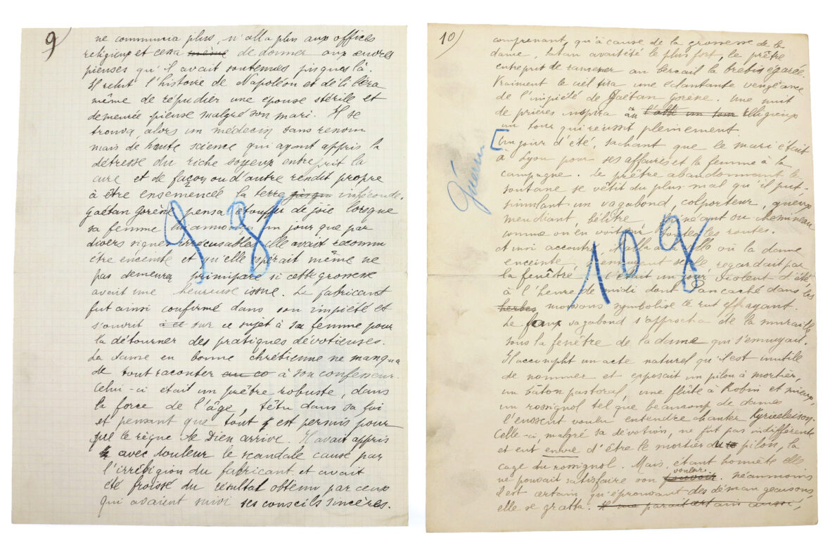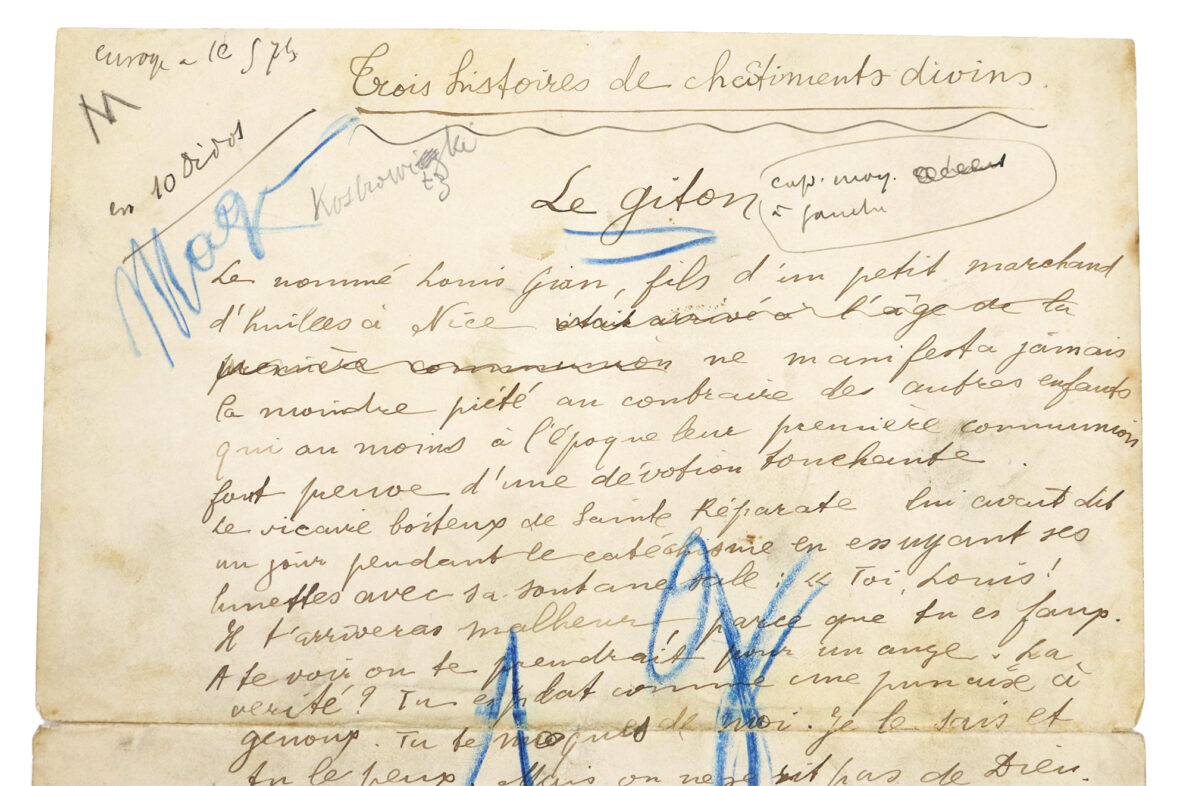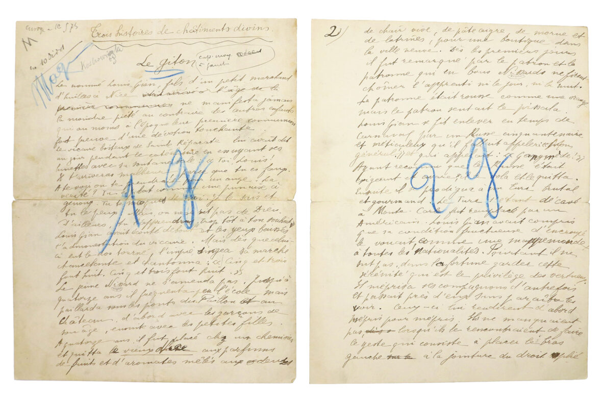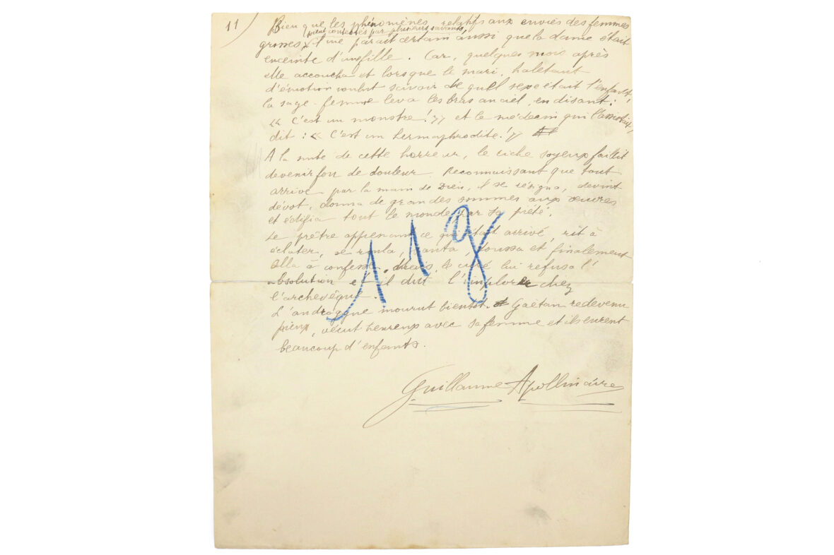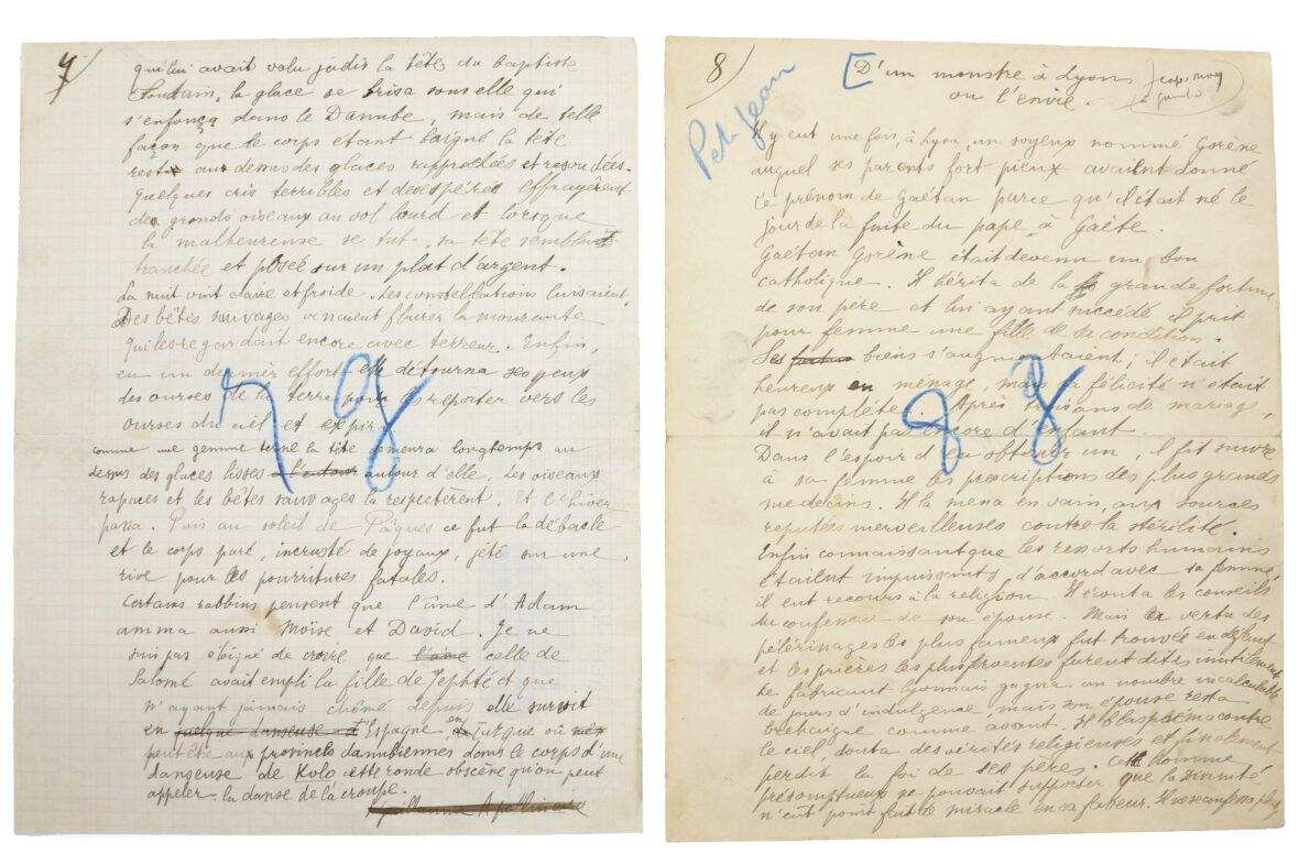 Précieux manuscrit, avec ratures et corrections, de ces « Trois histoires de châtiments divins » publiées dans la Revue Blanche en octobre 1902 : « Le Giton », « La Danseuse » et « D’un monstre à Lyon ou l’envie ». L’année 1902 marque l’apparition, en mars, du pseudonyme de « Guillaume Apollinaire ».