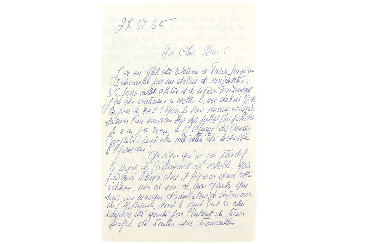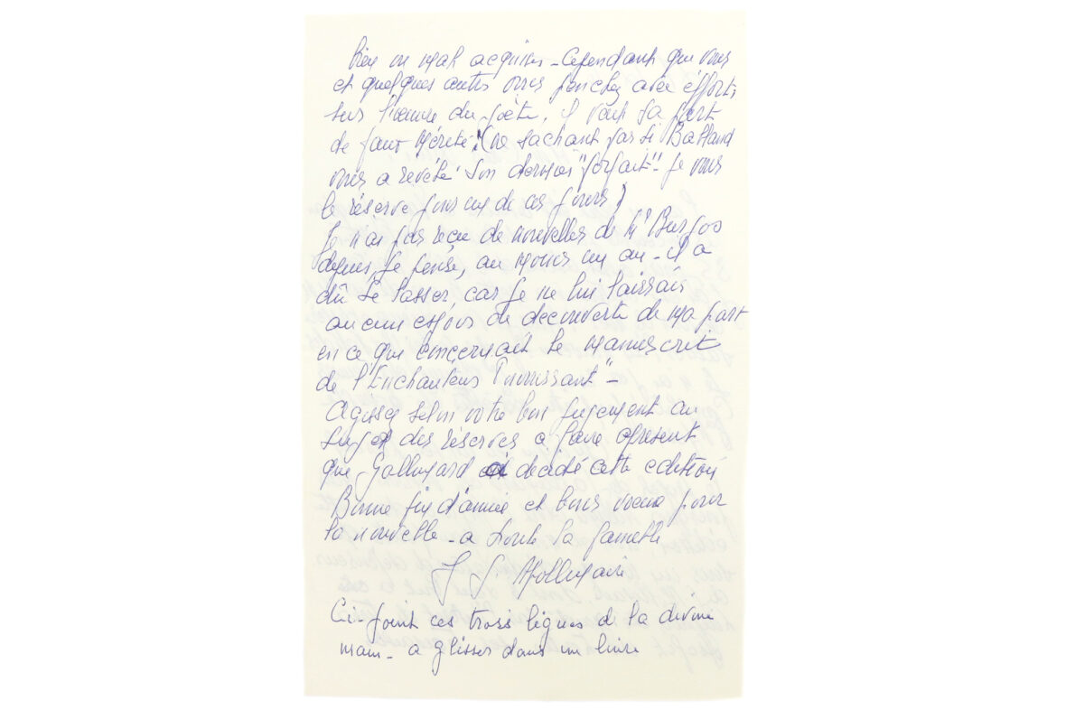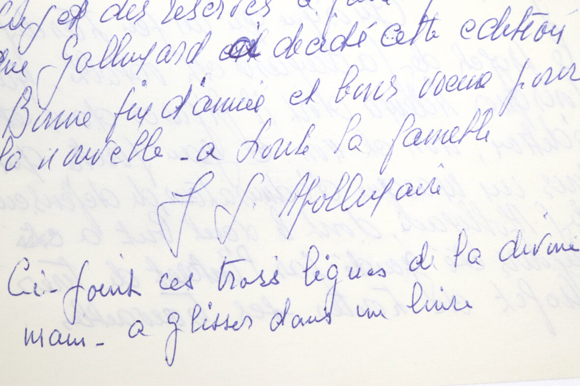Nous joignons la lettre de J. Apollinaire à M. Décaudin critiquant un projet d’édition de Gallimard et offrant le mot d’Apollinaire à son correspondant : Ci-joint ces trois lignes de la divine main. A glisser dans un livre.