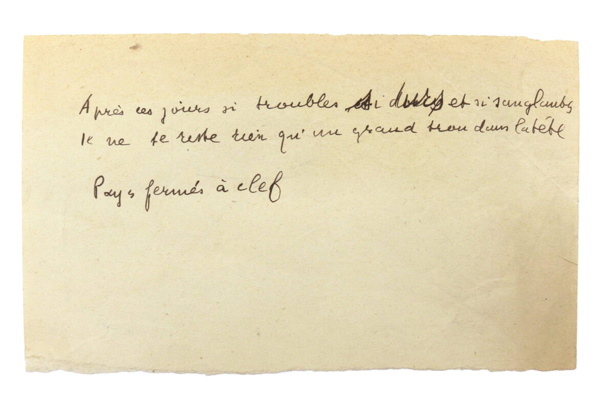 Émouvant distique du poète offert par son épouse Jacqueline Apollinaire à Michel Décaudin en 1965. Nul besoin de rappeler la blessure d’Apollinaire par éclat d’obus, en mars 1916.