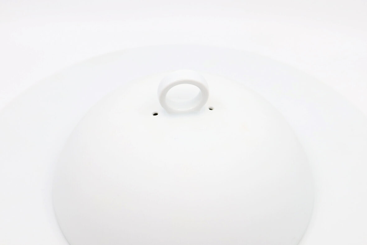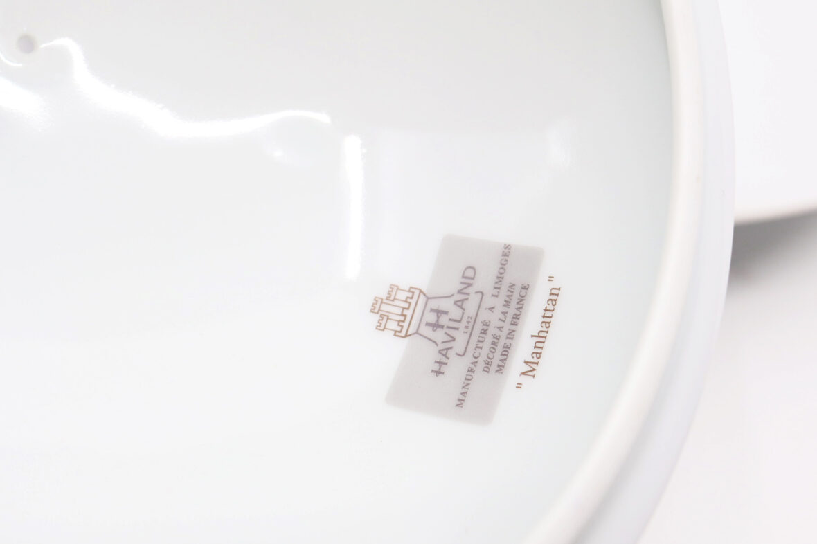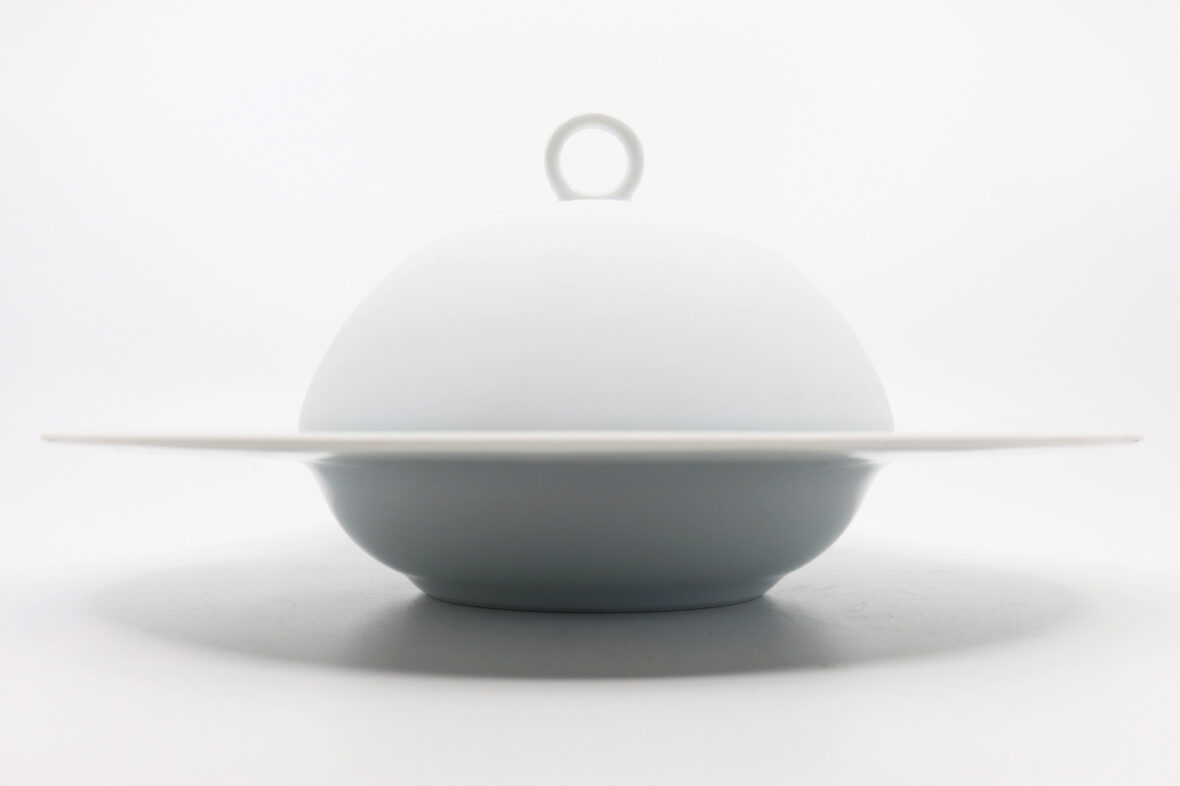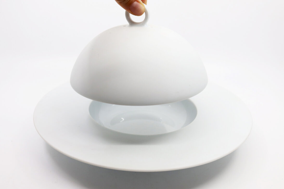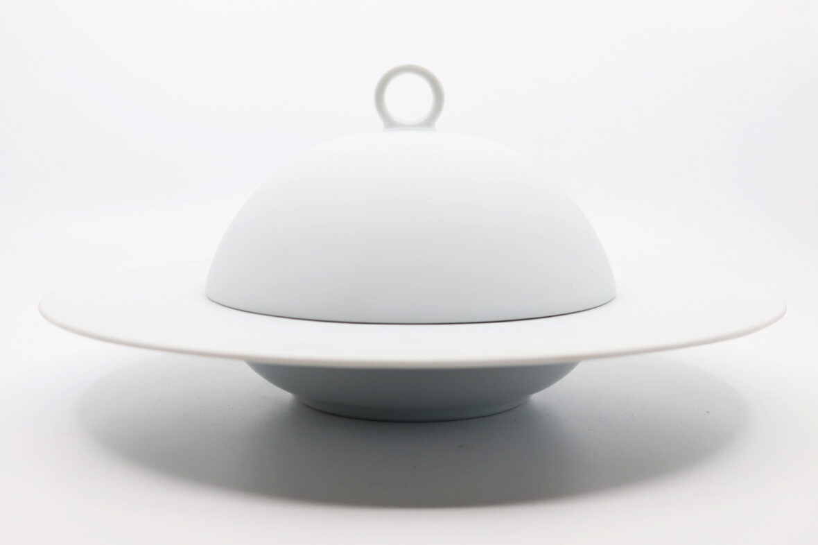 Asssiette creuse et sa cloche de présentation en porcelaine blanche, modèle « Manhattan ».