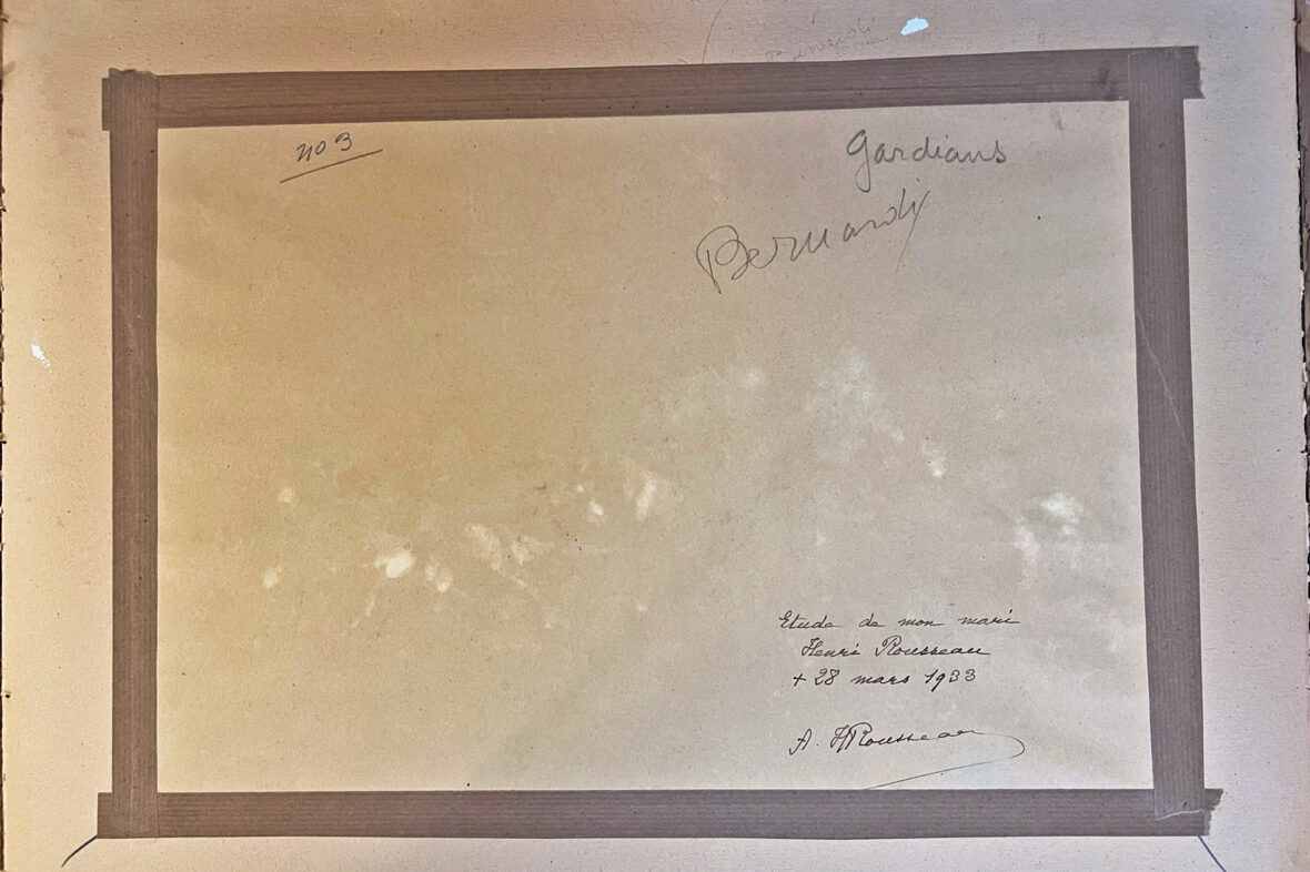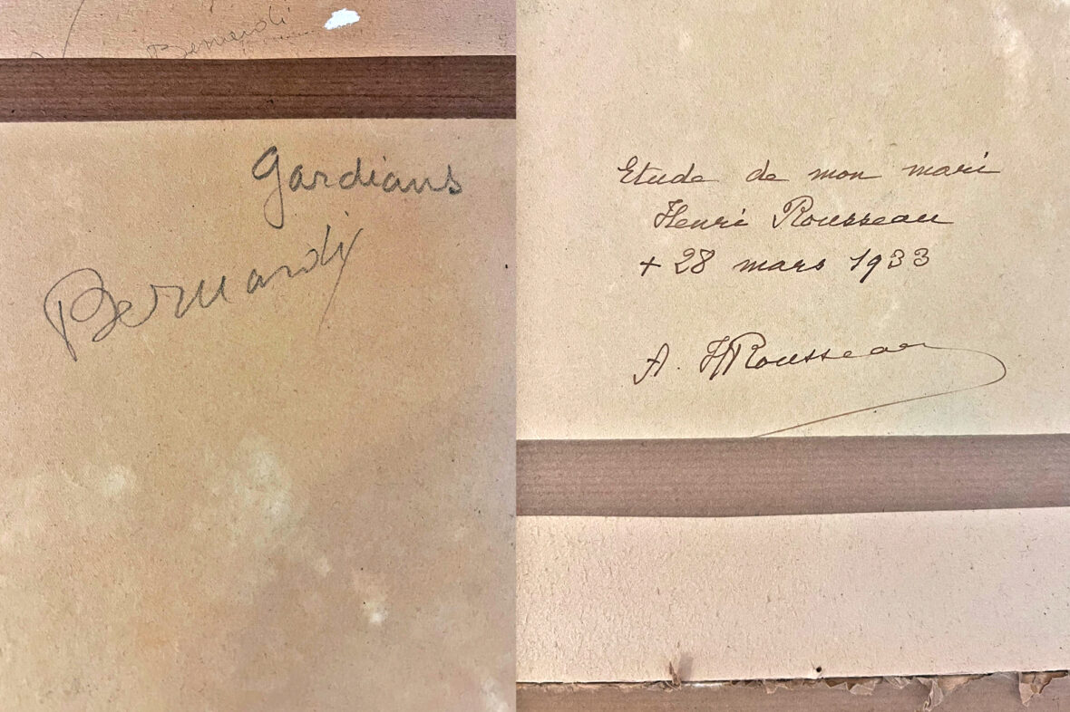 Au dos, en bas à droite, un certificat d’authenticité signé par la veuve du peintre, Madame Alice Rousseau et justifiant : « Etude de mon mari Henri Rousseau – Mort 28 mars 1933 « .